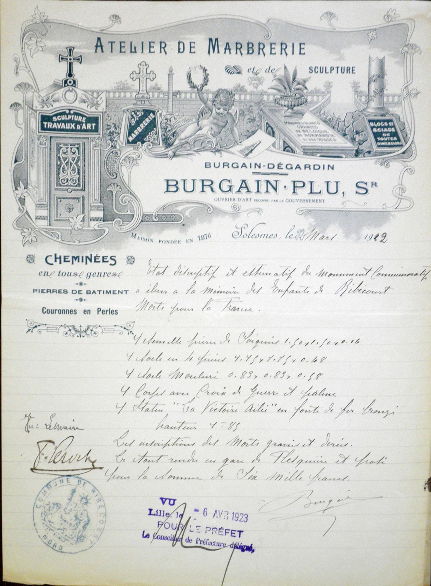 Devis descriptif et estimatif et marché de gré à gré établi ave M. Burgaun, sculpteur à Solesmes