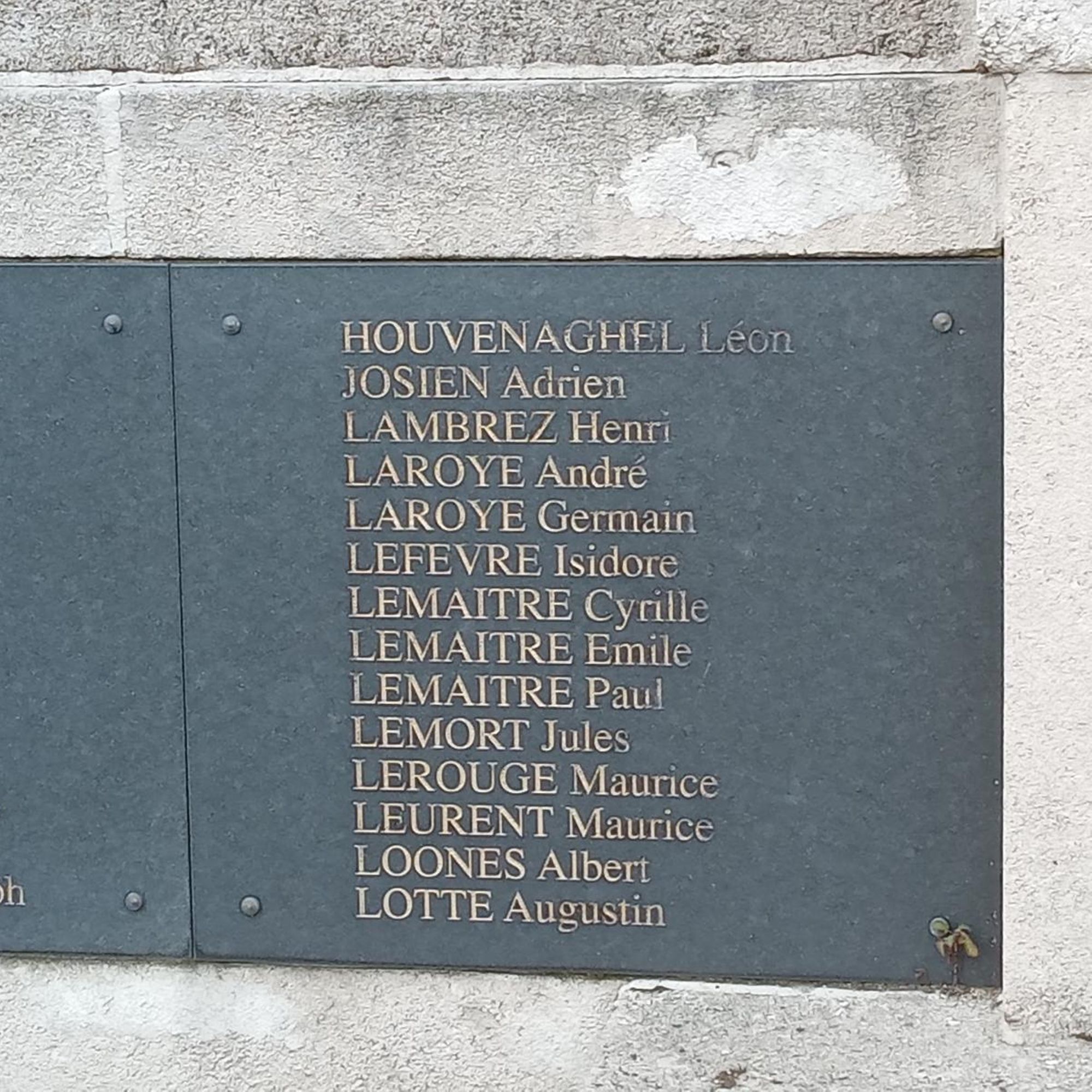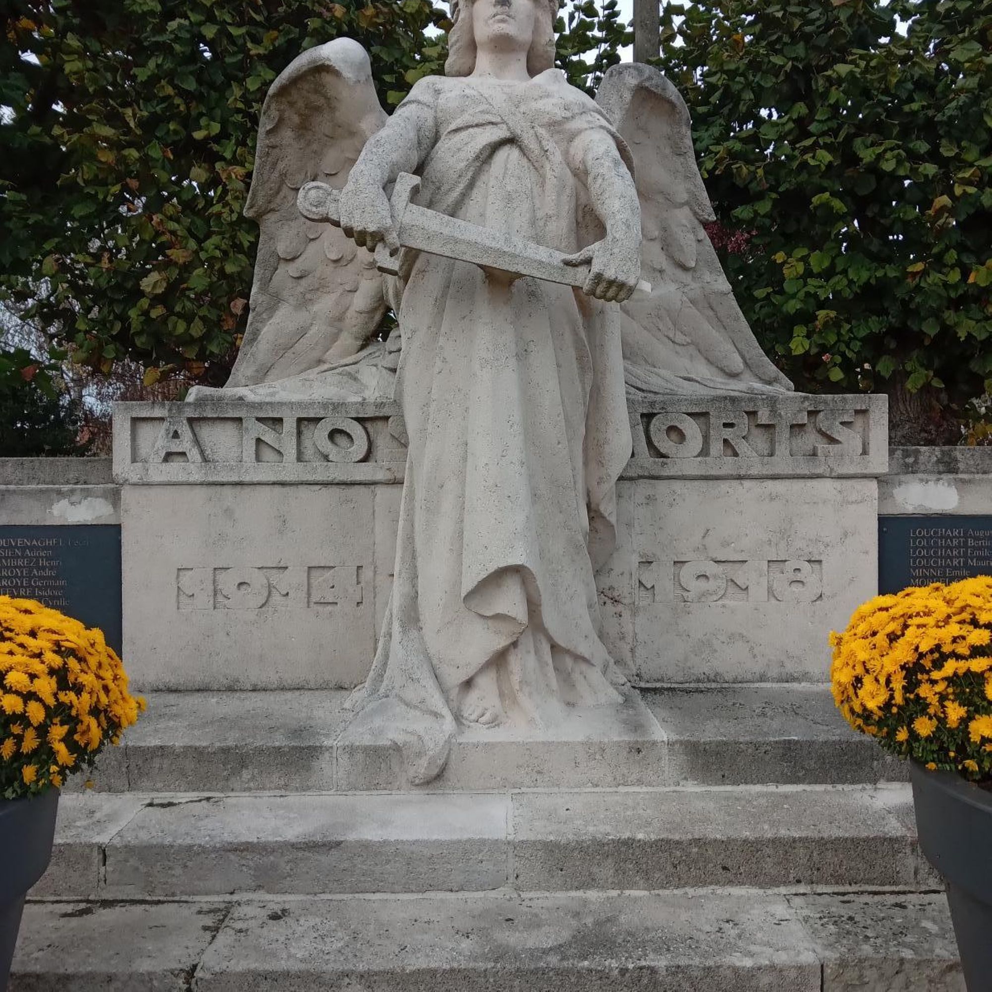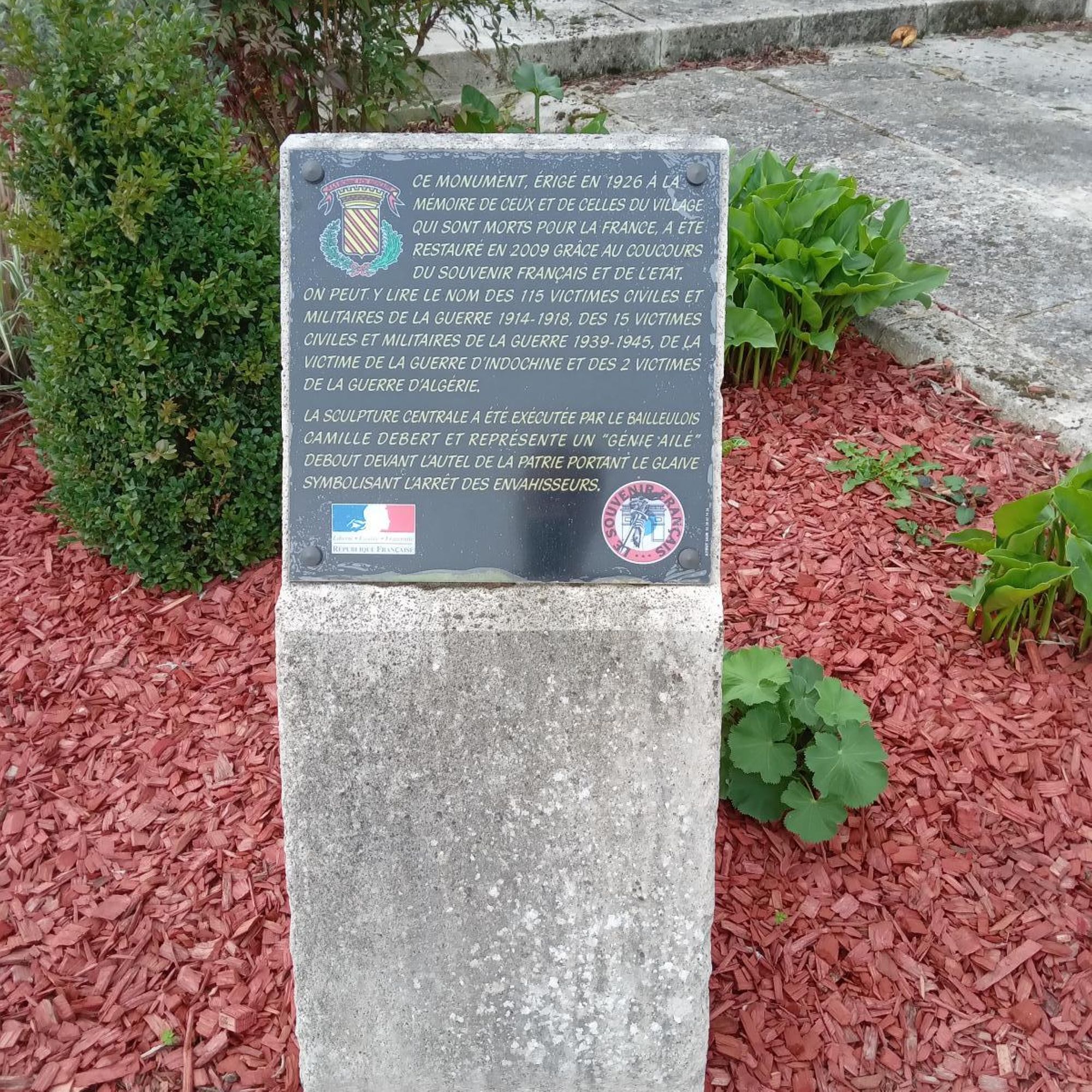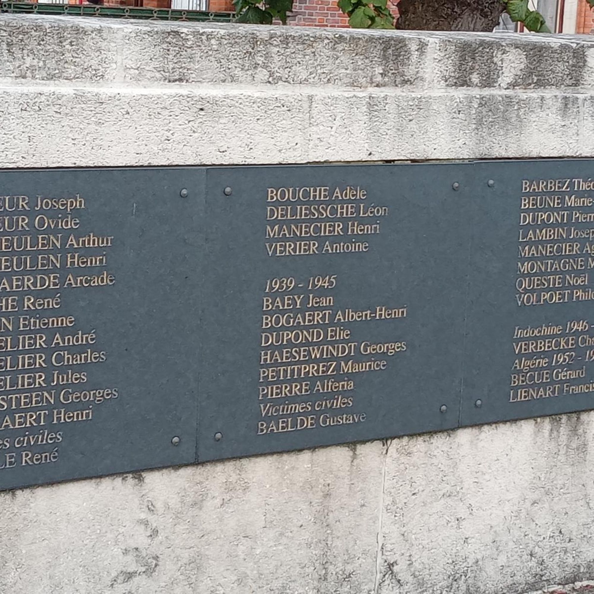 - 1. d’un socle sur le devant duquel on peut lire l’inscription sculptée « A nos morts » ainsi que les noms des 109 victimes militaires, des 6 victimes civiles de la guerre 1914-1918, des 15 victimes civiles et militaires de la guerre 1939-1945, de la victime de la guerre d’Indochine et des 2 victimes de la guerre d’Algérie.