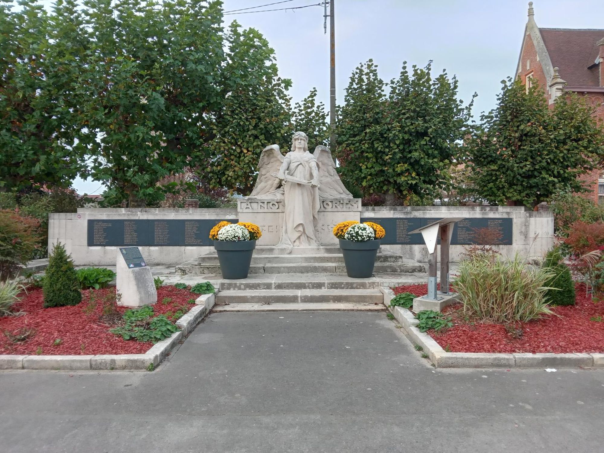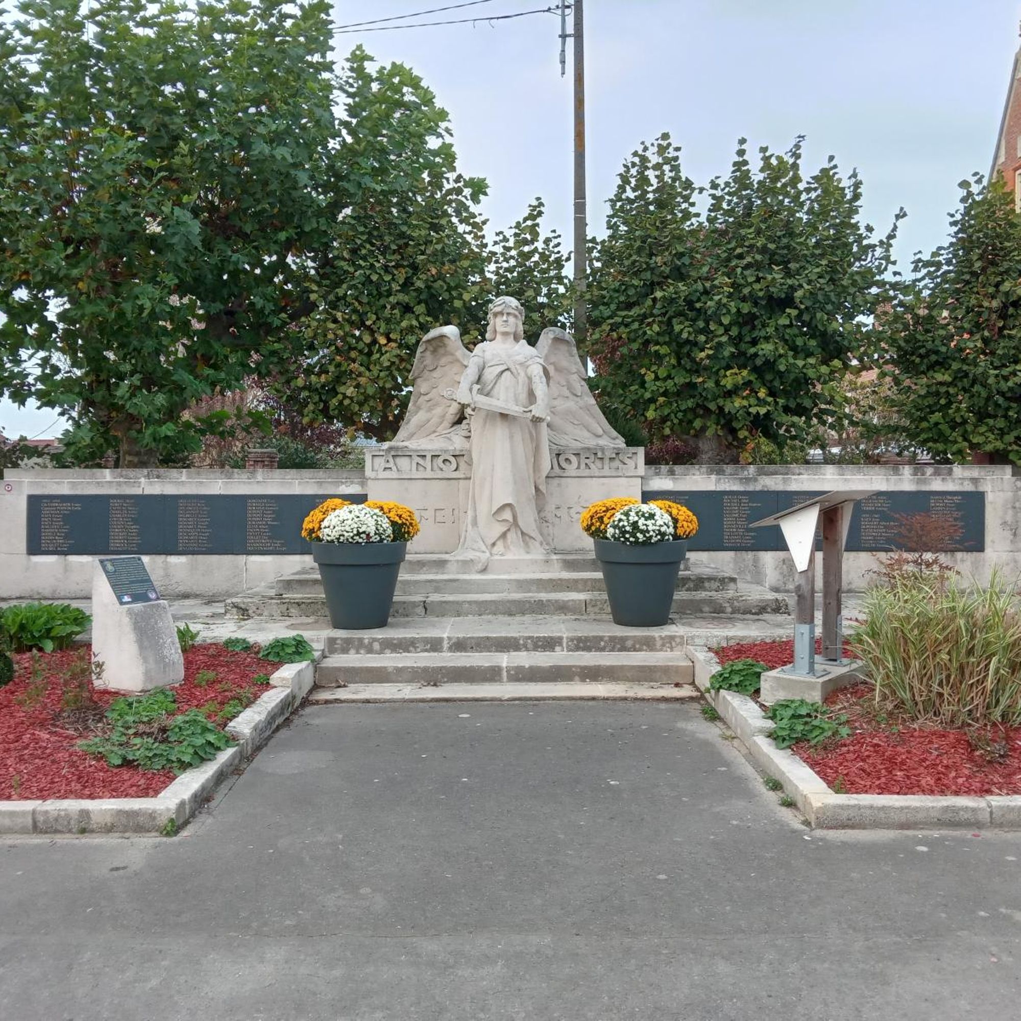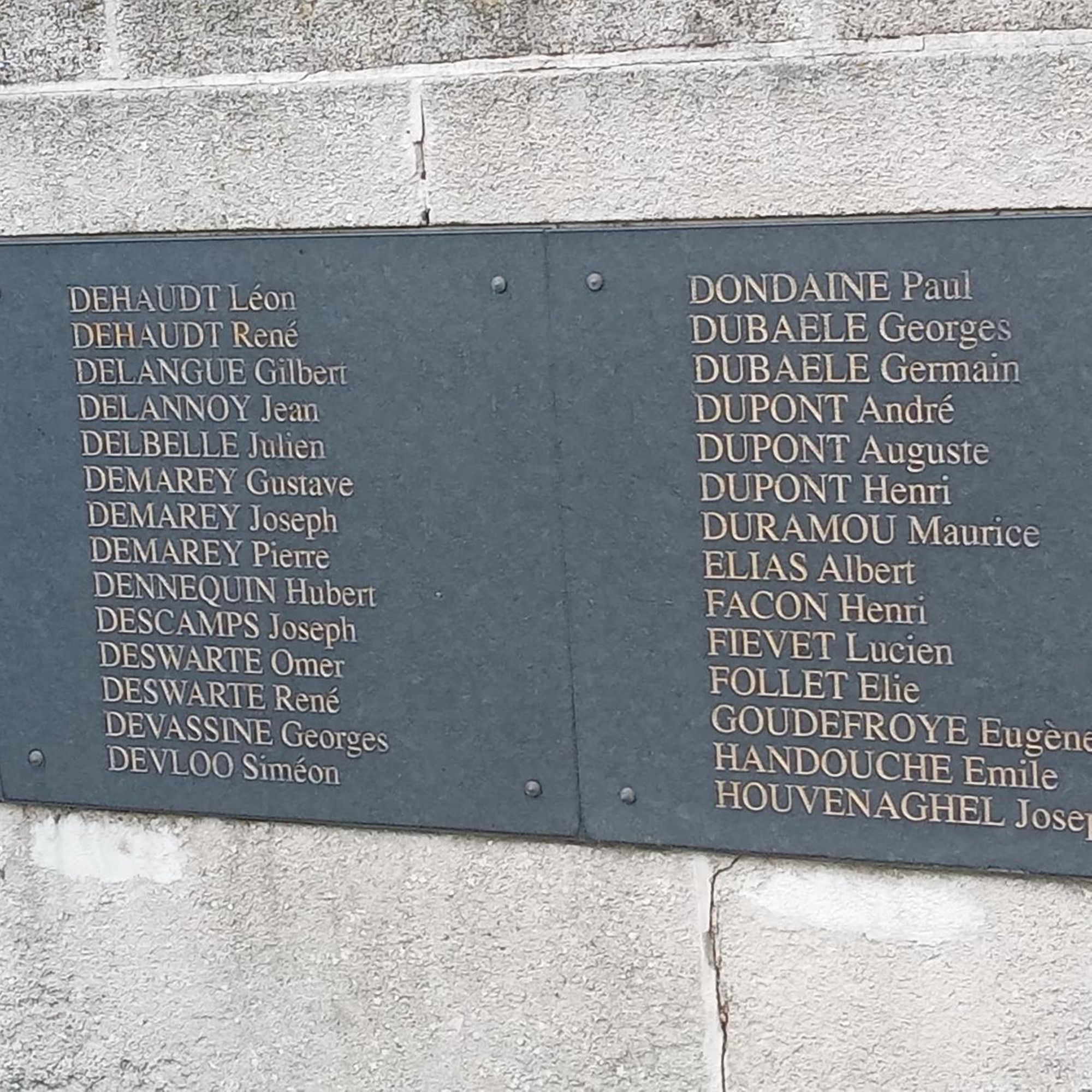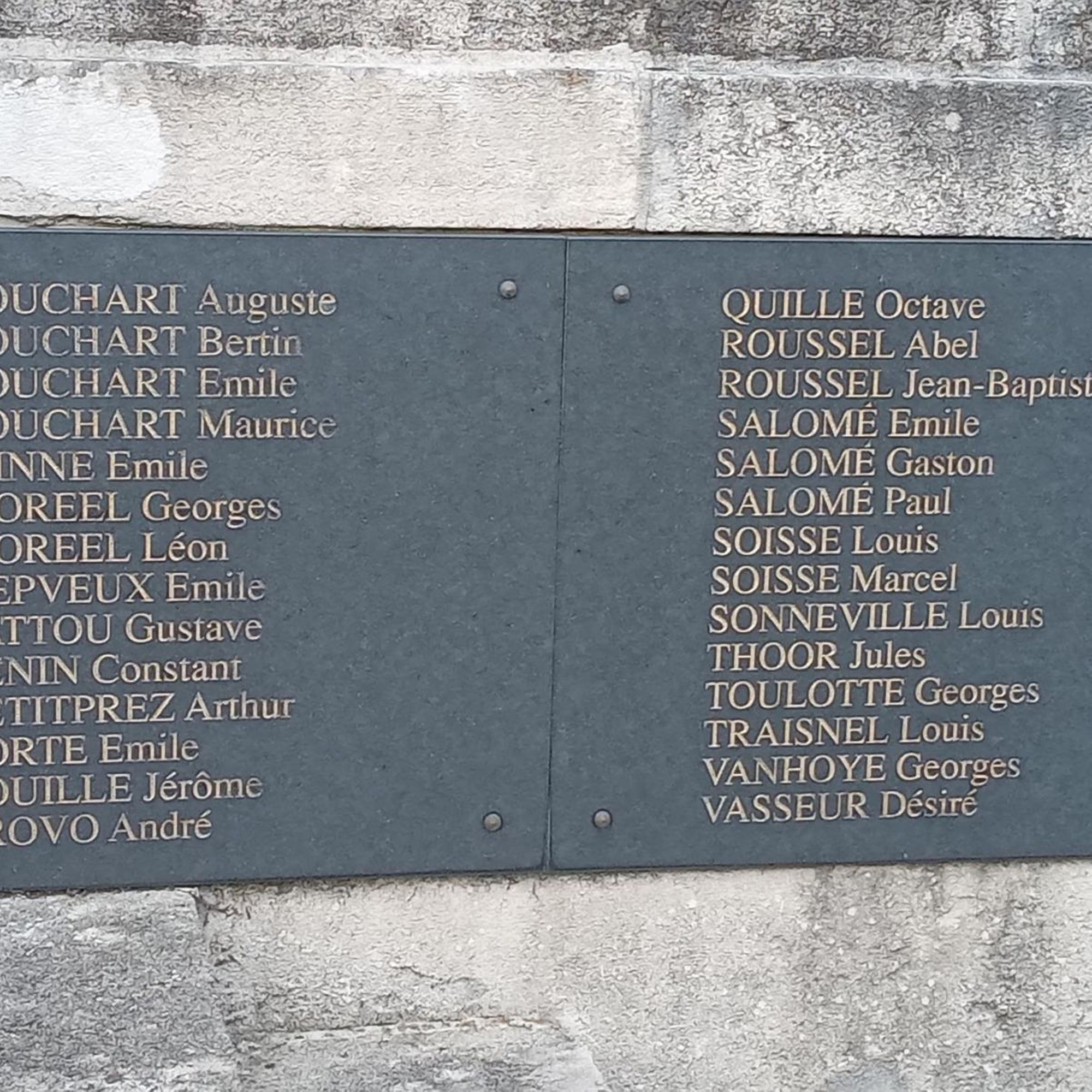 - 1. d’un socle sur le devant duquel on peut lire l’inscription sculptée « A nos morts » ainsi que les noms des 109 victimes militaires, des 6 victimes civiles de la guerre 1914-1918, des 15 victimes civiles et militaires de la guerre 1939-1945, de la victime de la guerre d’Indochine et des 2 victimes de la guerre d’Algérie.