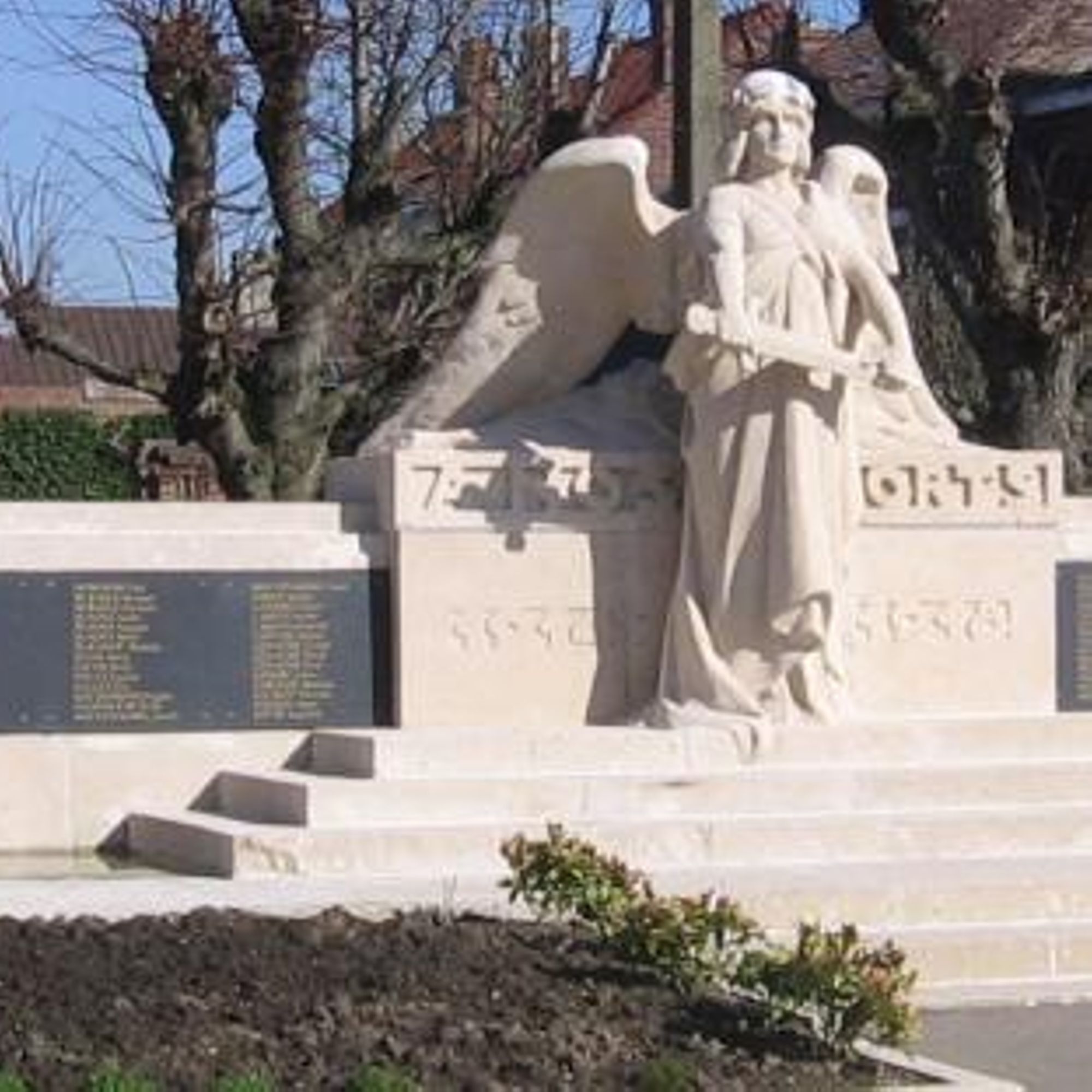- 2. d’une sculpture centrale surmontant le socle exécutée par le bailleulois Camille DEBERT d’après une maquette proposée par le Comité et le Conseil Municipal représentant un « Génie Ailé » debout devant l’autel de la Patrie portant le glaive symbolisant l’arrêt des envahisseurs.