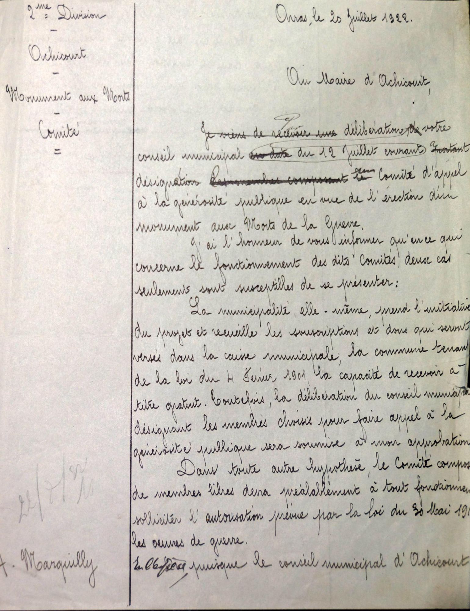À vous M. le curé d’Achicourt, qui n’avez jamais rien négligé pour honorer nos morts et qui avait voulu que leurs noms à jamais glorieux fussent inscrits sur un véritable chef-d’œuvre dans notre église paroissiale. À toutes les sociétés locales. Cette cérémonie est le splendide prélude de la grandiose manifestation qui va se dérouler après-midi, au pied de ce monument.