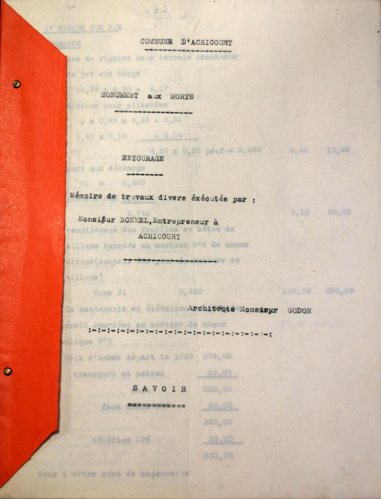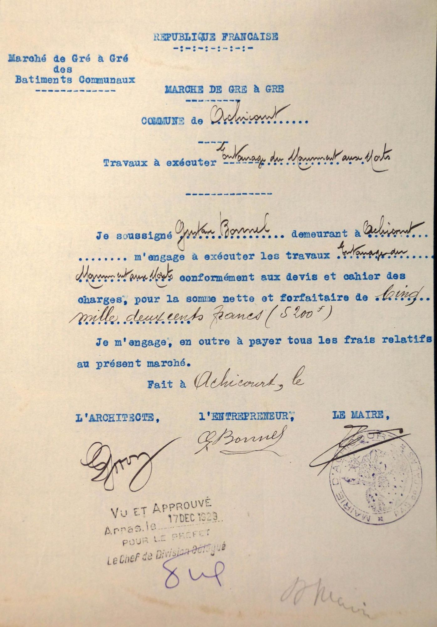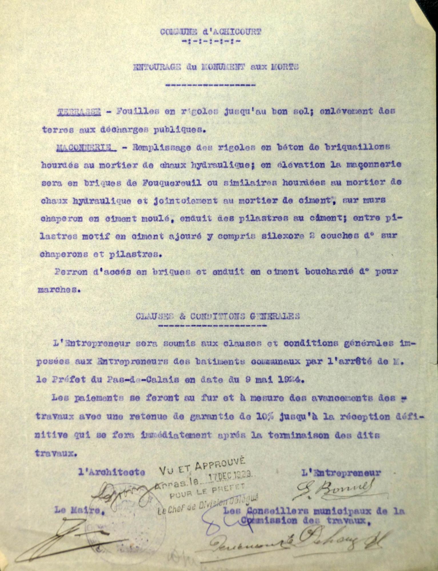 Gustave BONNEL demeurant à Achicourt m'engage à exécuter les travaux Entourage du Monument aux Morts