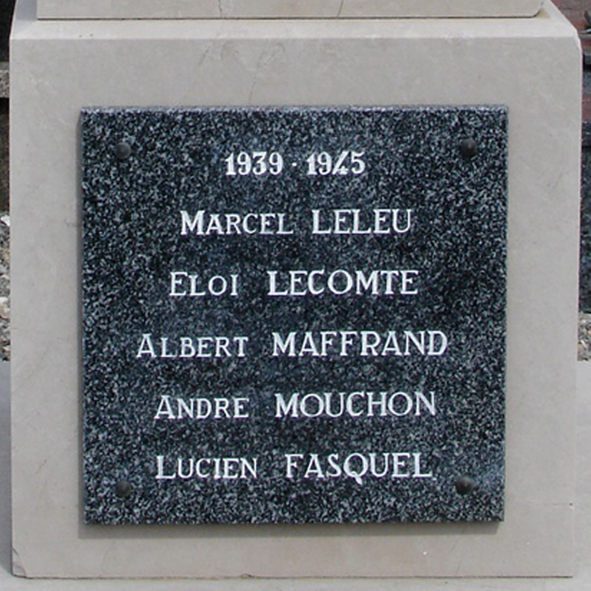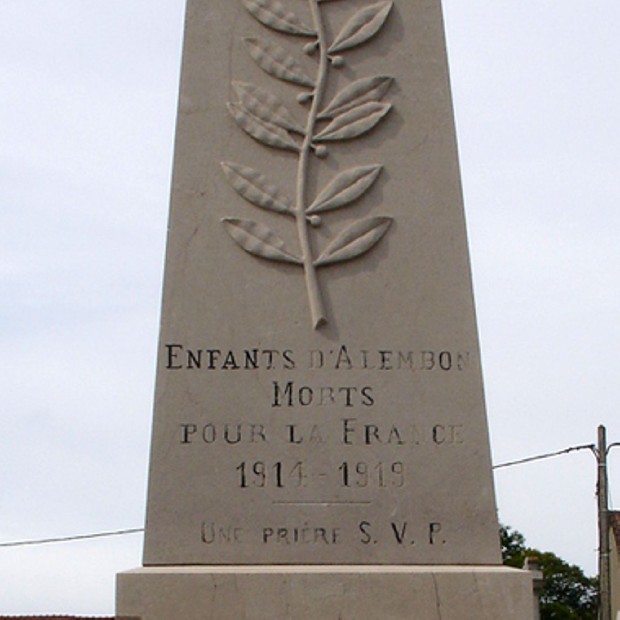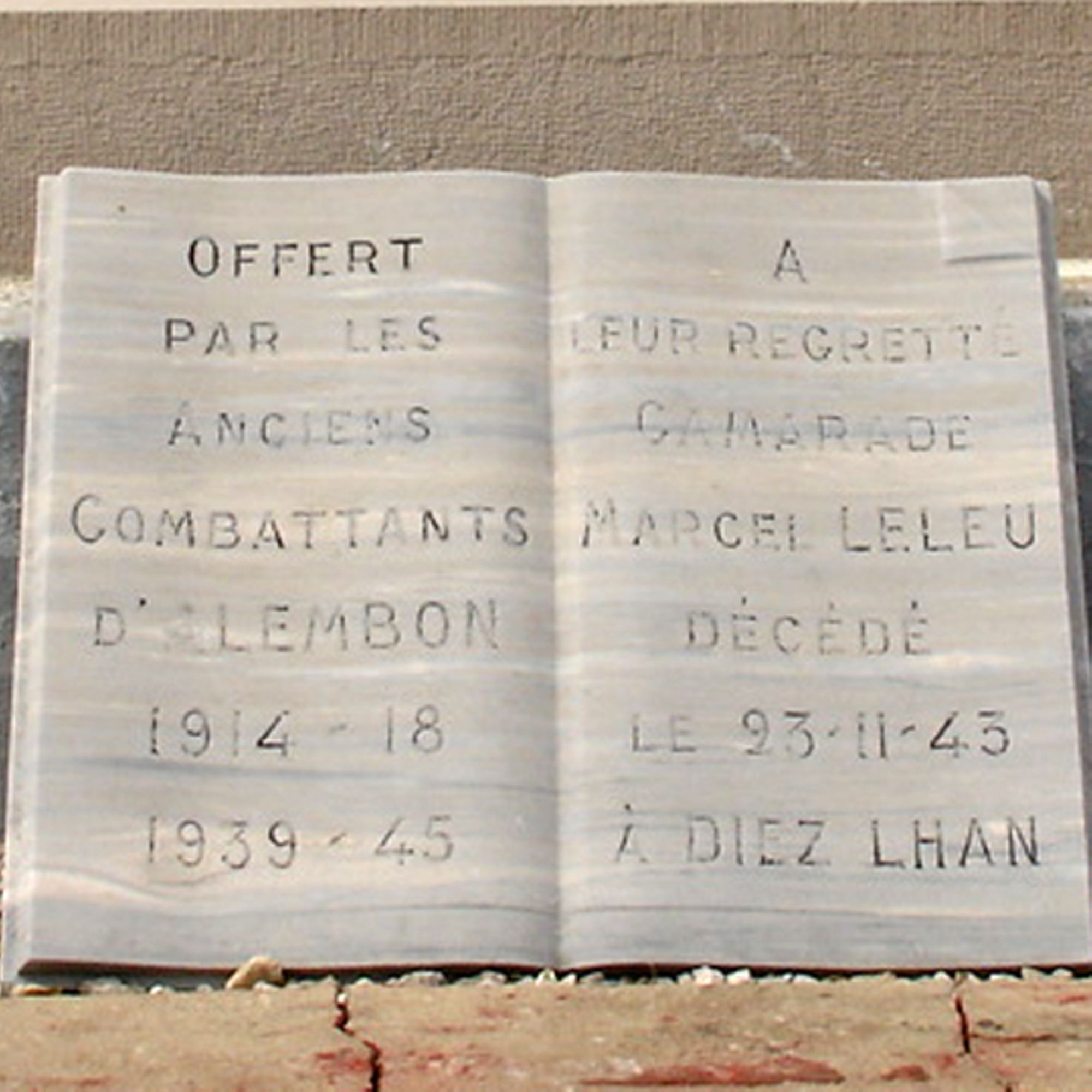 Une plaque en forme de livre ouvert - Offert par les Anciens Combattants d'Alembon 1914-1918 - À leur regretté camarade Marcel LELEU décédé le 23-11-43 à Diez Lhan
