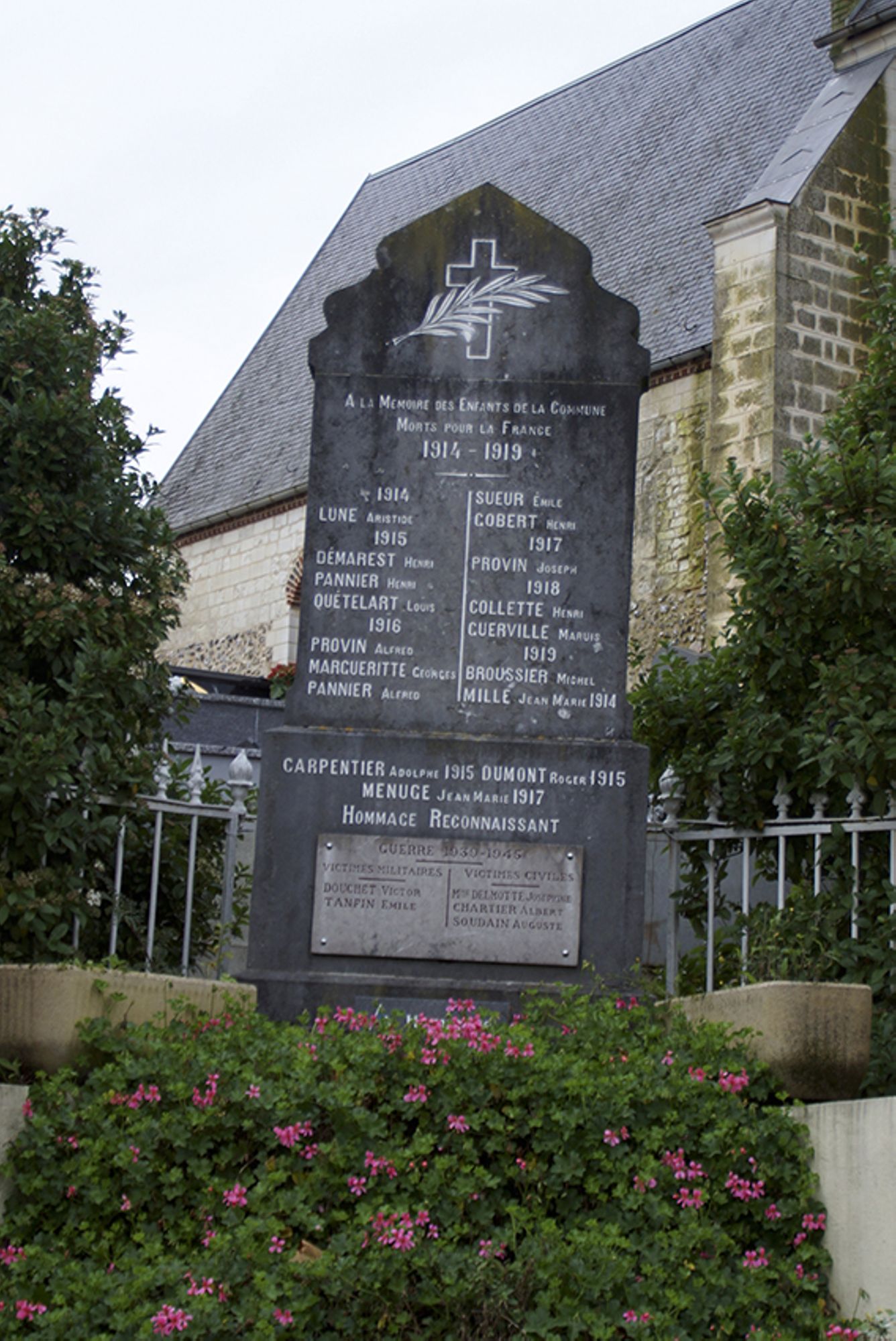 C'est une stèle très simple d'aspect, érigée sur un promontoire de quatre marches Sur ce monument on voit la liste des morts de la commune, surmontée par une Croix chrétienne traversée par une Palme