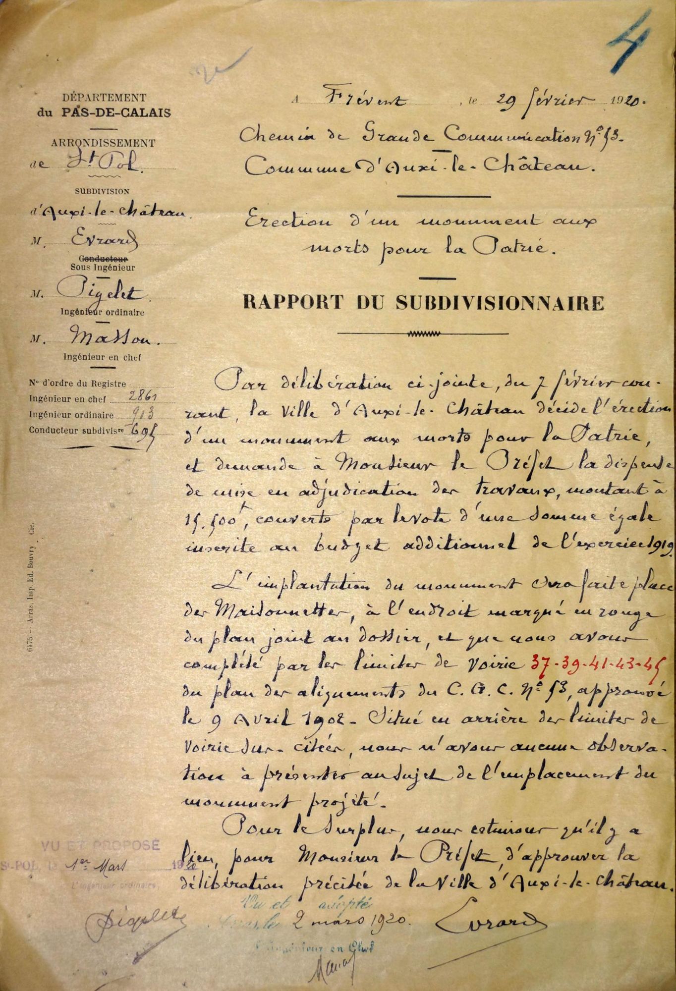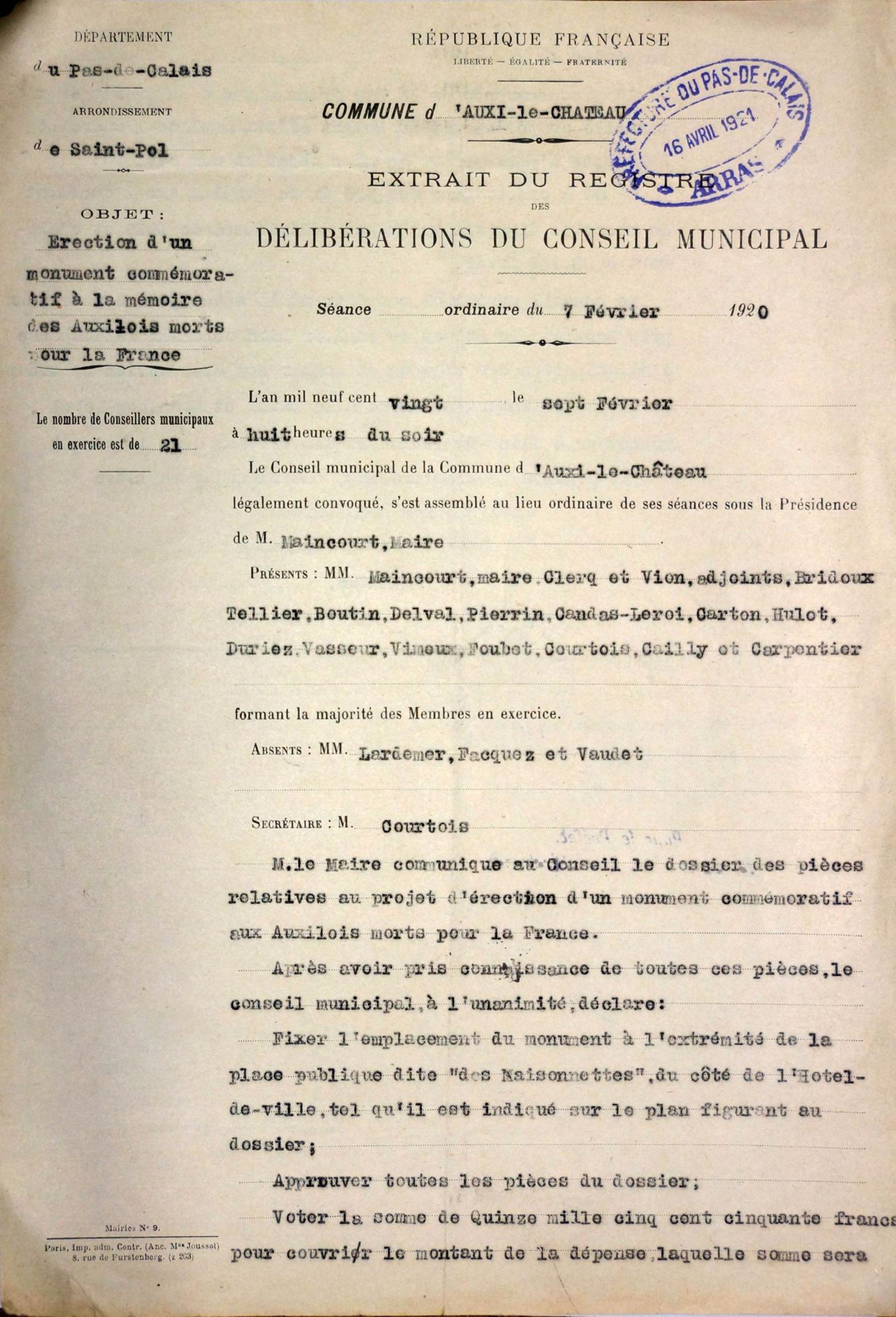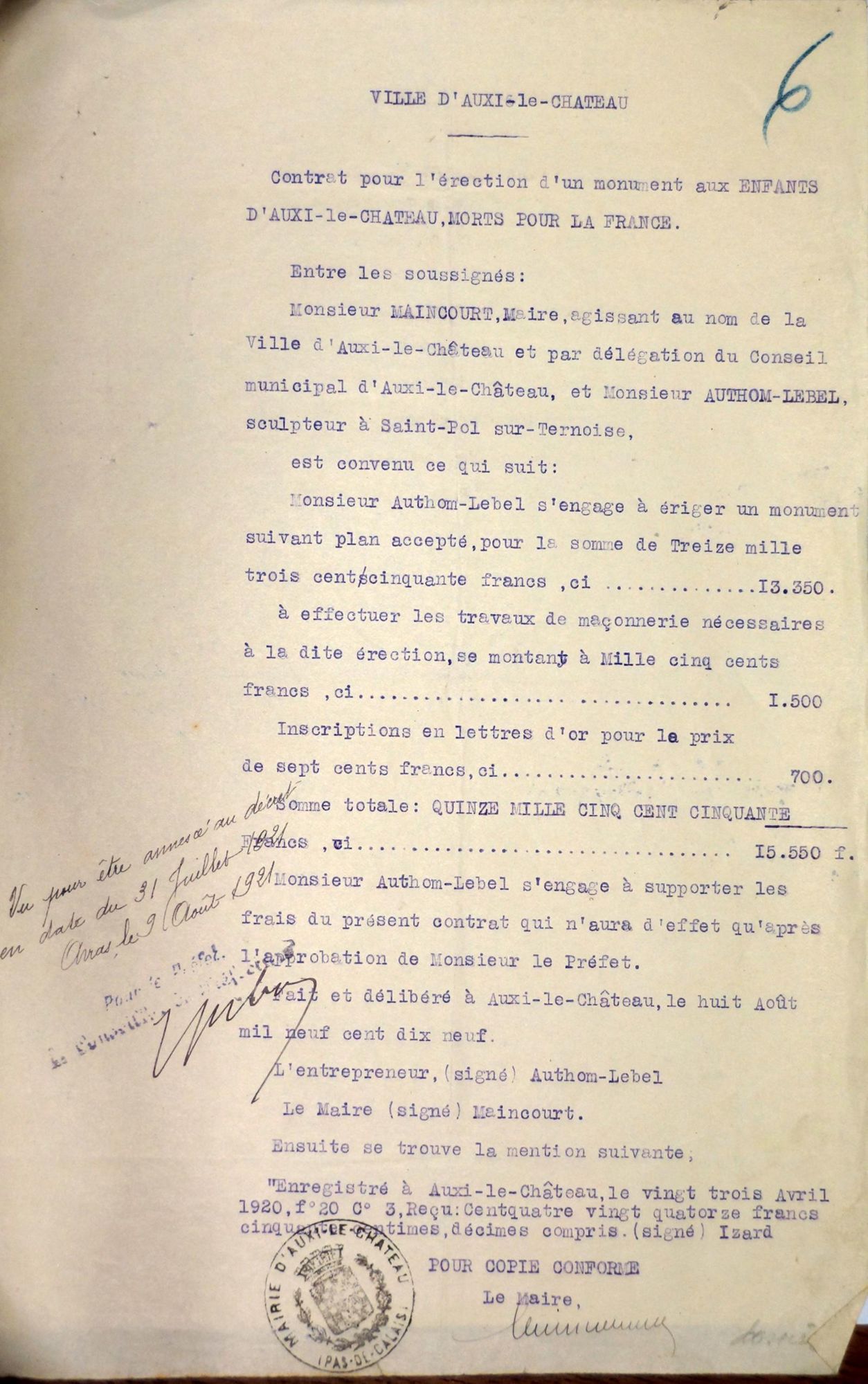 Le défilé eut lieu sans à-coups, dans un ordre parfait. Après avoir suivi les rues d’Hesdin, d’Abbeville et d’Amiens, le cortège revint par la ru de Wavans sur la Place de la Mairie. Tout le monde se groupas alors autour du monument fort bien conçu par M. Authom-Lebel de Saint-Pol, que beaucoup voulurent féliciter. M. Marais, sous-préfet, procéda à l’enlèvement du voile tricolore qui recouvrait le monument, et M. Couvillers-Gaudry, un mutilé, monta à la tribune. Après avoir fait l’appel des auxilois morts au champ d’honneur, appel auquel les enfants des écoles répondirent tous ensemble par ces paroles si glorieuses : « Morts pour la France ! », M. Couvillers-Gaudry, confiant le monument à la garde de la municipalité, honora la mémoire des camarades tombés pour la défense du pays et rendit hommage aux familles de ces héros. Le discours de M. Couvillers terminé, les jeunes filles de l’école de Mme Lemaigre chantèrent les vers célèbres de Victor Hugo : Ceux qui pieusement sont morts pour la Patrie… A la foule vivement impressionnée par les paroles si belles de notre grand poète, M. Maincourt, maire, parla alors en ces termes : Discours de M. Maincourt Après avoir remercié ses administrés de leur empressement à souscrire pour l’érection du monument aux morts ; après avoir rappelé l’appel de la Patrie en danger, l’élan avec lequel ses défenseurs y répondirent, les heures douloureuses que suivit la victoire de la Marne, M. Maincourt ajoute : « Pendant plus de 4 ans, ce fut une lutte ingrate et meurtrière, où nos chers soldats, par leur courage opiniâtre et leur foi en la victoire, étonnèrent le monde, qui leur avait fait jusqu’alors une réputation de légèreté et d’inconstance. Hélas ! pendant ces autre années de combats sur terre, sur mer, dans les eaux, dans les aires, au milieu des balles, des obus, des gaz, des liquides enflammés, que de vies fauchées en pleine force et en pleine jeunesse ! 1.500.000 morts dorment là-bas des côtes des Flandres aux frontières de Suisse, dans les plaines de l’Yser, d’Artois, de Champagne, dans les Vosges et d’alsace, devant Verdun et sur les rives de la Marne. Auxi-le-Château a fourni son contingent dans cette sanglante hécatombe. 78 de ses enfants ne sont pas revenus. Où sont-ils ? Dans quelle sépulture anonyme reposent maintenant ces morts anonymes ? Dans quel champ ? Au bord de quelle route la funèbre tranchée fut-elle ouverte, puis comblée ? Qu’importe ! Ils dorment dans la terre de France ; elle leur sera légère. Certes, il est dur, il est pénible pour la mère, pour l’épouse, pour la fiancée, de ne pouvoir s’agenouiller sur le tertre sacré où dort le cher héros, de ne pouvoir déposer sur sa tombe la fleur du souvenir. Mais à chaque fête des morts que novembre ramènera, vous aurez la suprême consolation de pouvoir venir au pied de ce monument élevé à la mémoire de ces grands morts par la piété de leurs concitoyens. Vous lirez leurs noms, et s’il est vrai, comme on l’a dit, que l’esprit des morts aimer à planer dans les lieux qui leur furent familiers, peut-être les entendrez-vous dire : « Ne pleurez pas ; notre mère était attaquée, nous l’avons défendue, nous sommes morts pour la France vive. » Et là-bas dans ces plaines redevenues silencieuses, dans ces plaines où se jouèrent les destinées de l’Europe et peut-être du monde, nos morts nous parlent et nous disent : « N’oubliez jamais ». C’est pour que les générations futures n’oublient pas, que nous avons élevé ce monument. Ce qu’elle ne doivent pas oublier, c’est l’héroïsme de ceux dont les noms sont gravés sur cette pierre et dont le sacrifice sauva nos libertés. Ce qu’elles ne doivent pas oublier, c’est que la race germanique est toujours debout. Sa haine pour la France, est plus vivace que jamais, et le Rhin est une bien faible barrière. N’oublions pas non plus que notre patrie est encore convalescente et que pour que la France guérisse l’union entre tous ses enfants est indispensables. Conservons donc cette union sacrée qui, pendant la guerre, nous fit invincibles. Travaillons et produisons pour que puissent vivre ceux envers lesquels nous avons contracté une dette sacrée : les mutilés, les vieux parents, les veuves, et les orphelins de guerre. Je m’incline bien bas devant ce monument élevé à la gloire de nos enfants et respectueusement je salue leurs familles et je leur dis : Soyez fiers, ils ne sont pas morts en vain ; ils ont sauvé la France. Je termine en adressant tous mes remerciements à notre sympathique sous-préfet de Saint-Pol, M. Henri Marais qui a bien voulu accepter avec autant d’empressement, la présidence de cette cérémonie, à Messieurs les conseillers généraux, aux maires et instituteurs du canton, aux personnes étrangères à la localité qui sont venus se joindre à nous pour glorifier nos morts, à la ville de Frévent qui a bien voulu offrir une gerbe de fleurs. Merci aux organisateurs et aux personnes de bonne volonté, qui tous ont rivalisé de zèle pour orner la ville de magnifiques arcs de triomphe et de guirlandes, merci pour le défilé si bien réussi ; à M. le doyen qui a bien voulu dire une messe en l’honneur de nos héros. Aux directeurs et directrices des écoles et leurs élèves, aux choristes, aux parents et aux petites enfants travestis, à la musique municipale, aux sapeurs-pompiers, aux sociétés mutuels, aux vétérans des armées de mer et de terre ; à la société de préparation militaire, aux mutilés, aux anciens combattants, sans oublier les prisonniers de guerre, qui ont subi le joug allemand. Merci enfin à tous à quelque titre que ce soit d’avoir bien voulu contribuer à l’éclat de cette manifestation. Je rends hommage aux anciens combattants et aux mutilés et comme m’y conviait tout à l’heure leur représentant mon ami Couvillers, la municipa