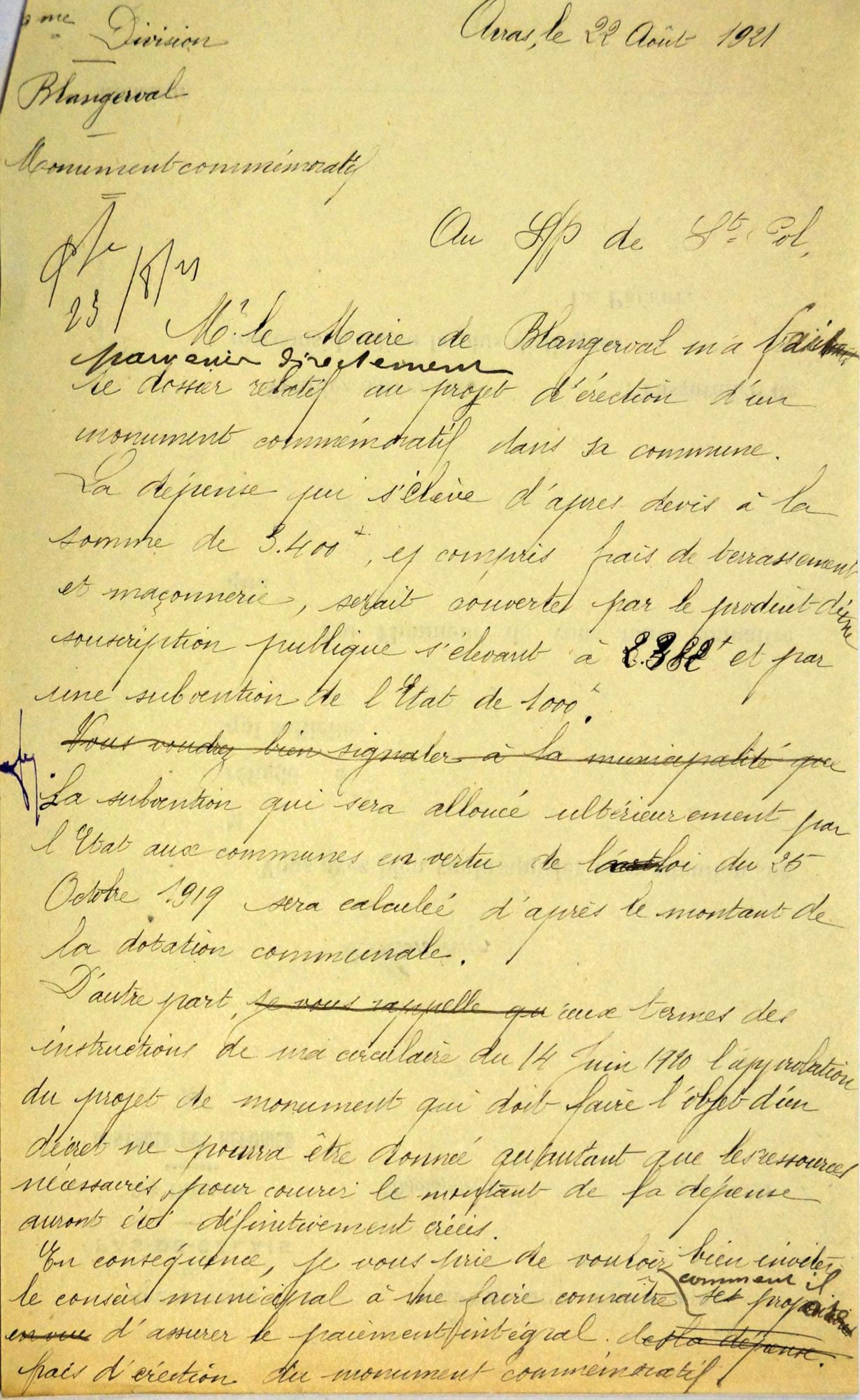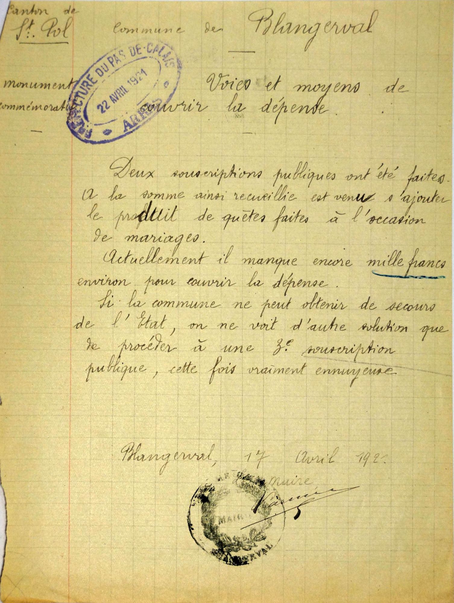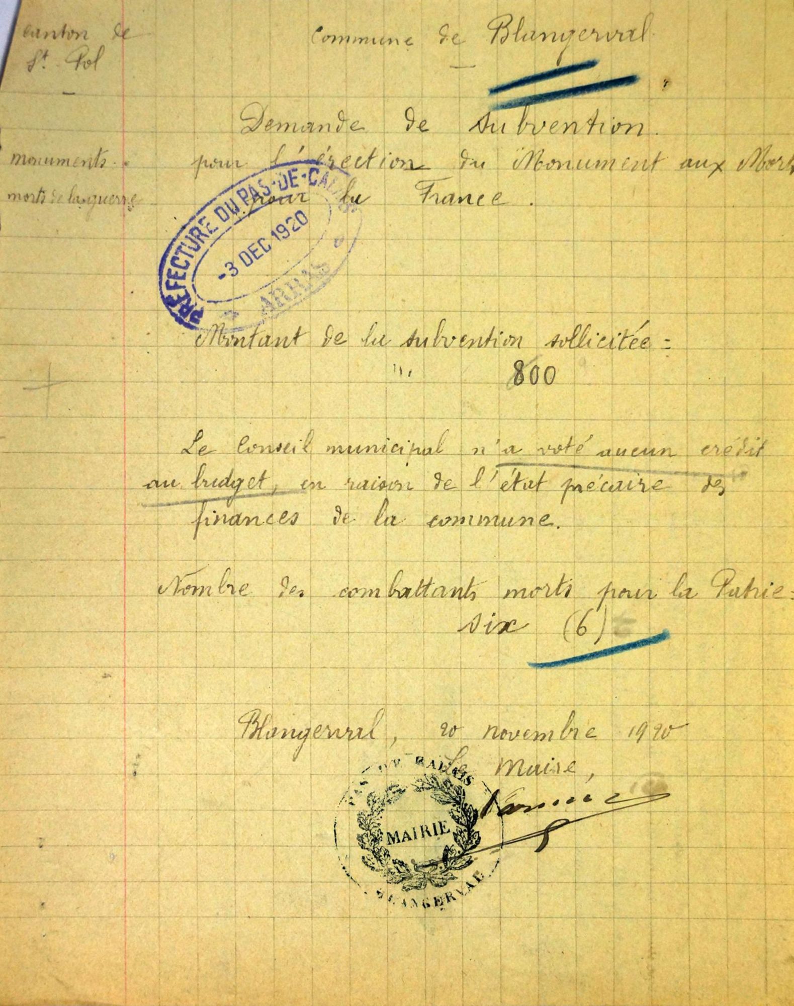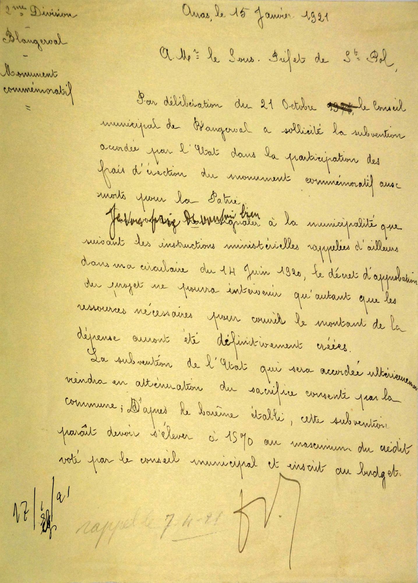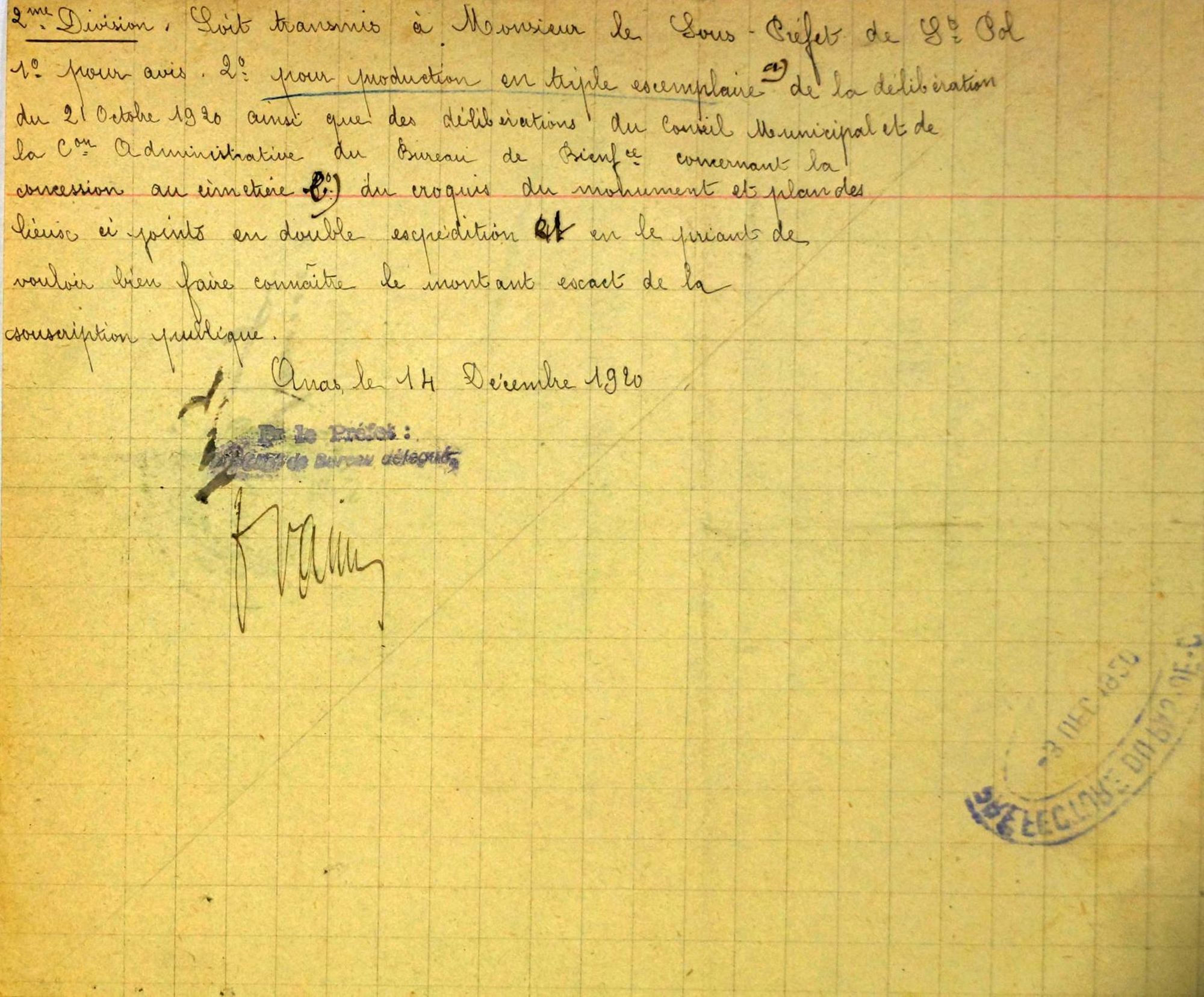 De plus une demande de subvention de l'État est formulée (21 octobre 1920)