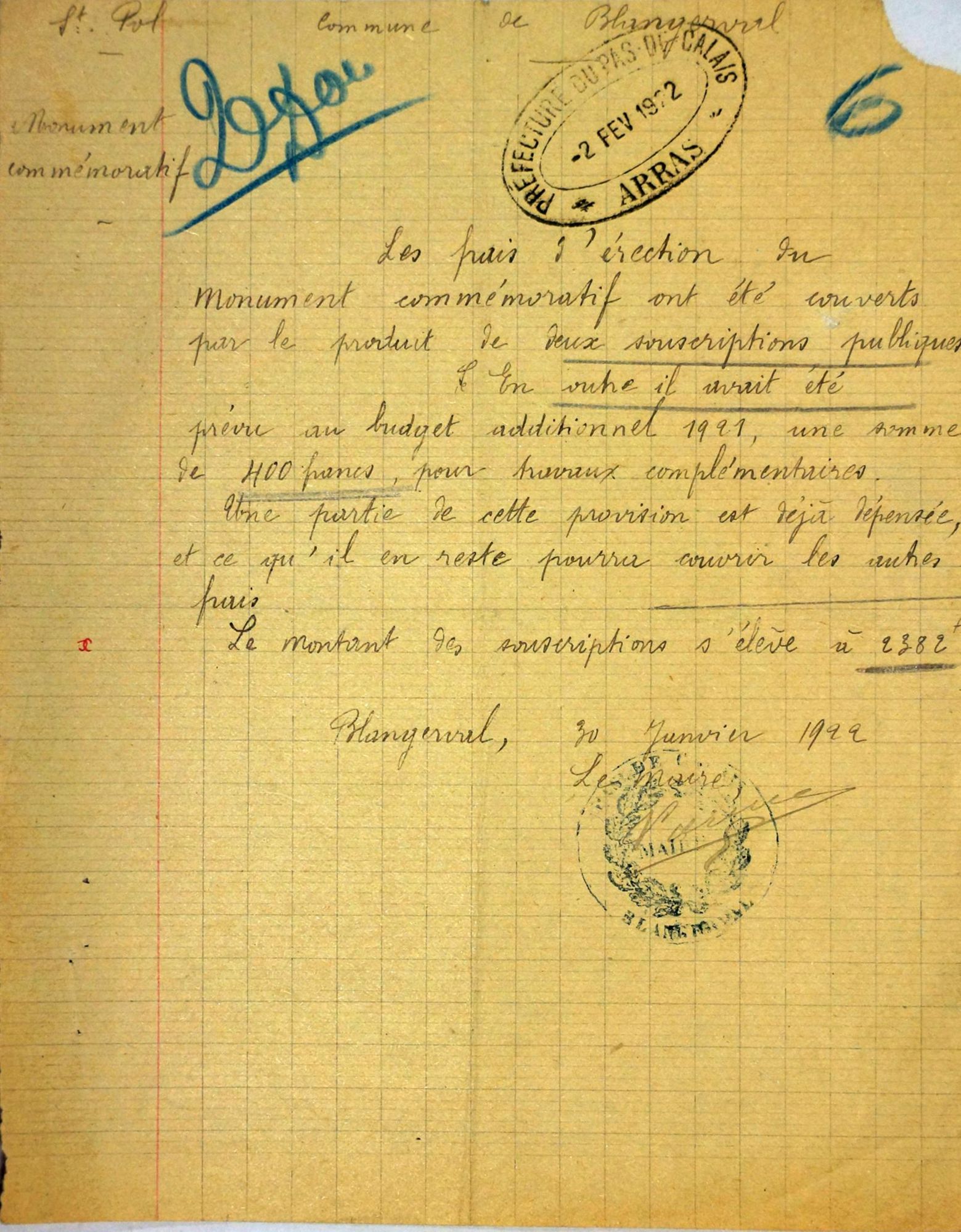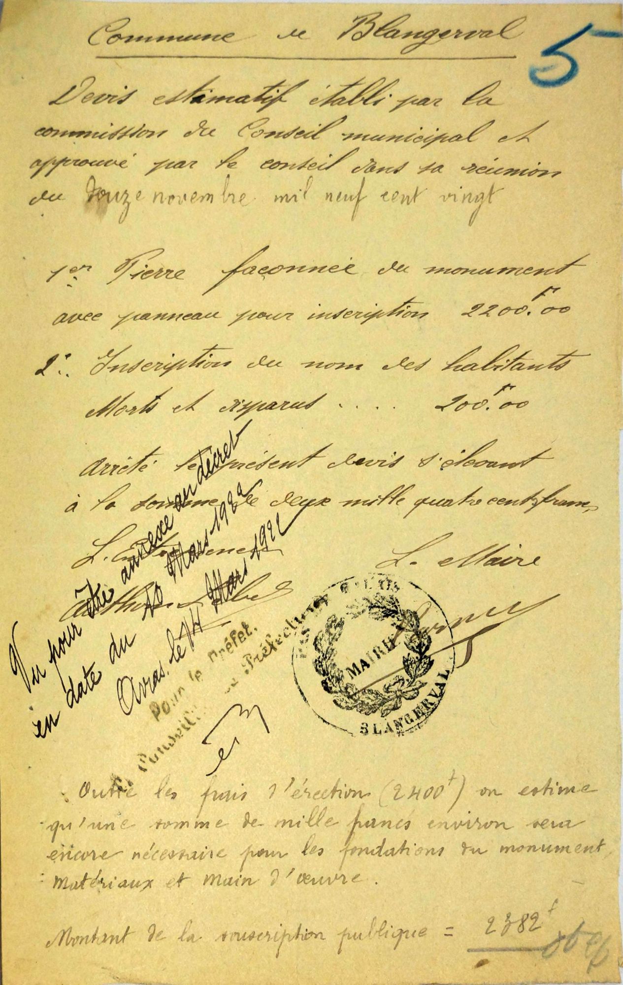 La dépense qui s'élève d'après devis à la somme de 3400frs, y compris frais de terrassement et maçonnerie, serait couverte par le produit d'une souscription publique s'élevant à 2382 frs et par une subvention de l'État de 1000 frs