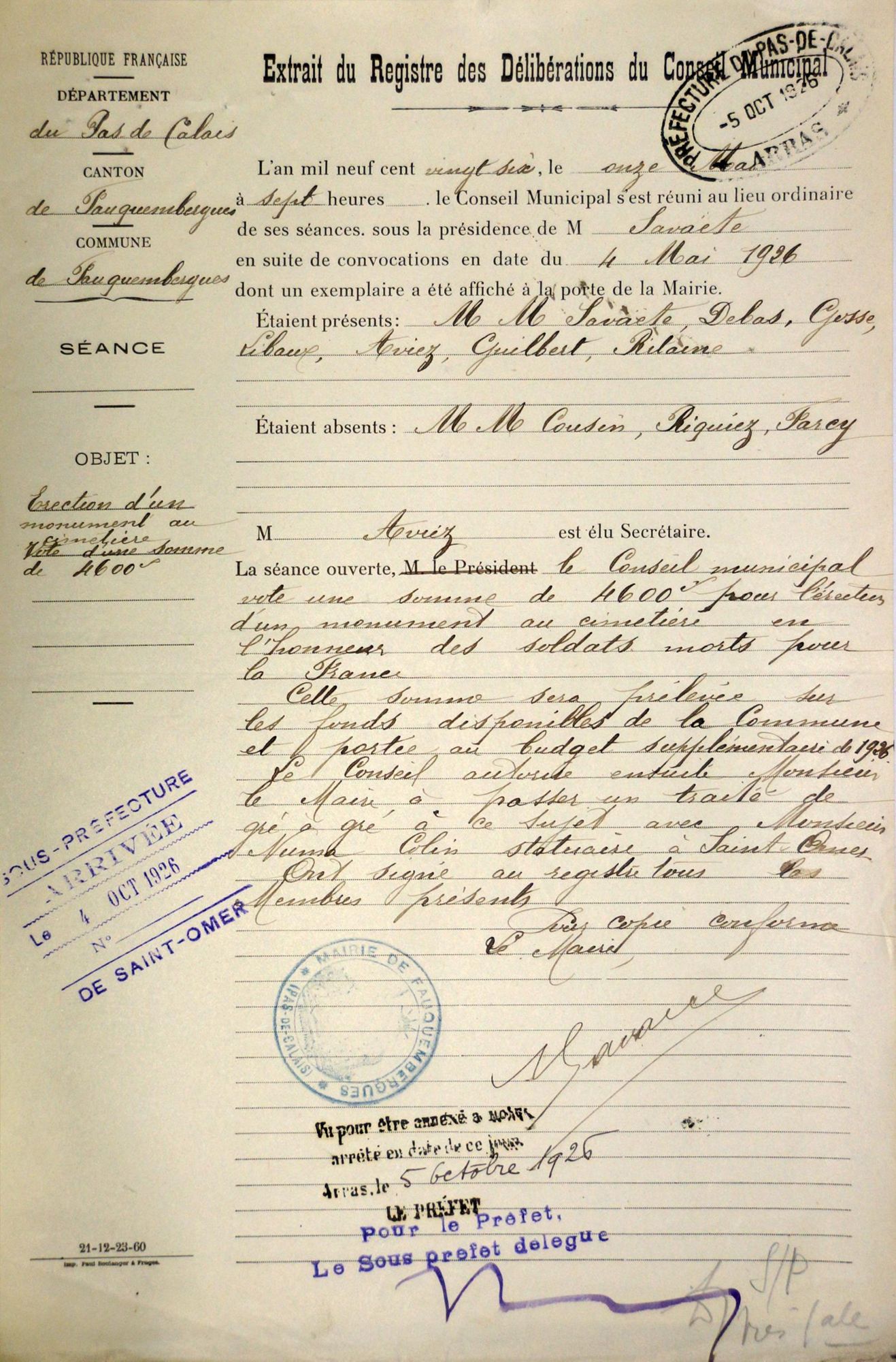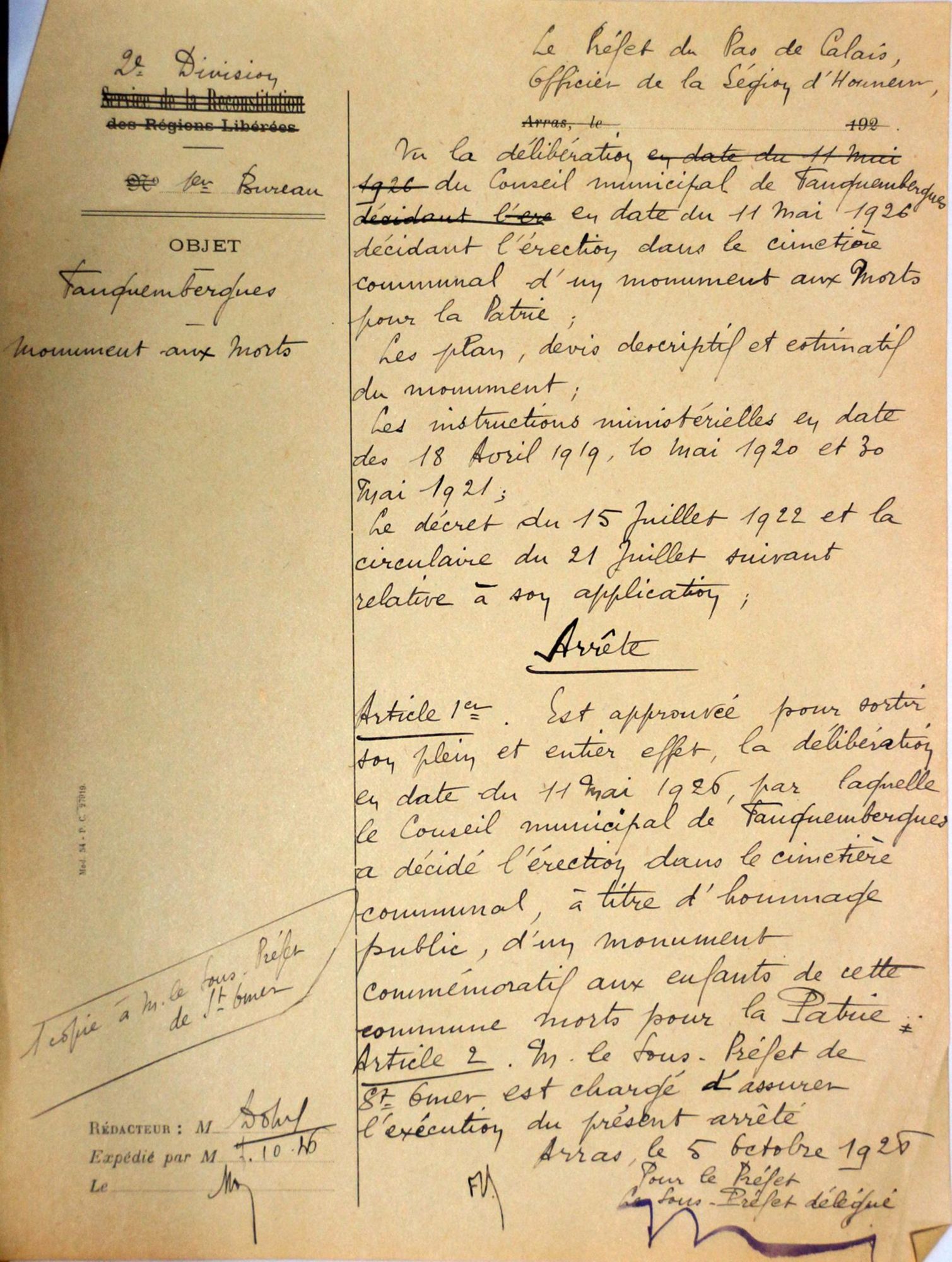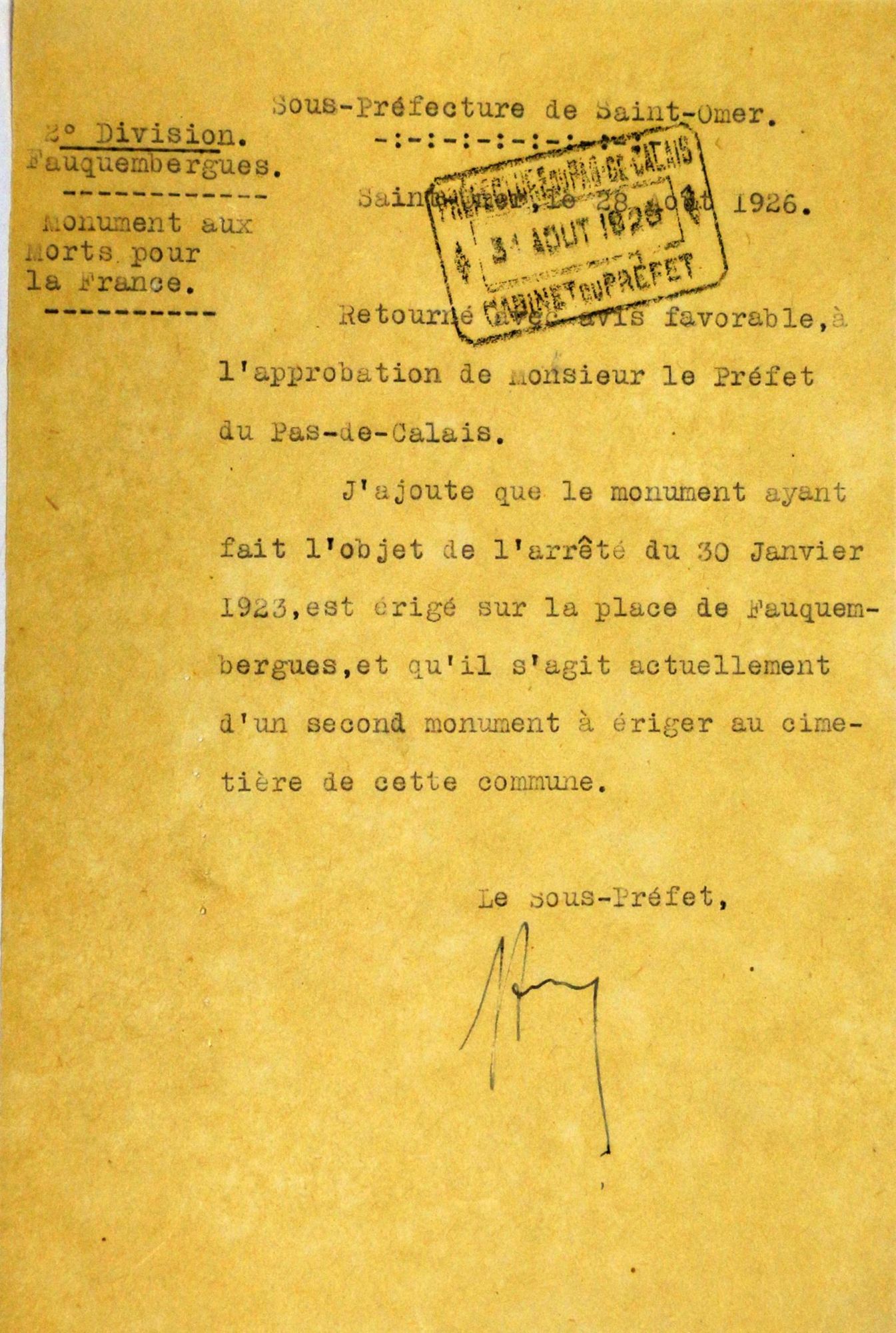 J'ajoute que le monument ayant fait l'objet de l'arrêté du 30 janvier 1923, érigé sur la place de Fauquembergues, et qu'il s'agit actuellement d'un second monument à ériger au cimetière