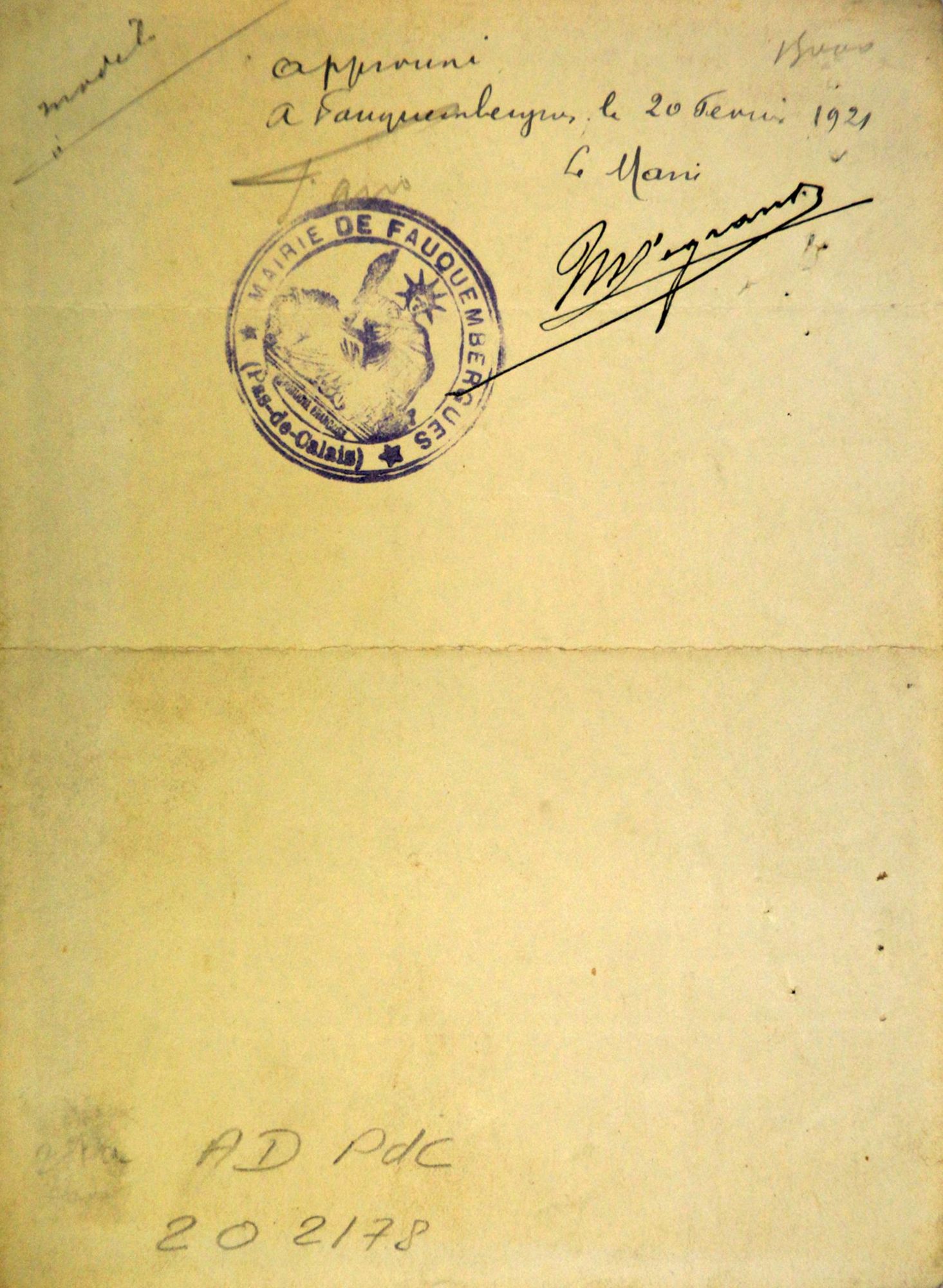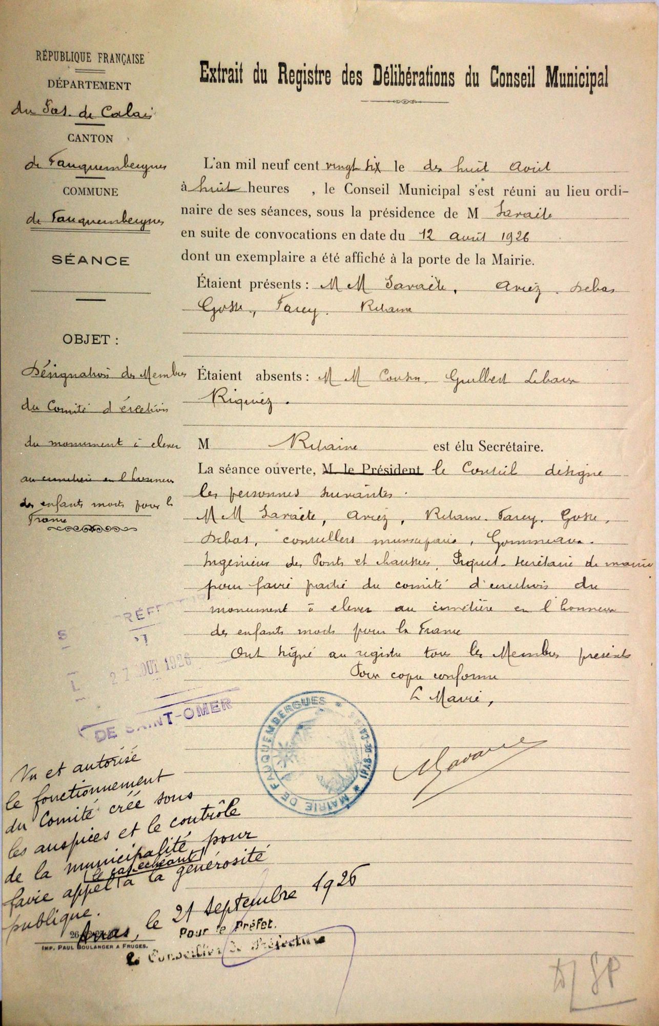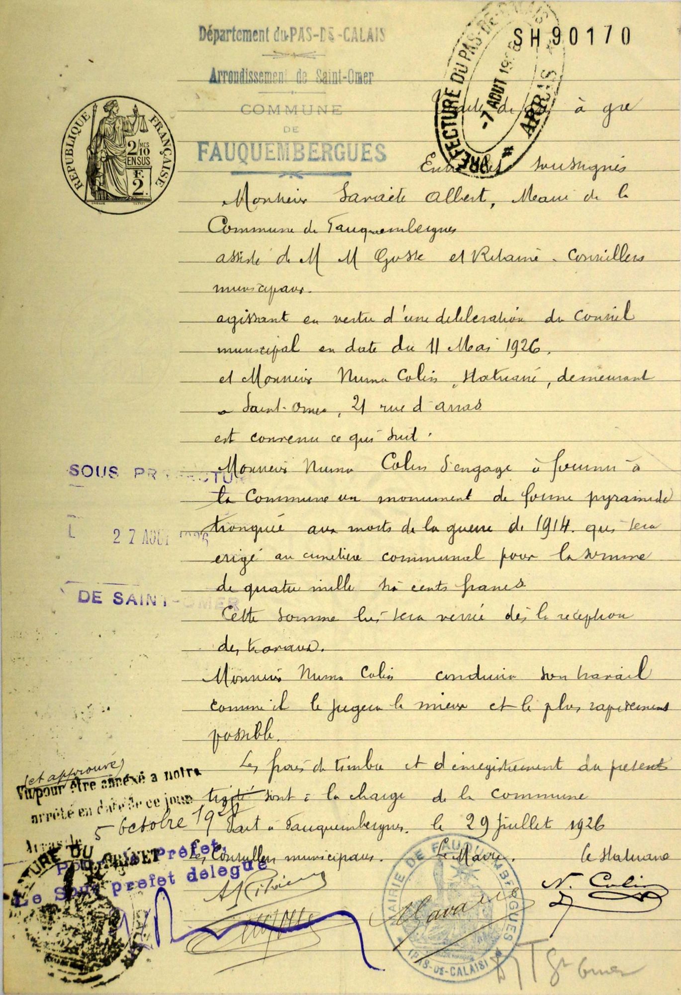 J'ajoute que le monument ayant fait l'objet de l'arrêté du 30 janvier 1923, érigé sur la place de Fauquembergues, et qu'il s'agit actuellement d'un second monument à ériger au cimetière