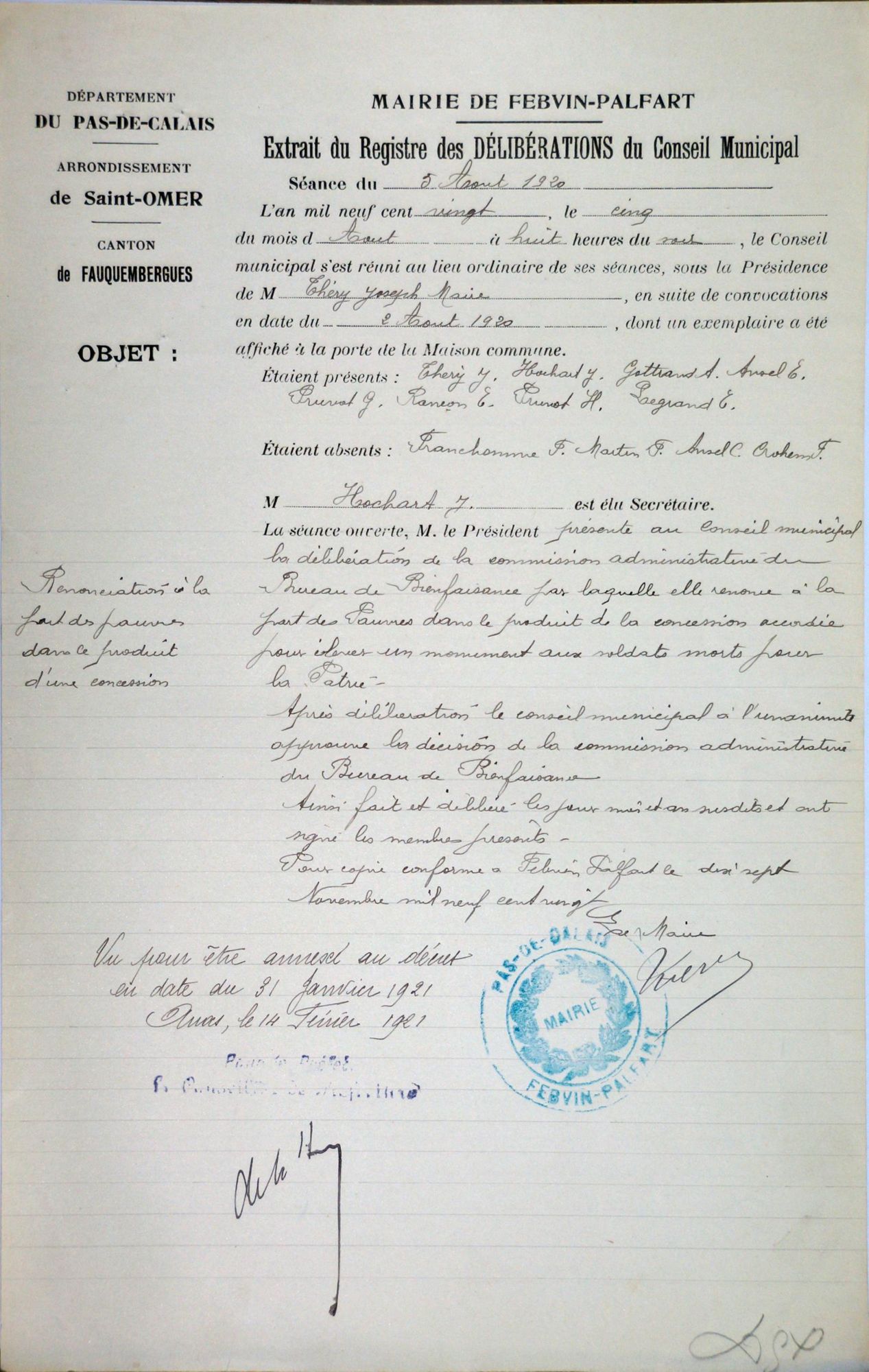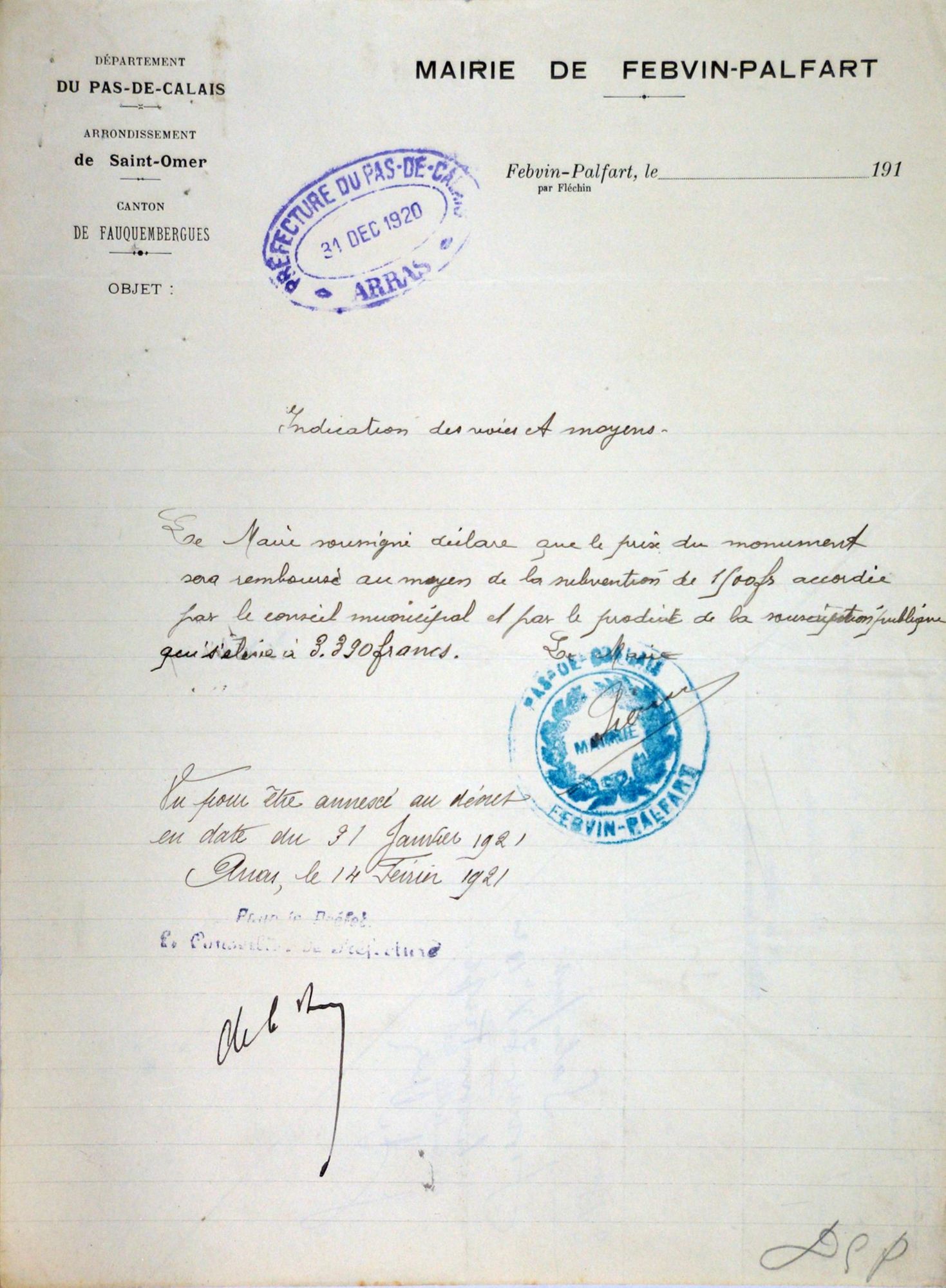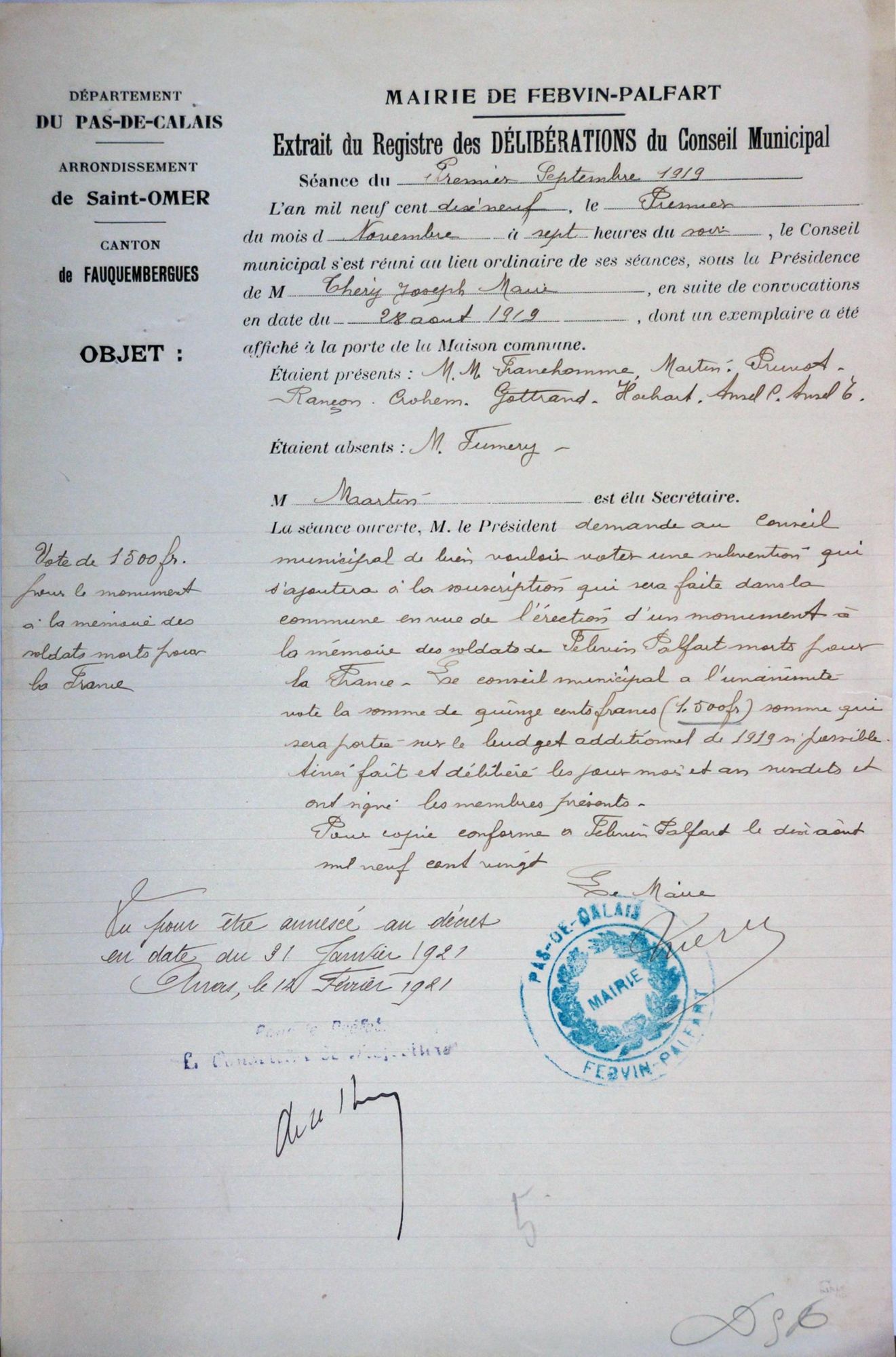 Vote de 1500 frs pour le monument aux morts