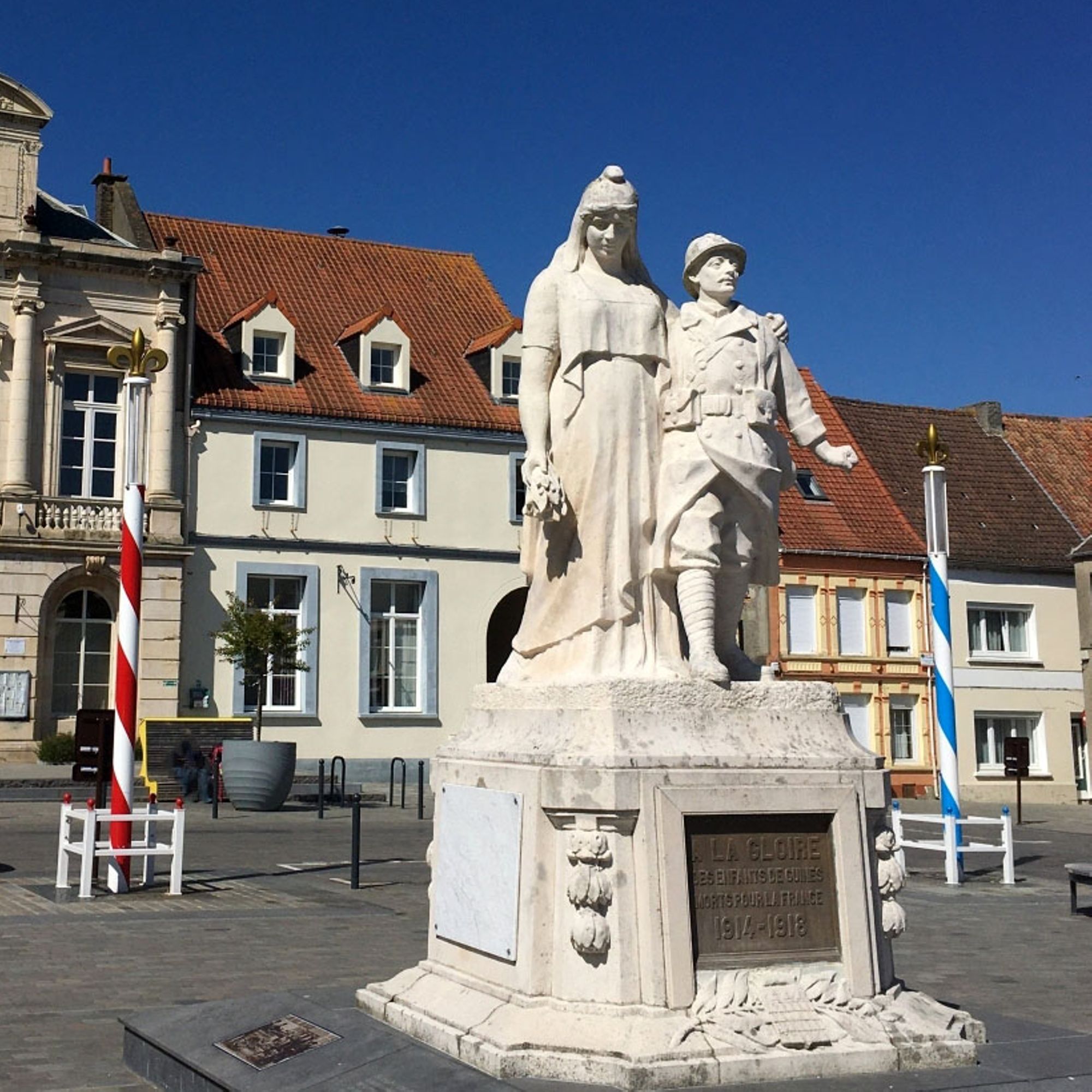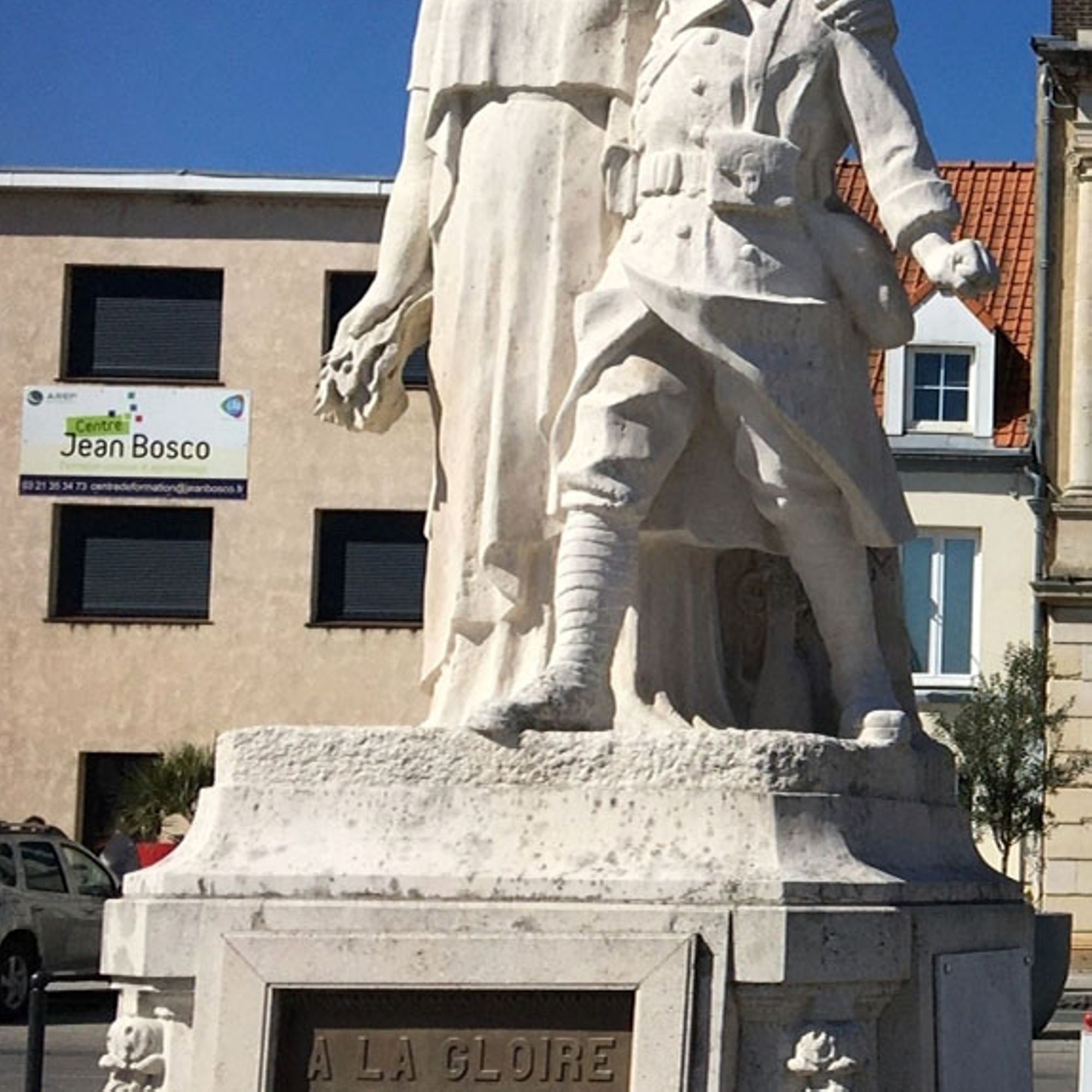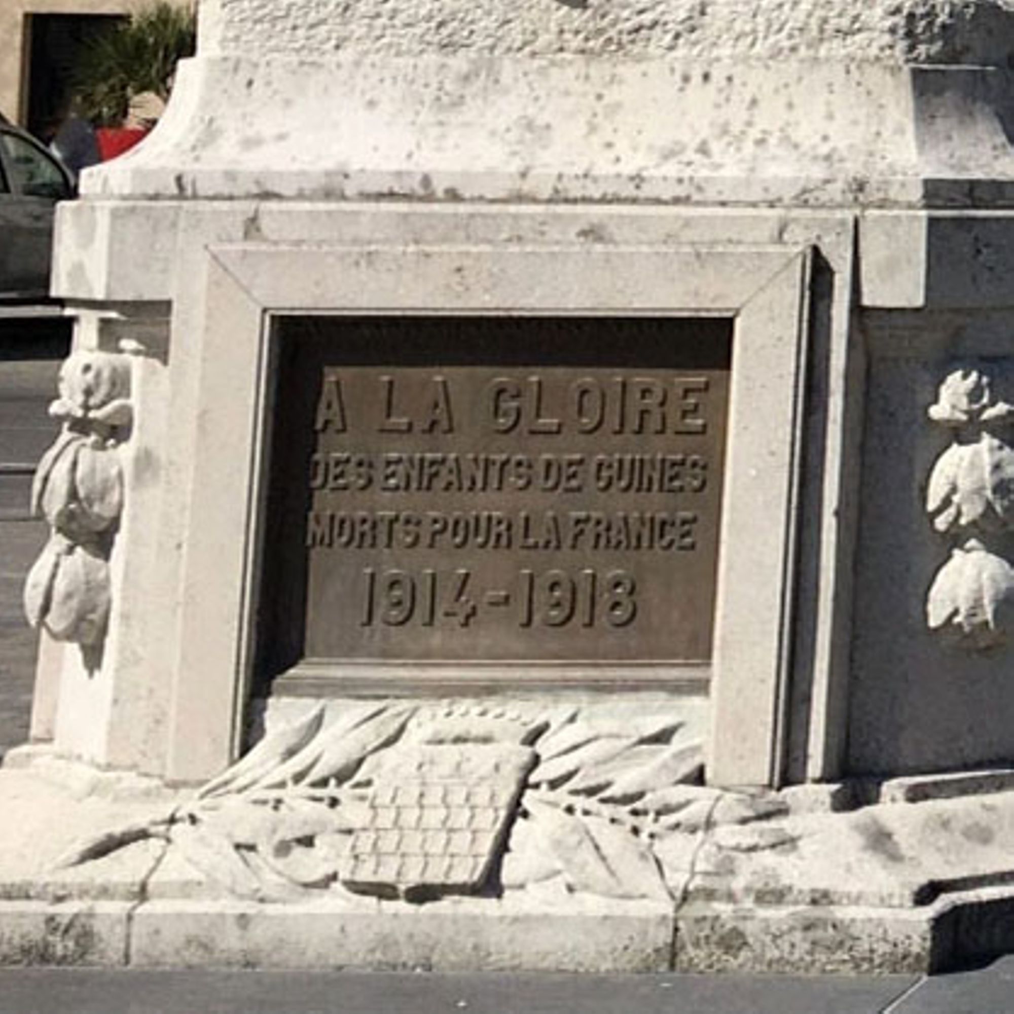 Derrière le soldat, une borne frontière sur laquelle le nom de la patrie est gravée, évoque métonymiquement la raison de leur combat et de leur fierté. La représentation de Marianne avec son bonnet phrygien n’est pas très courante pour les monuments aux morts où l’on préfère les drapés à l’antique »