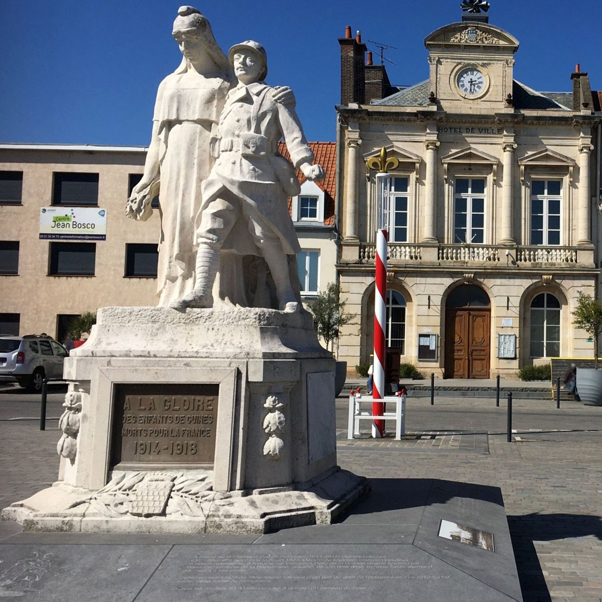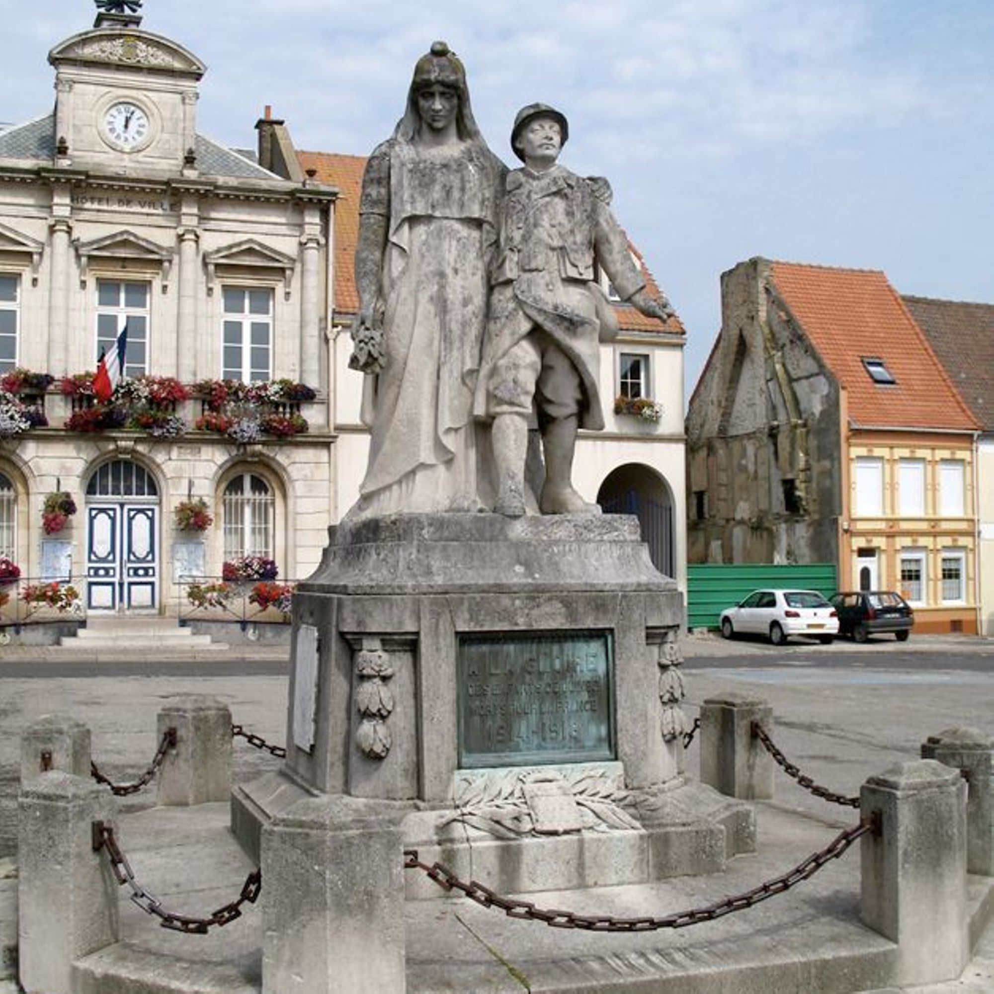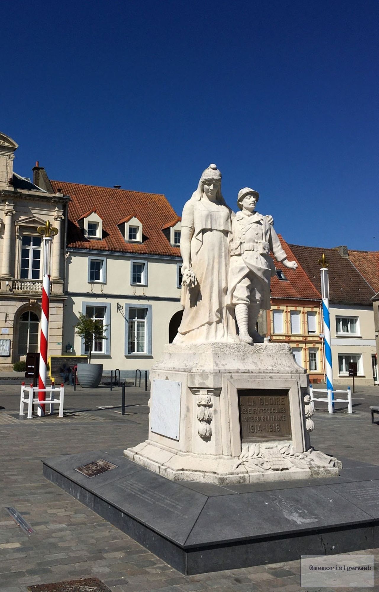 Derrière le soldat, une borne frontière sur laquelle le nom de la patrie est gravée, évoque métonymiquement la raison de leur combat et de leur fierté. La représentation de Marianne avec son bonnet phrygien n’est pas très courante pour les monuments aux morts où l’on préfère les drapés à l’antique »