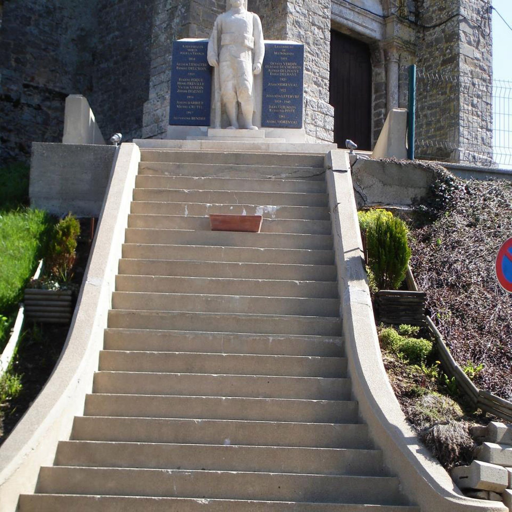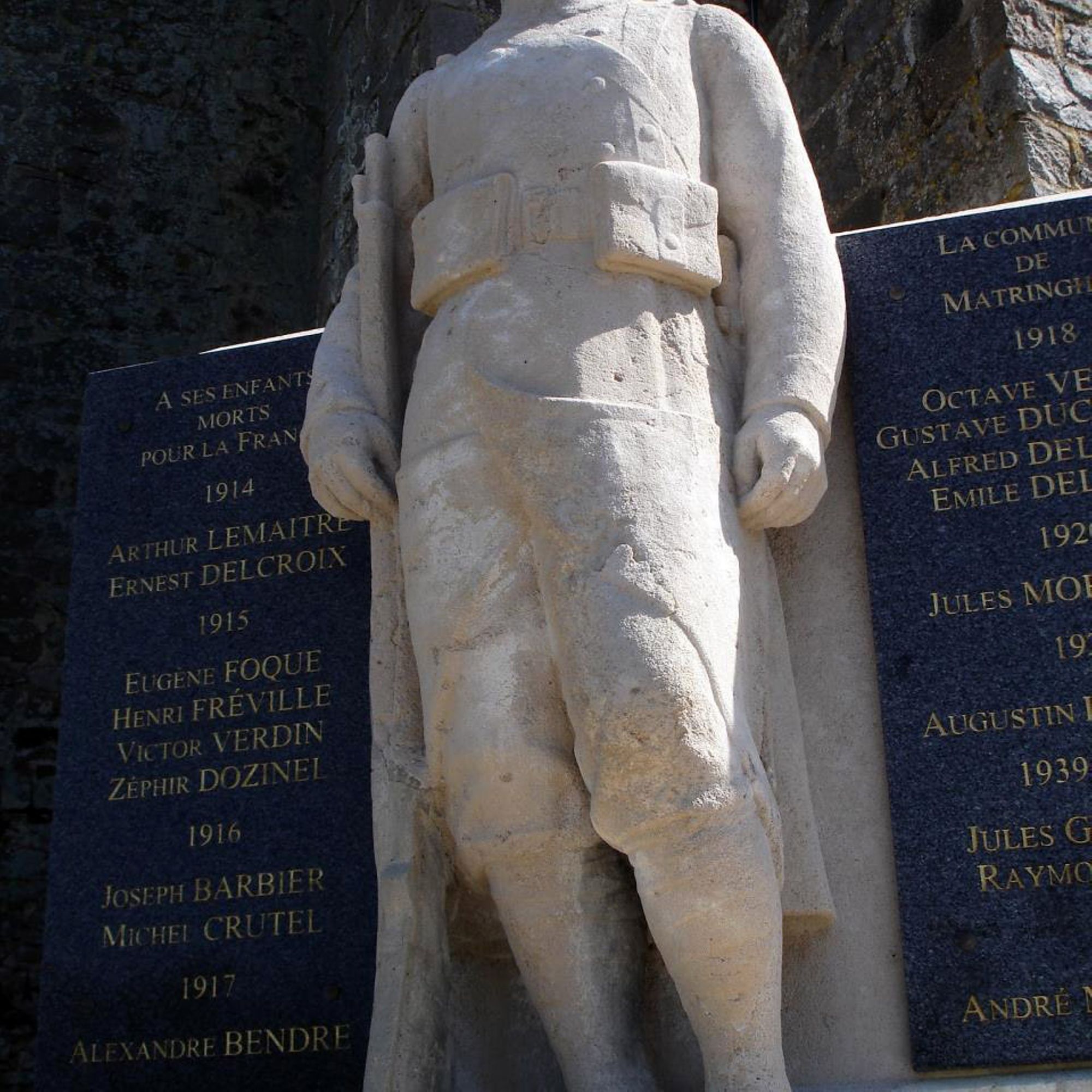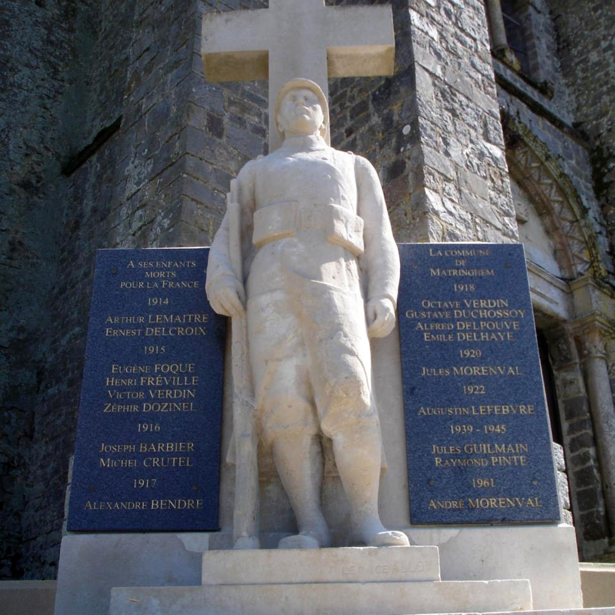 - Un poilu debout devant une croix, fusil au pied est encadré de deux plaques portant les noms des soldats victimes de guerre. Il domine le site, étant situé devant le portail de l'église de Matringhem qui a été implantée sur un éperon rocheux de grès.