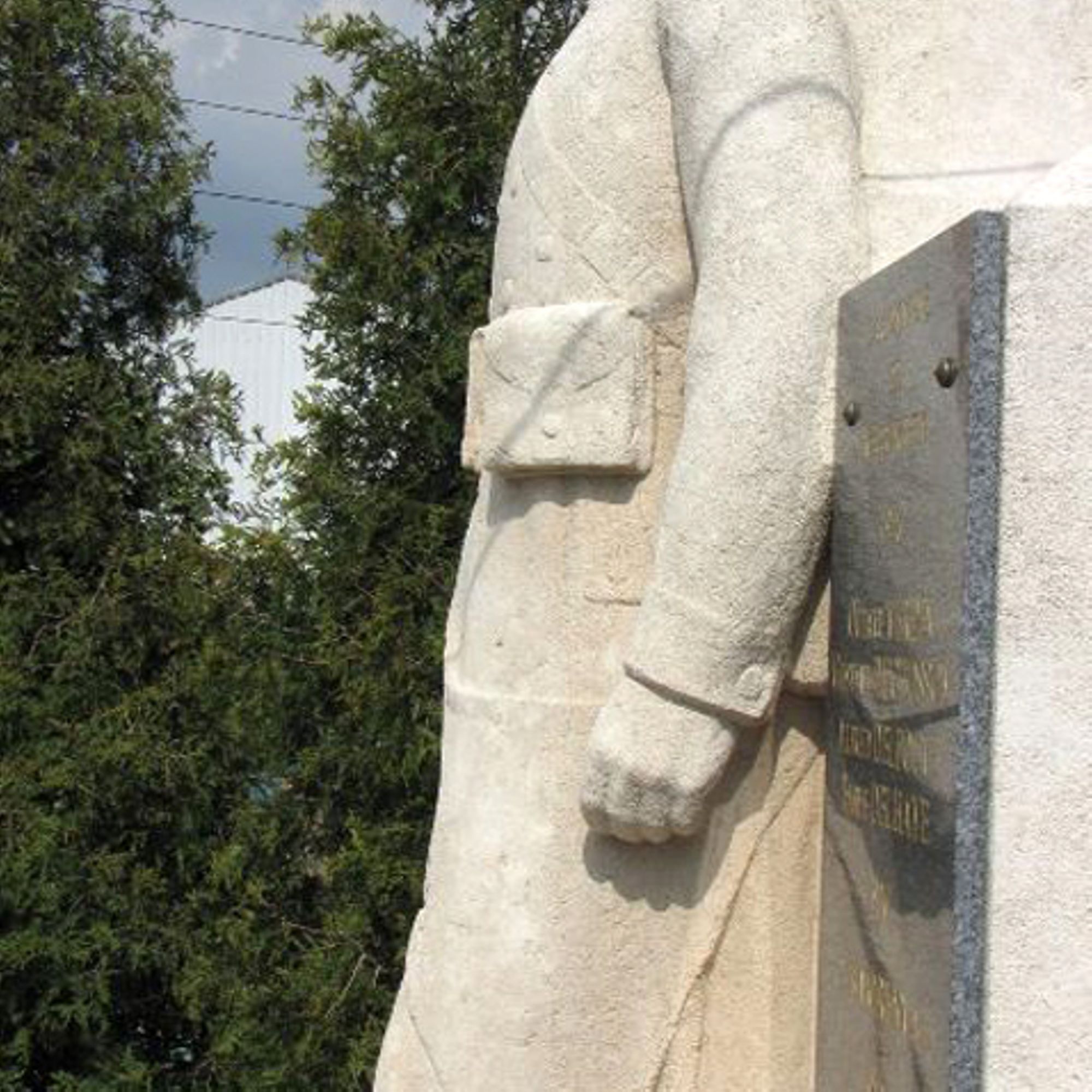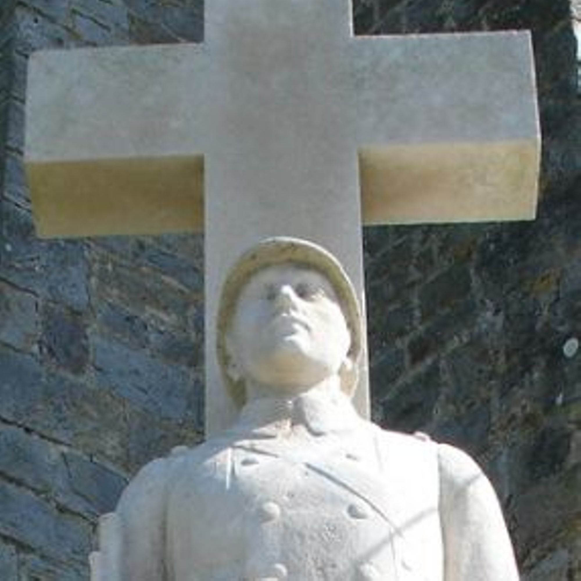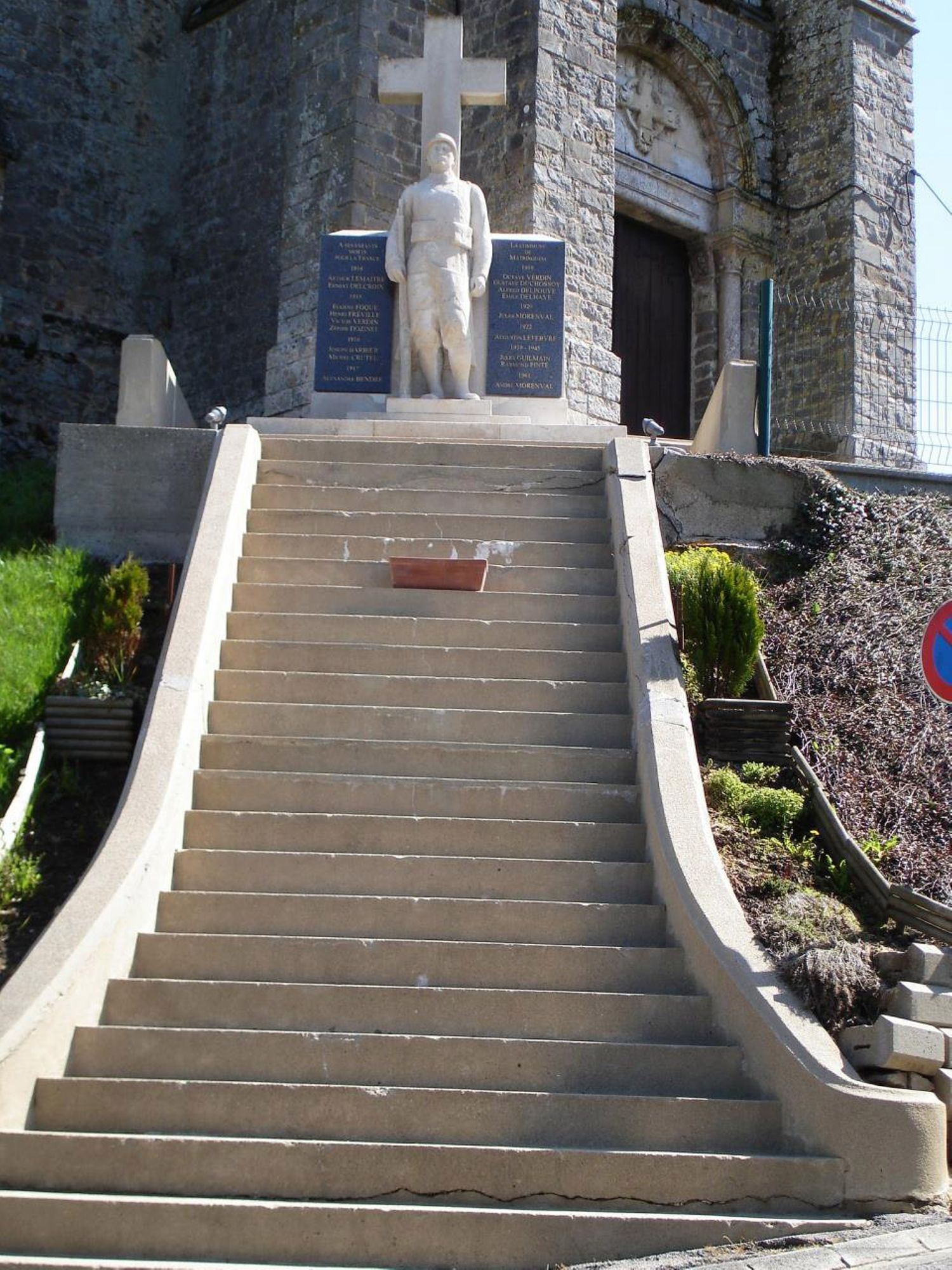 - Un poilu debout devant une croix, fusil au pied est encadré de deux plaques portant les noms des soldats victimes de guerre. Il domine le site, étant situé devant le portail de l'église de Matringhem qui a été implantée sur un éperon rocheux de grès.