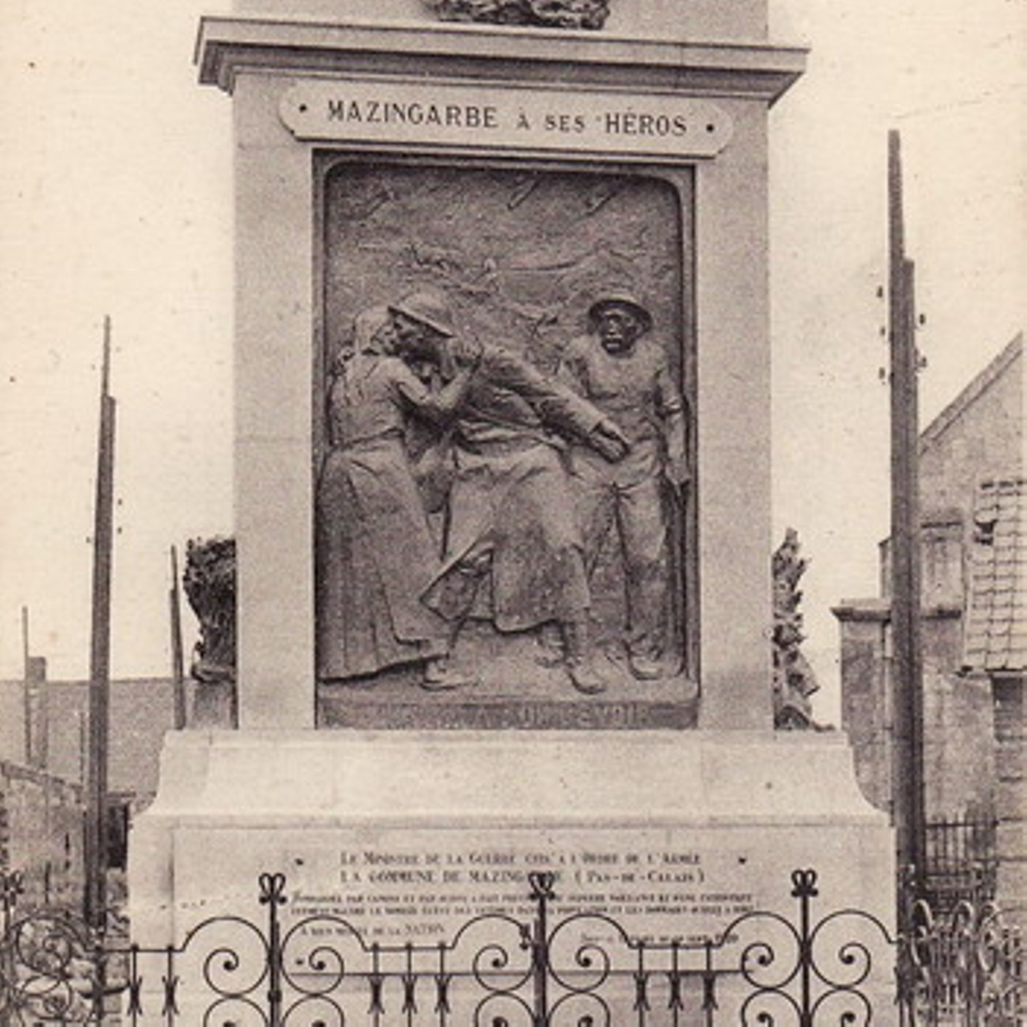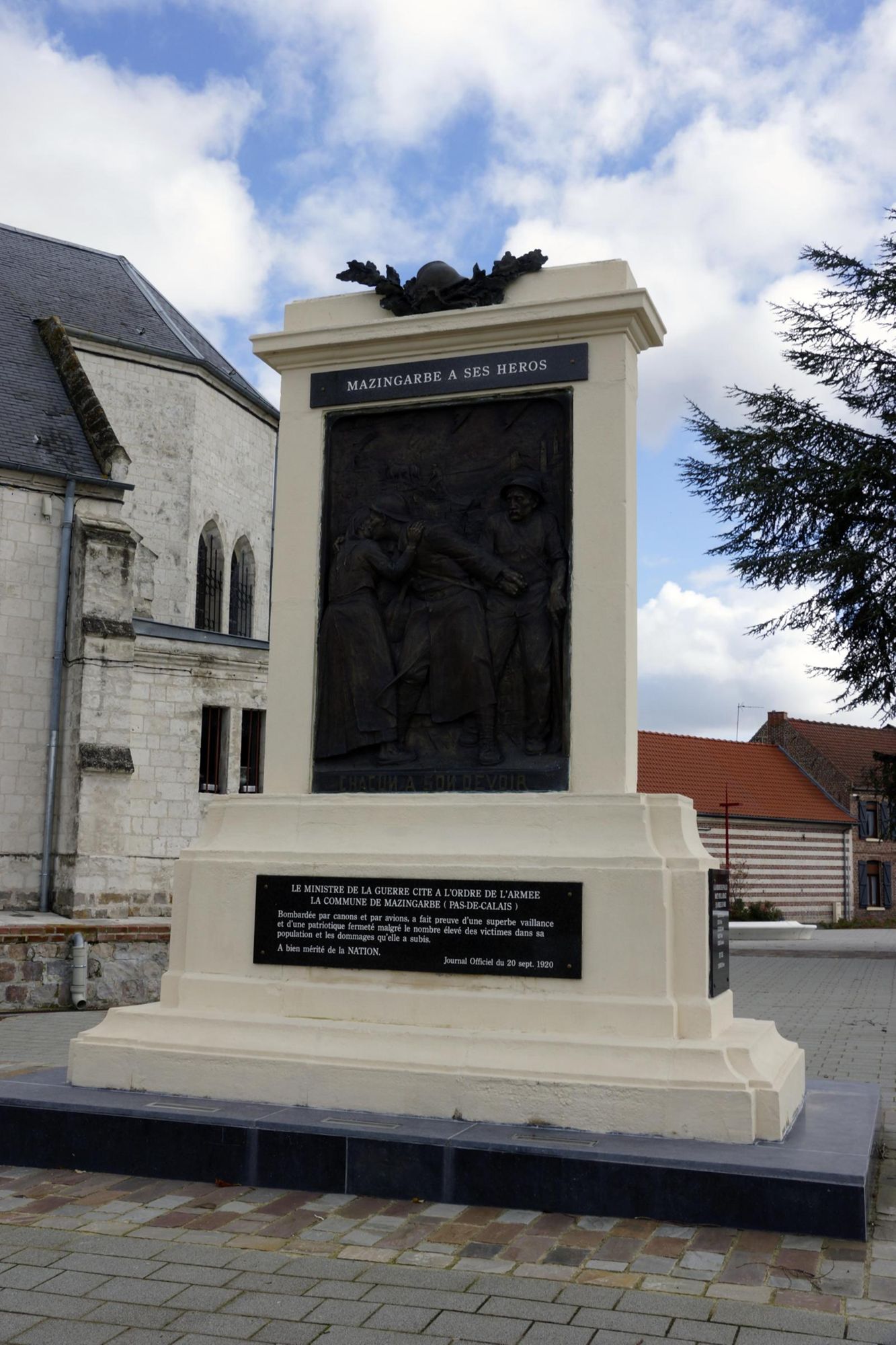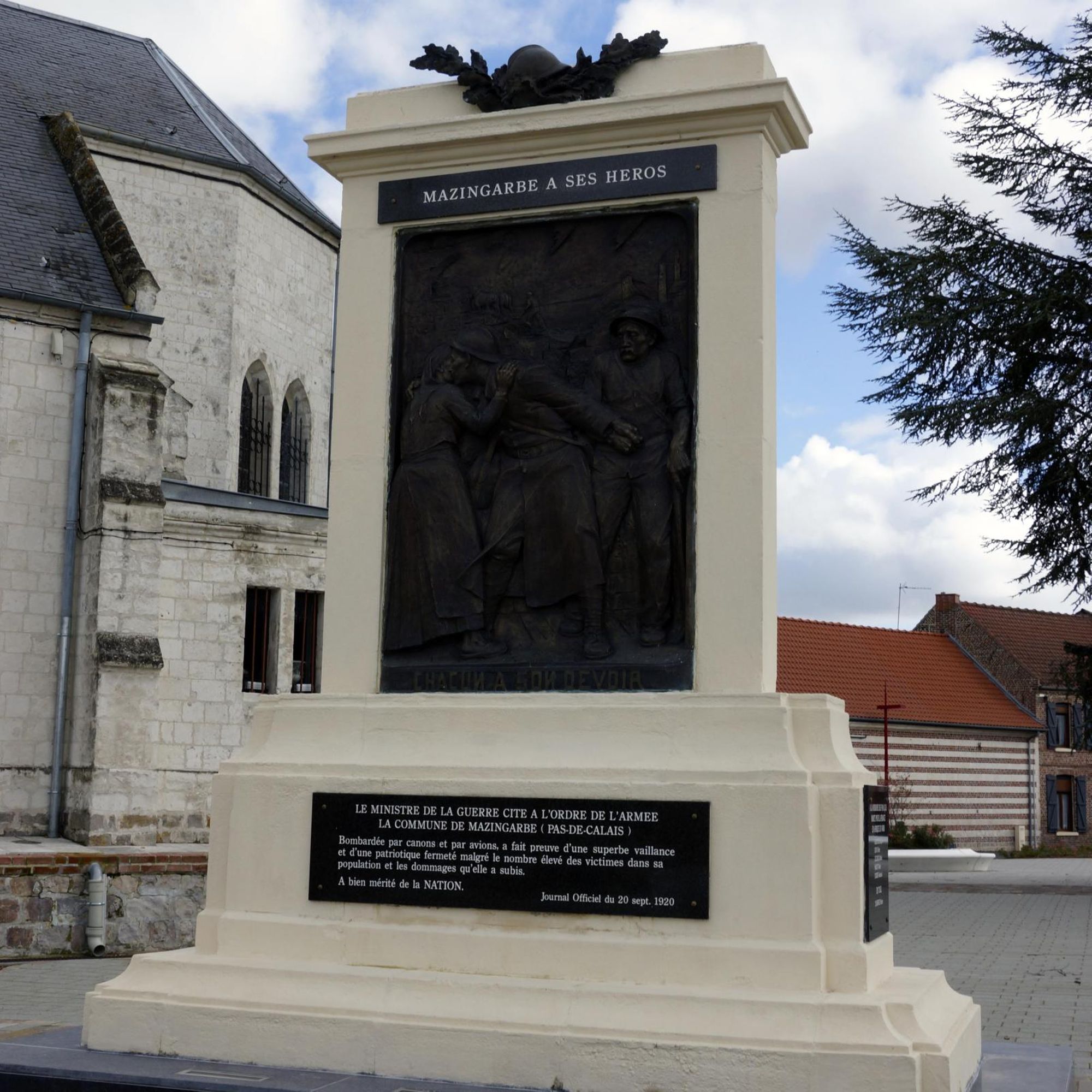 Au second plan dans le lointain, un laboureur les regarde. Au fronton, ces simples mots : « Mazingarbe à ses héros ». En bas, cette devise : « A chacun son devoir ». Et gravée dans le marbre blanc, la citation glorieuse suivante : « le ministre de la guerre cite à l’ordre du jour de l’armée la commune de Mazingarbe ; bombardée par canons et avions, a fait preuve d’une superbe vaillance et d’une patriotique fermeté ; elle a par le nombre élevé de ses victimes et les dommages qu’elle a subis, bien mérité de la nation ».