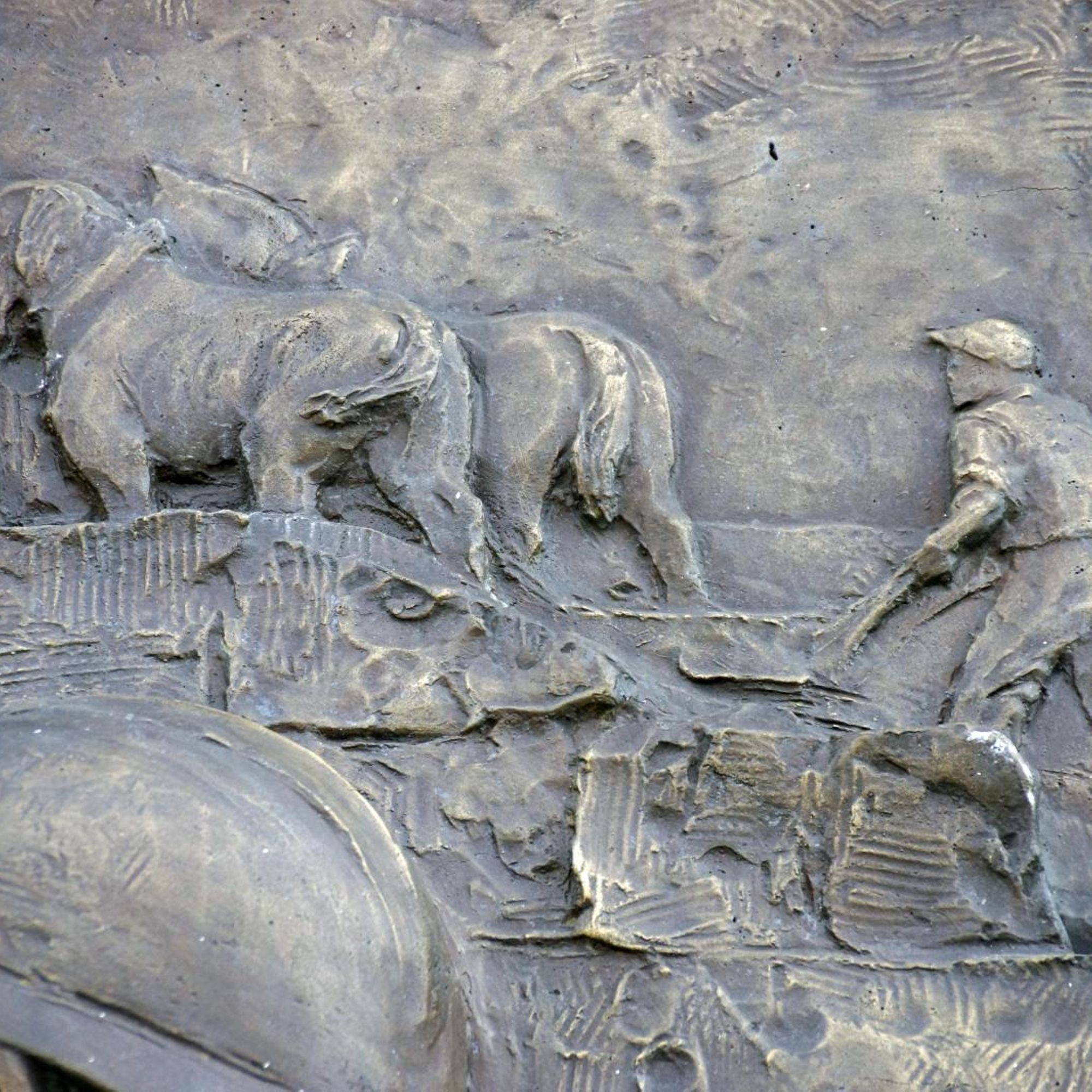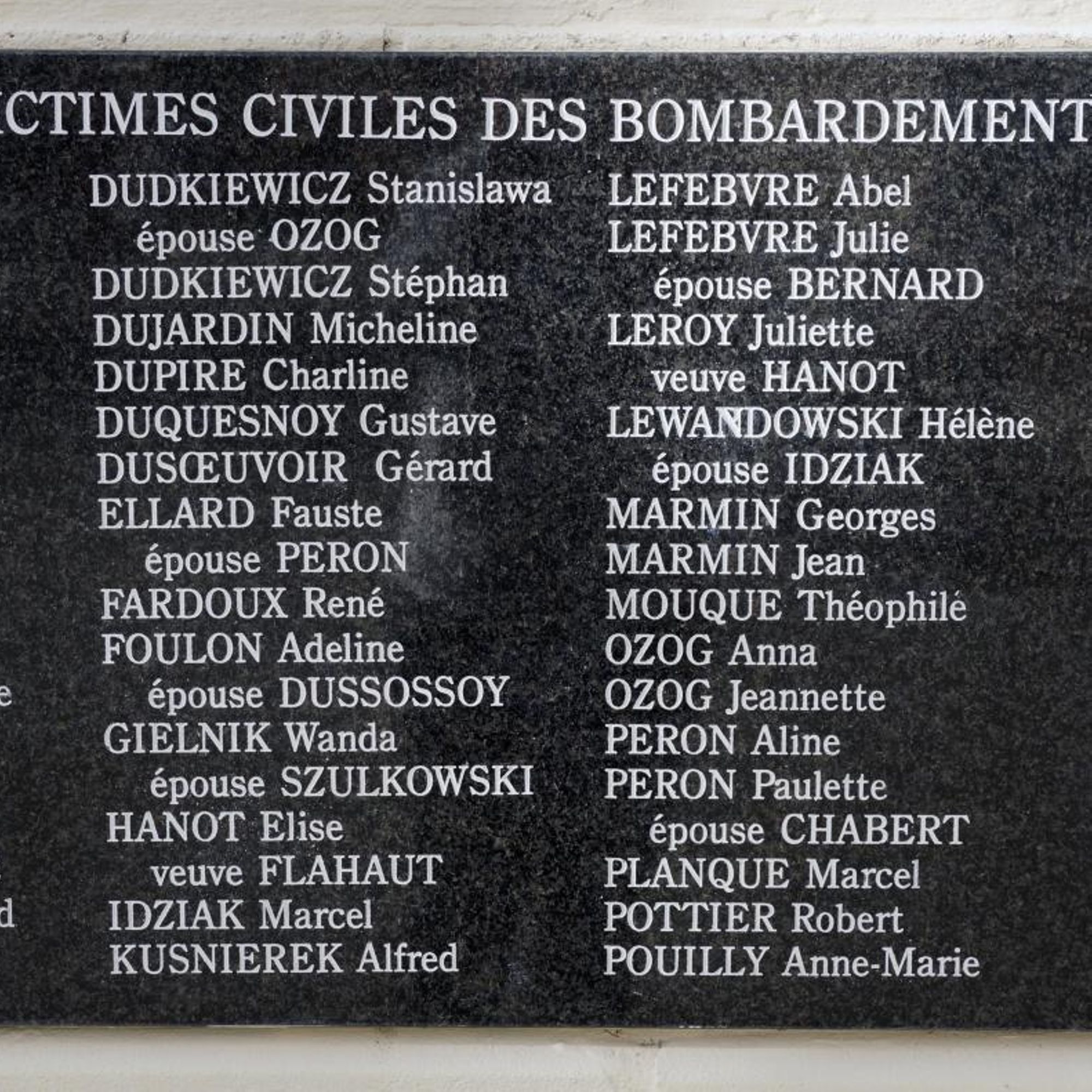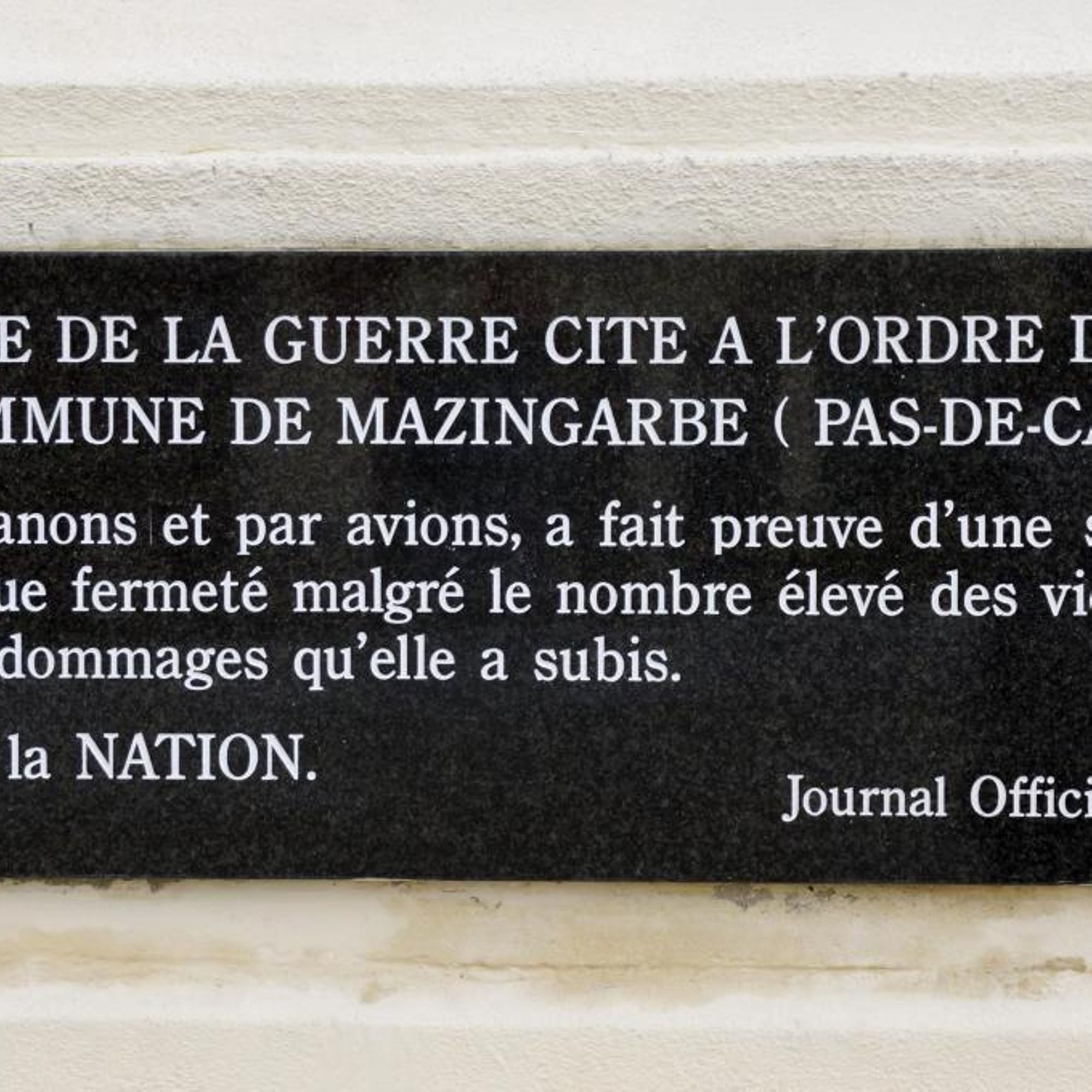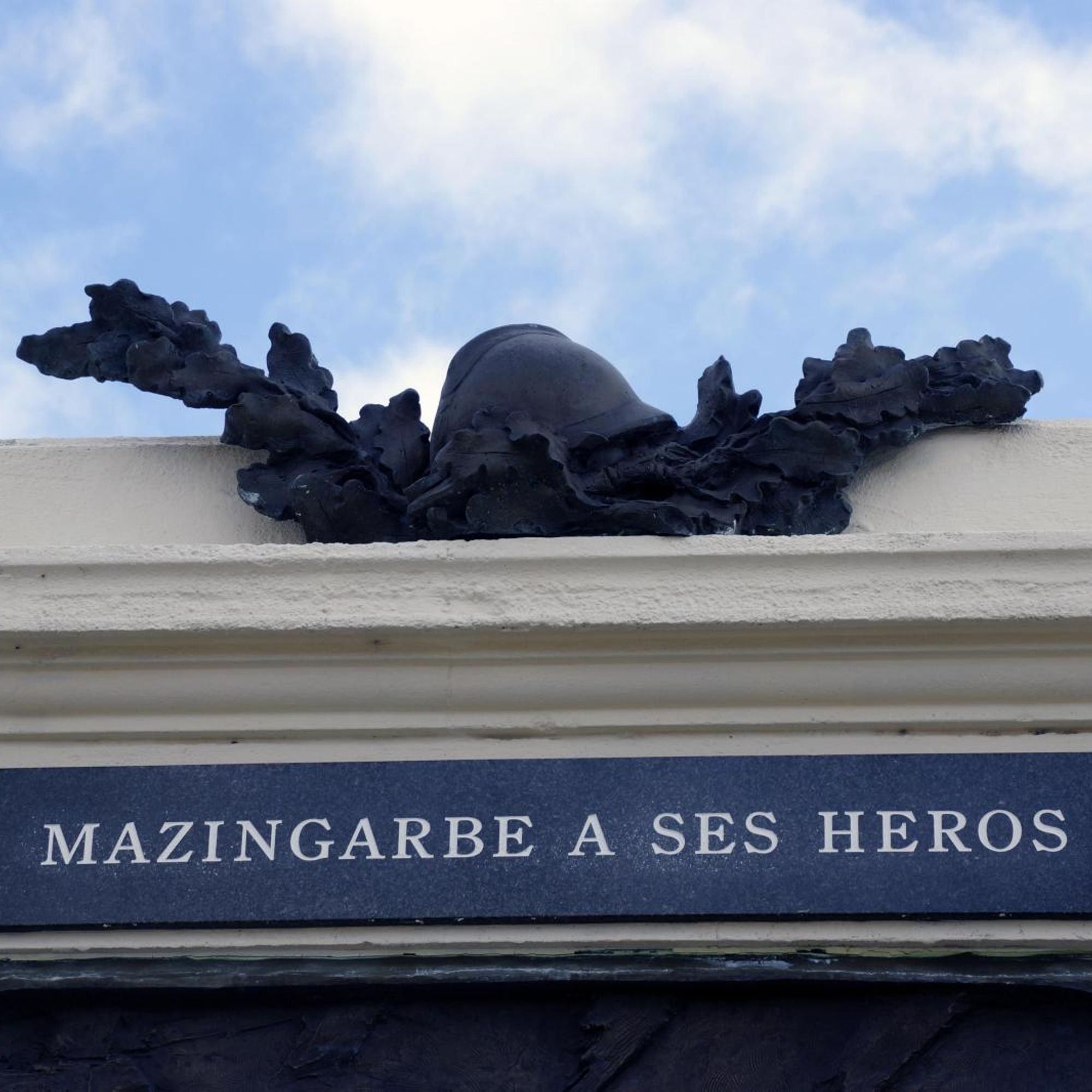 Au second plan dans le lointain, un laboureur les regarde. Au fronton, ces simples mots : « Mazingarbe à ses héros ». En bas, cette devise : « A chacun son devoir ». Et gravée dans le marbre blanc, la citation glorieuse suivante : « le ministre de la guerre cite à l’ordre du jour de l’armée la commune de Mazingarbe ; bombardée par canons et avions, a fait preuve d’une superbe vaillance et d’une patriotique fermeté ; elle a par le nombre élevé de ses victimes et les dommages qu’elle a subis, bien mérité de la nation ».