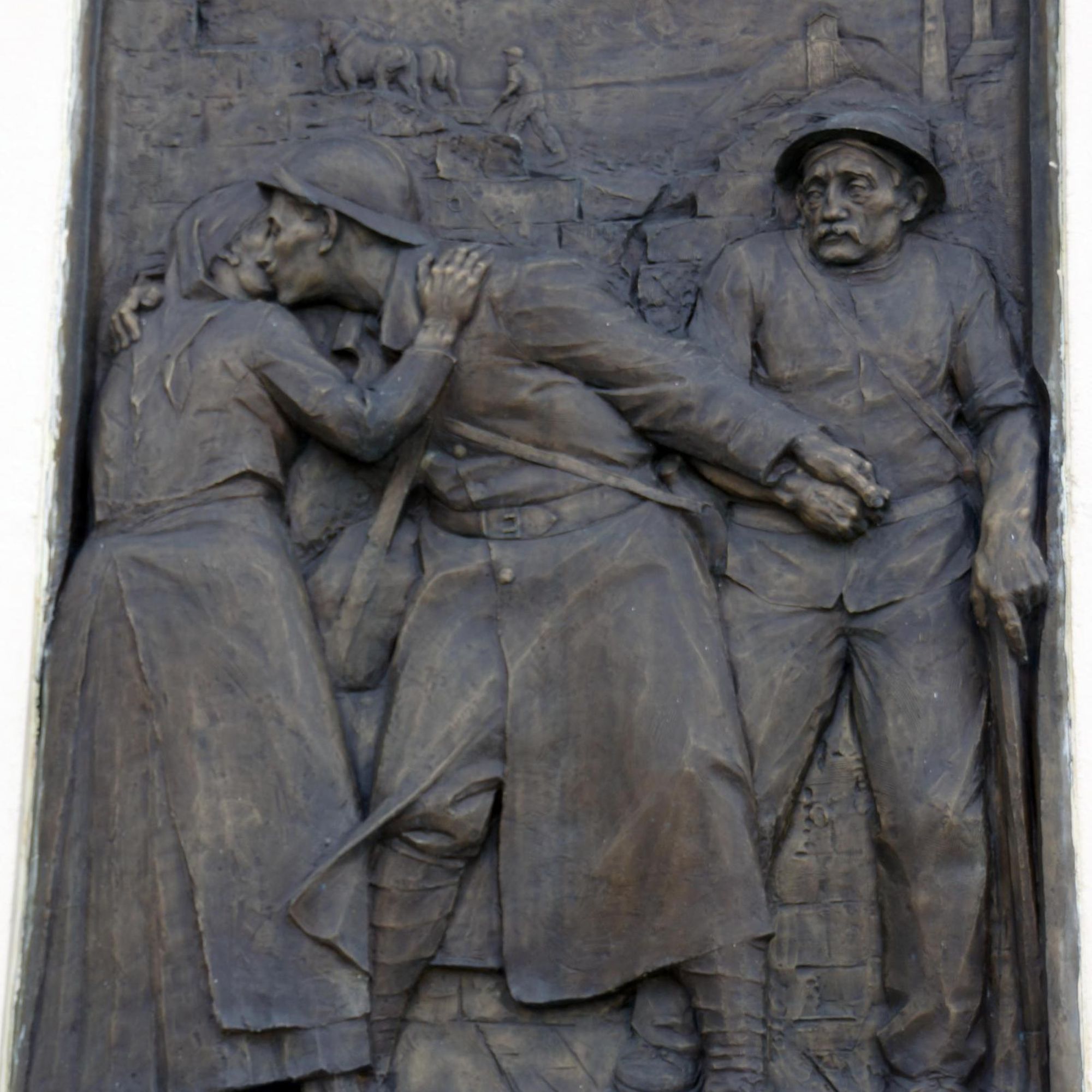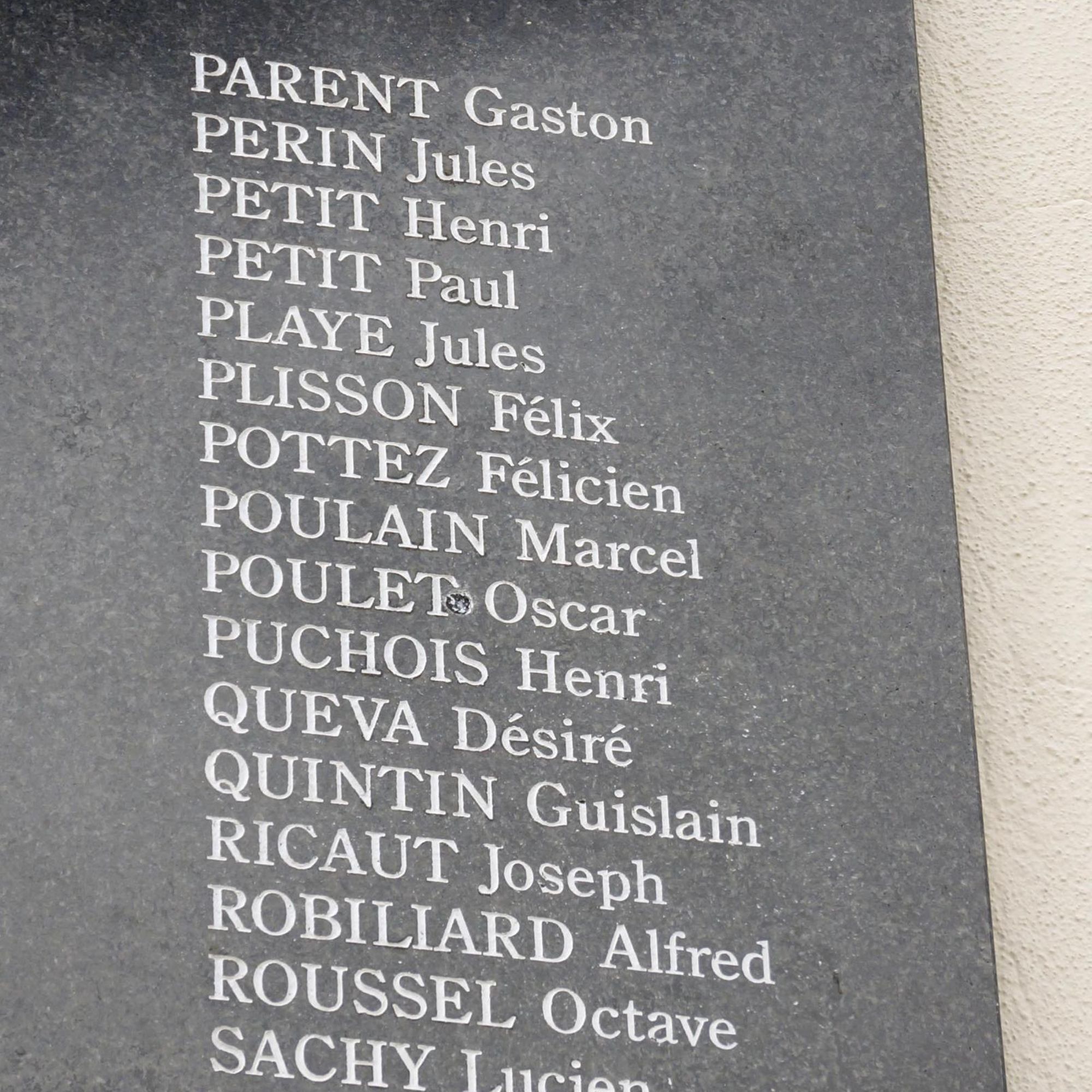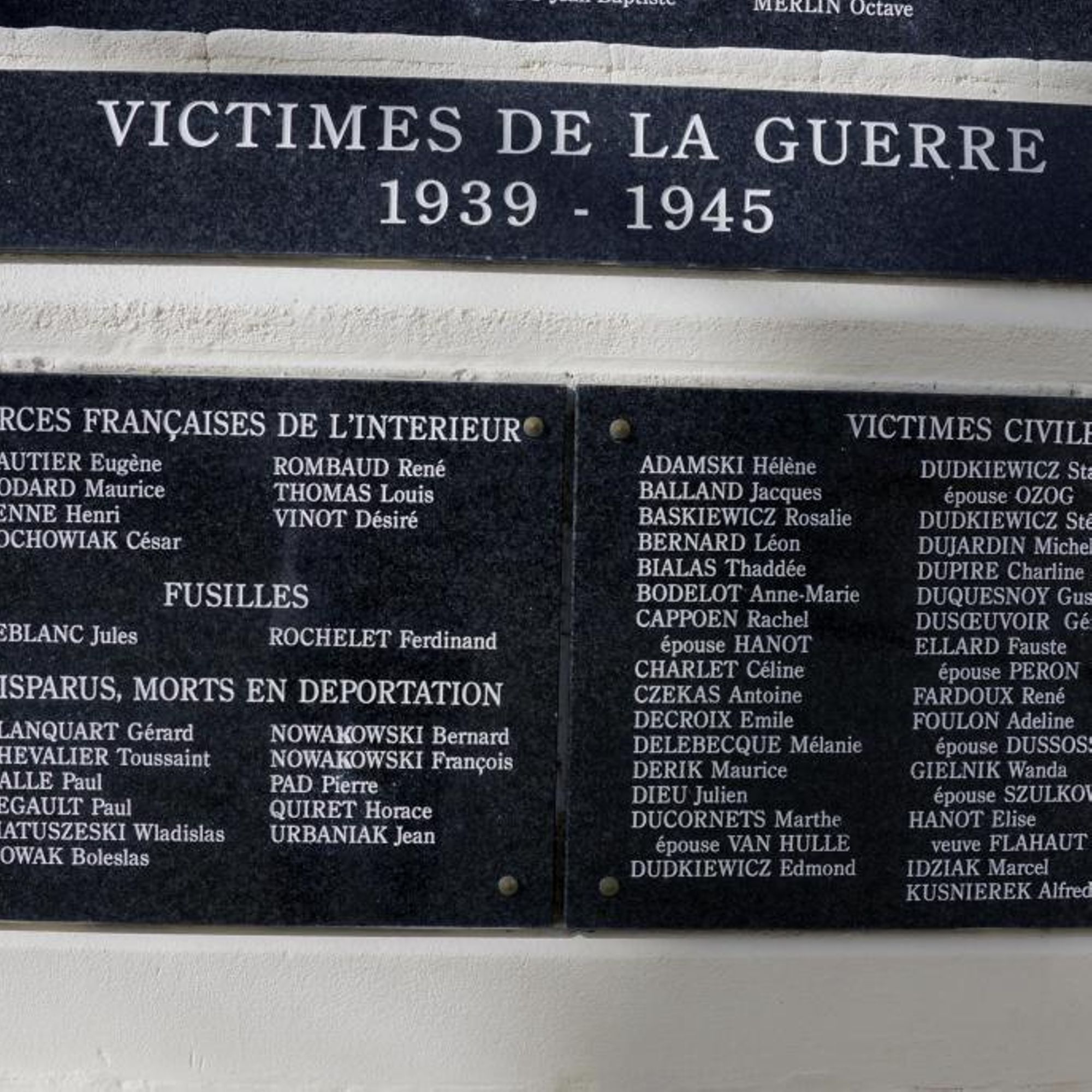 Sur la place de l’église, se dresse le monument dû au talent de M. Louis Maubert, statuaire. Encadré dans des pierres blanches, un bas-relief de bronze représente un Poilu embrassant sa vieille maman et serrant la main de son père, un vieux de la mine.