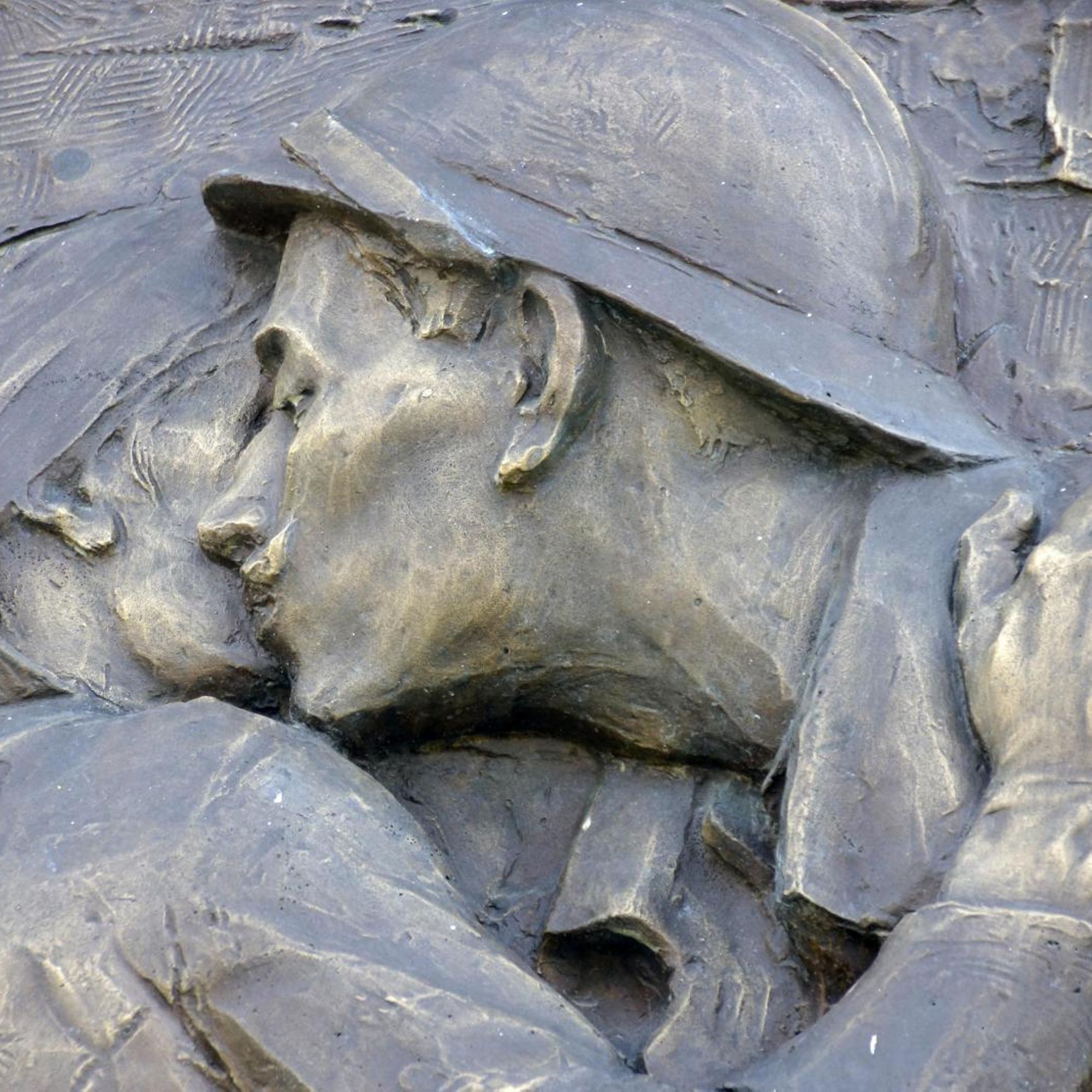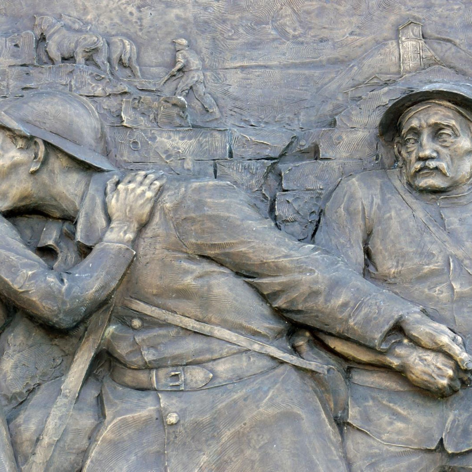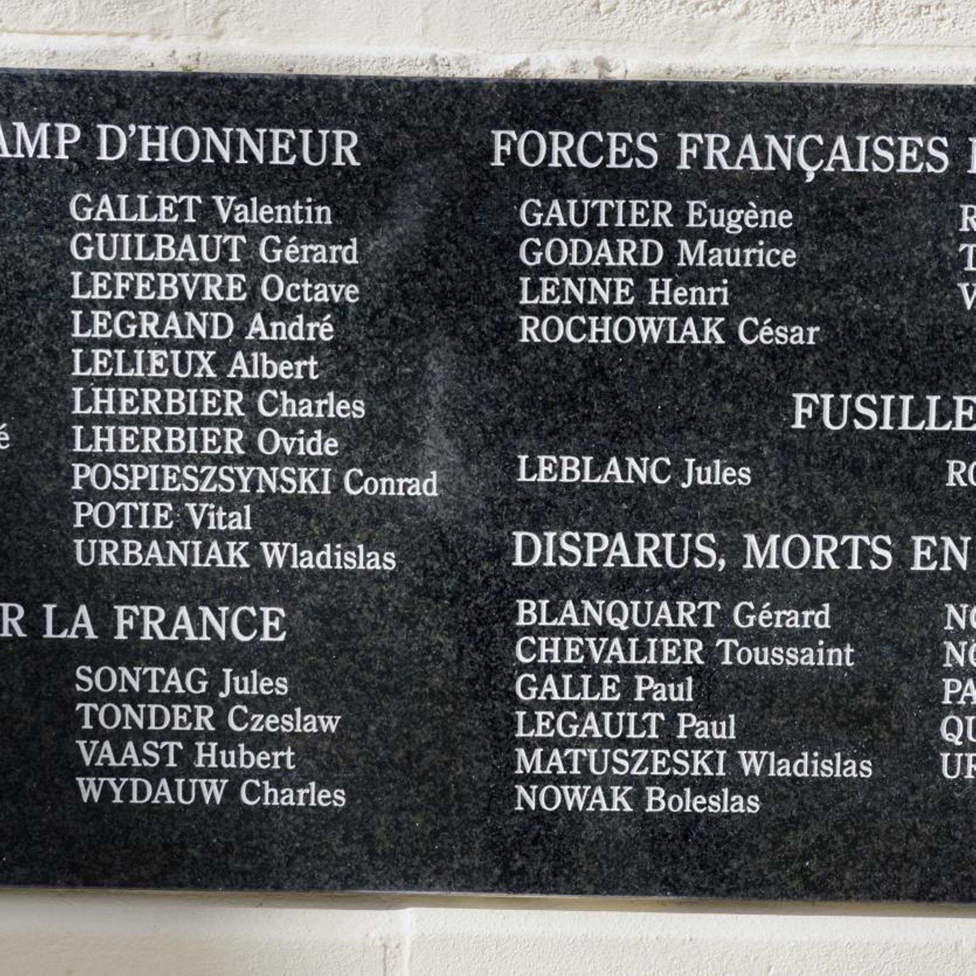 Sur la place de l’église, se dresse le monument dû au talent de M. Louis Maubert, statuaire. Encadré dans des pierres blanches, un bas-relief de bronze représente un Poilu embrassant sa vieille maman et serrant la main de son père, un vieux de la mine.