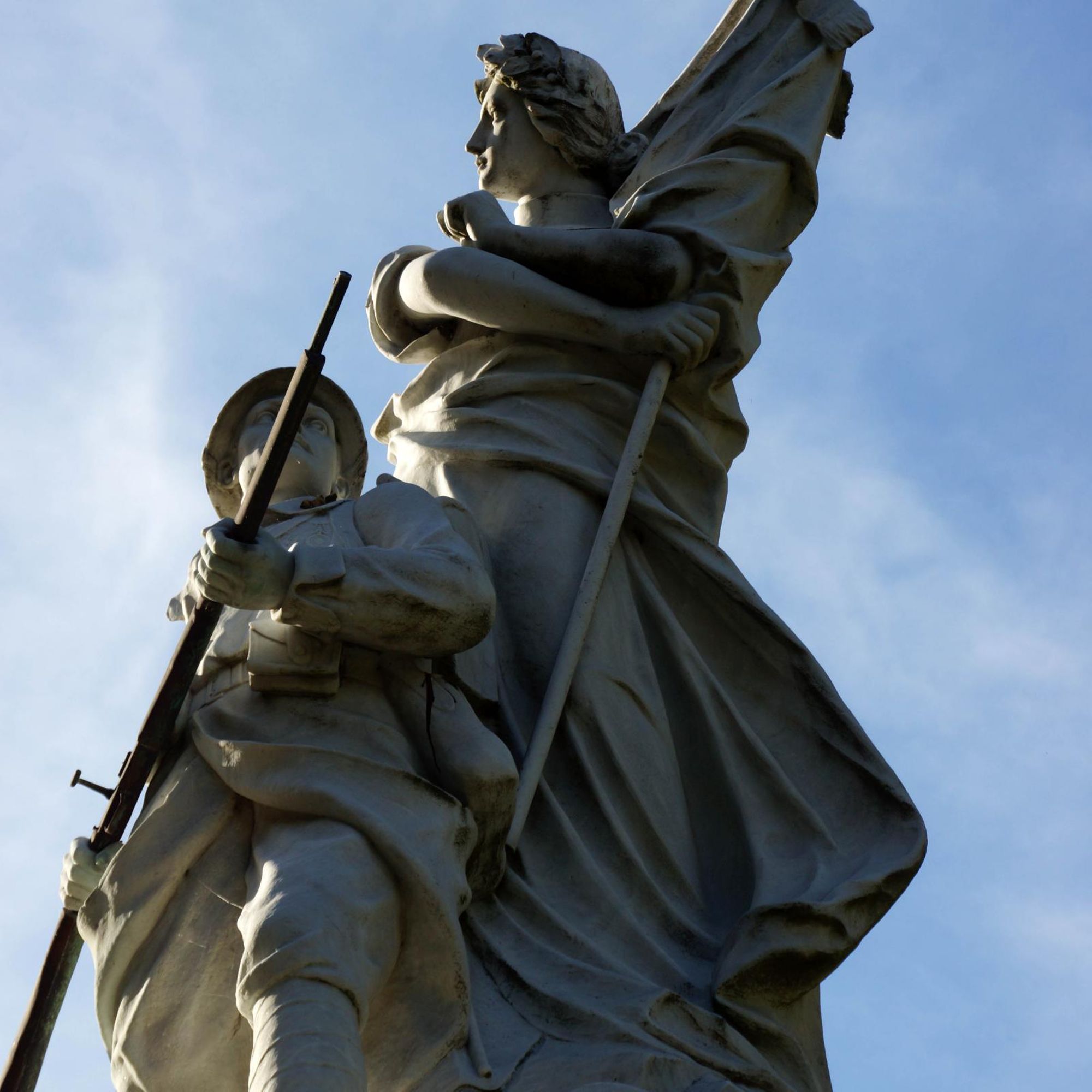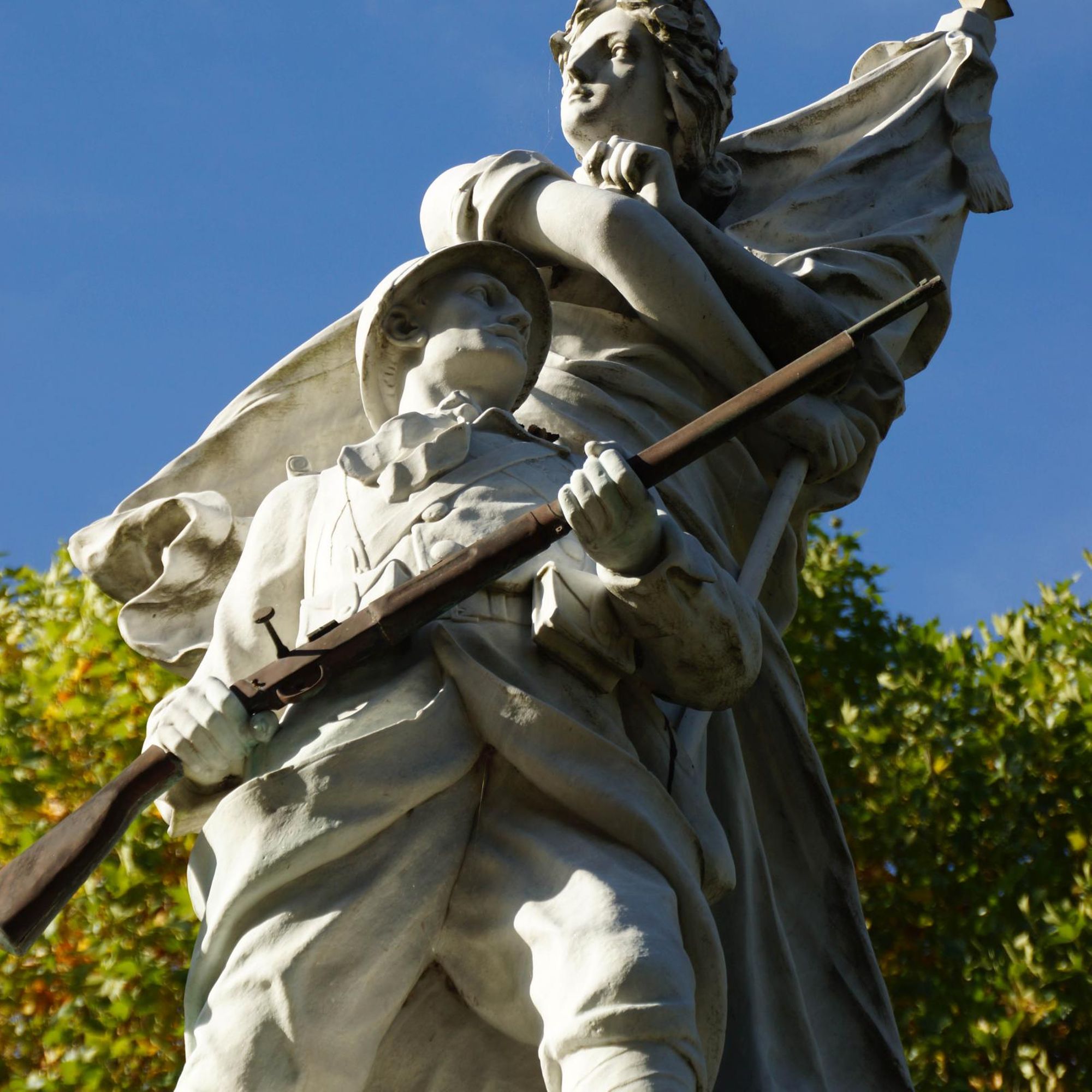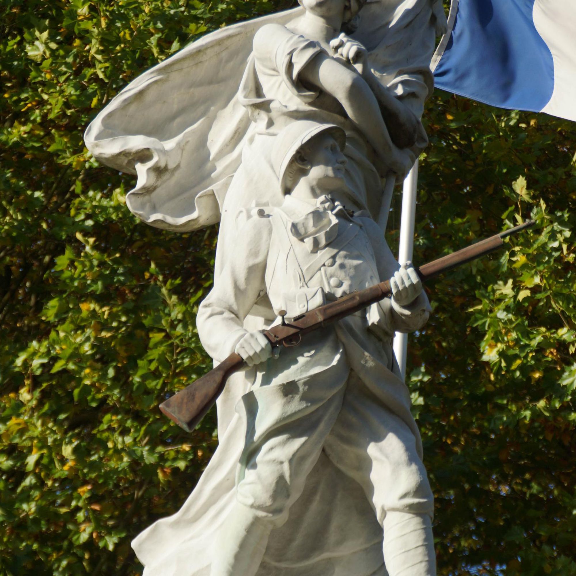 Sur un socle constitué de marches et d’une colonne se trouve la statue d’un fantassin marchant le fusil à la main.