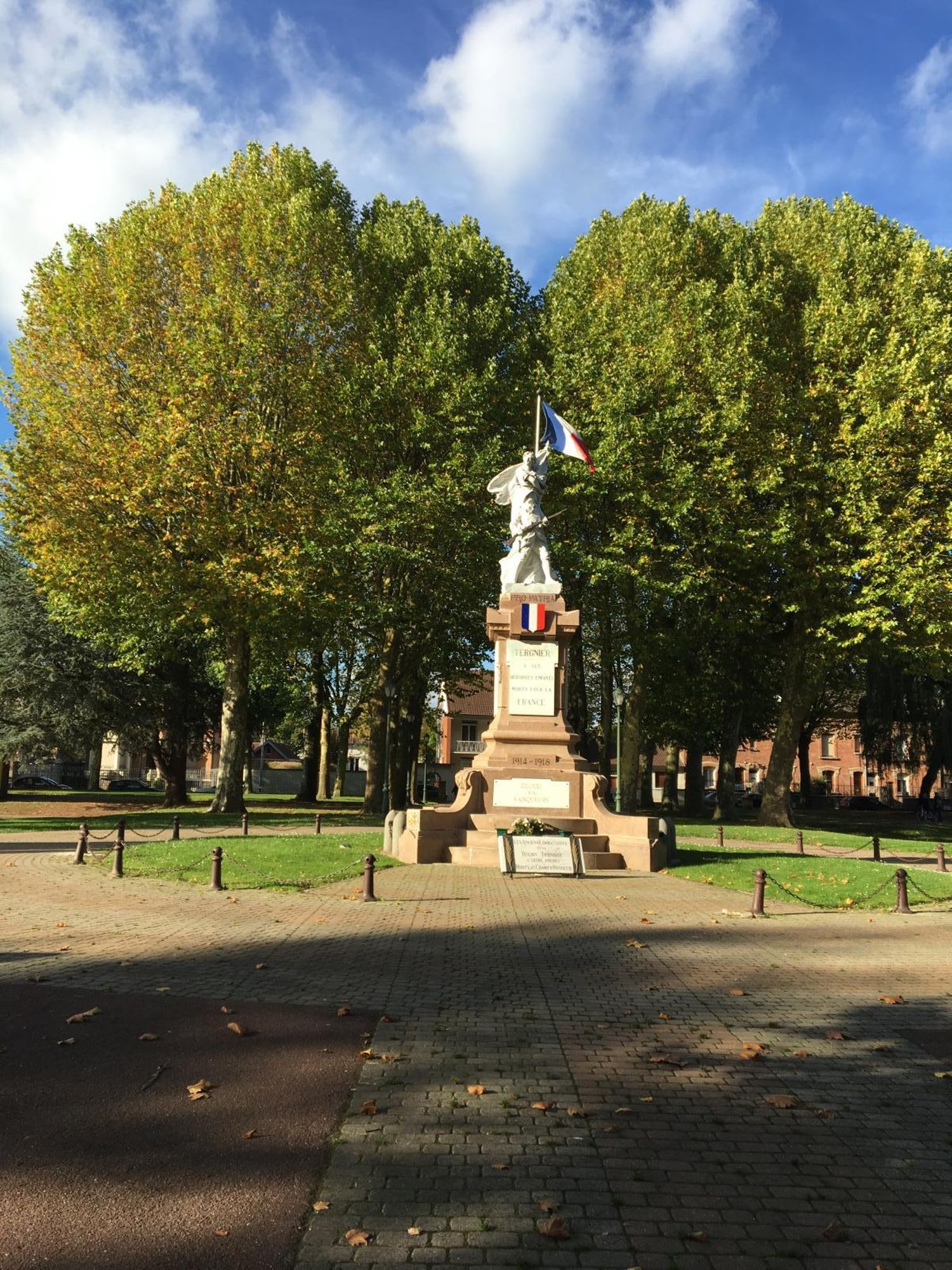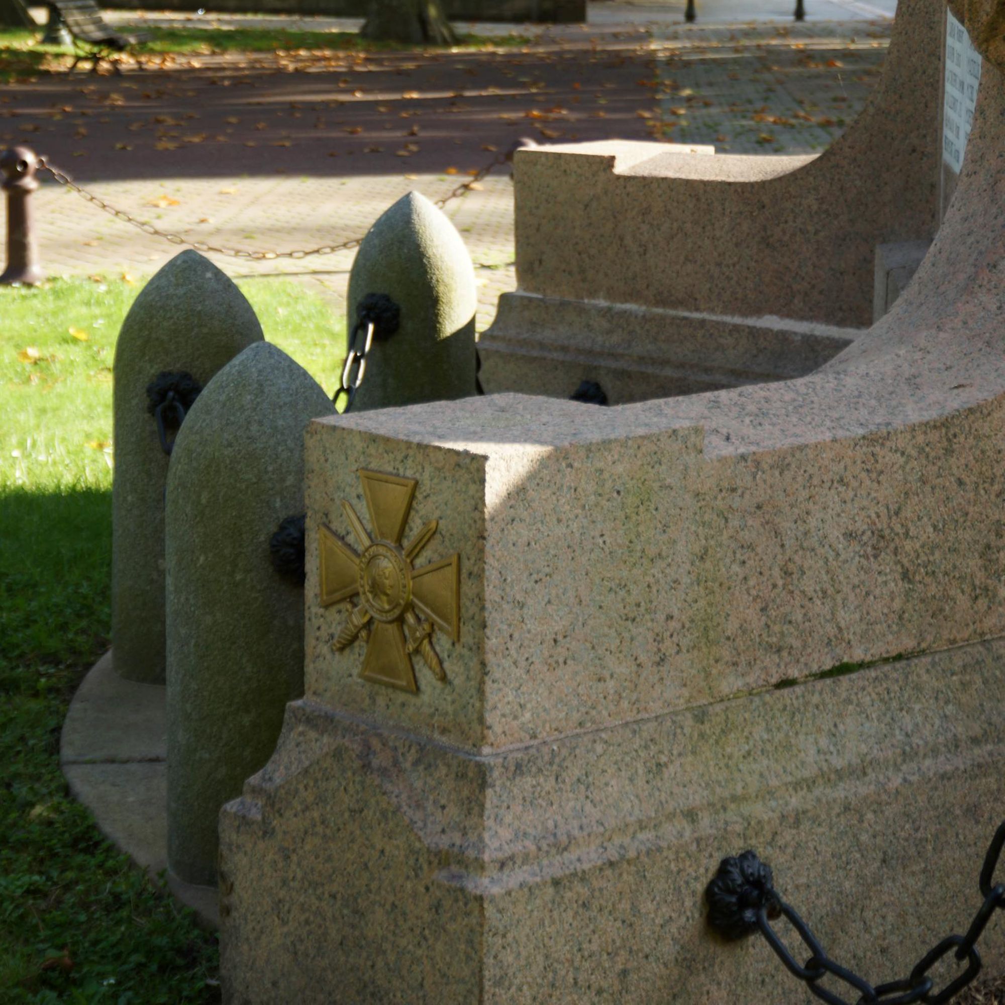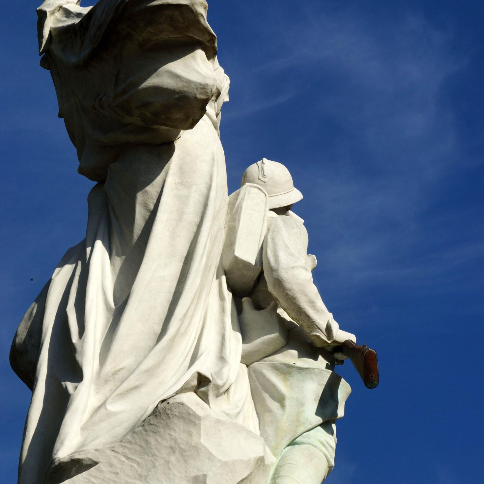 Sur un socle constitué de marches et d’une colonne se trouve la statue d’un fantassin marchant le fusil à la main.