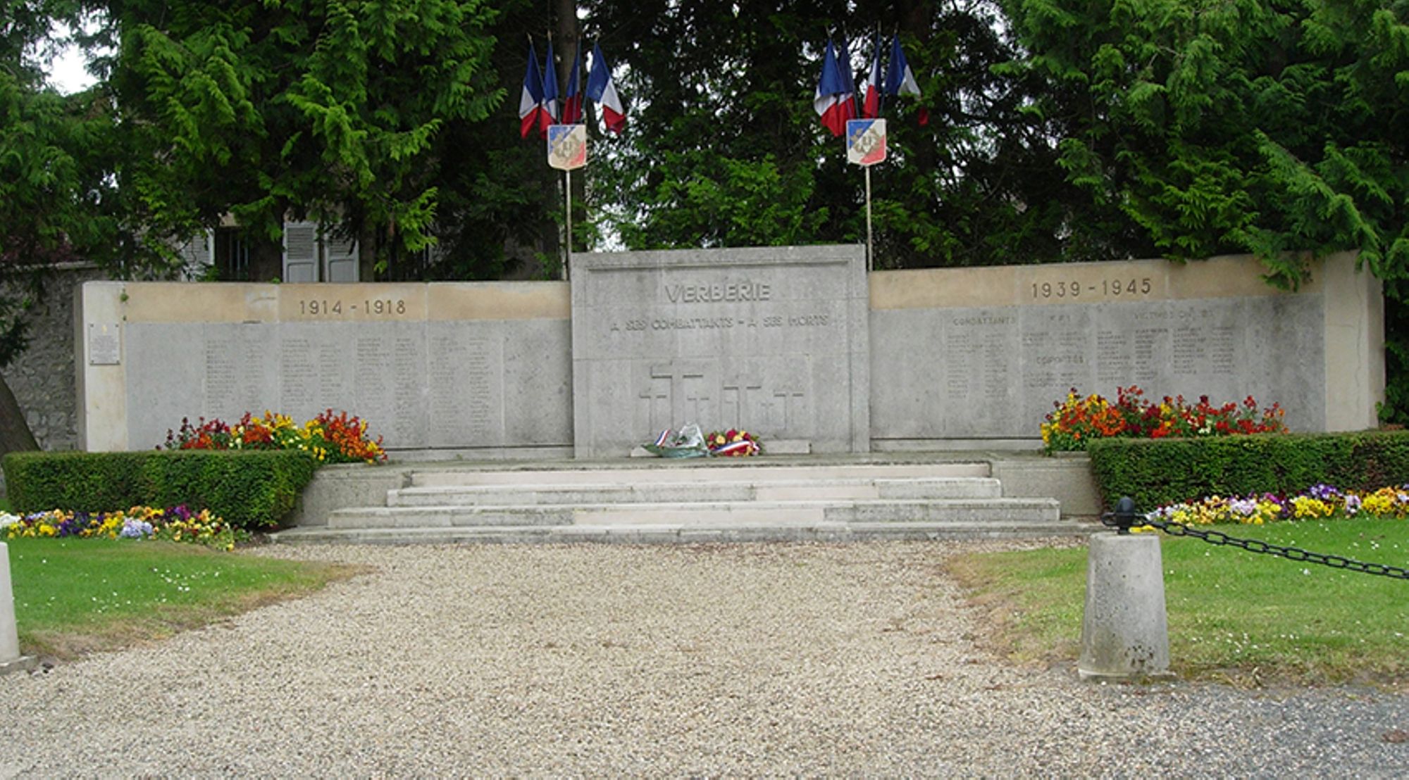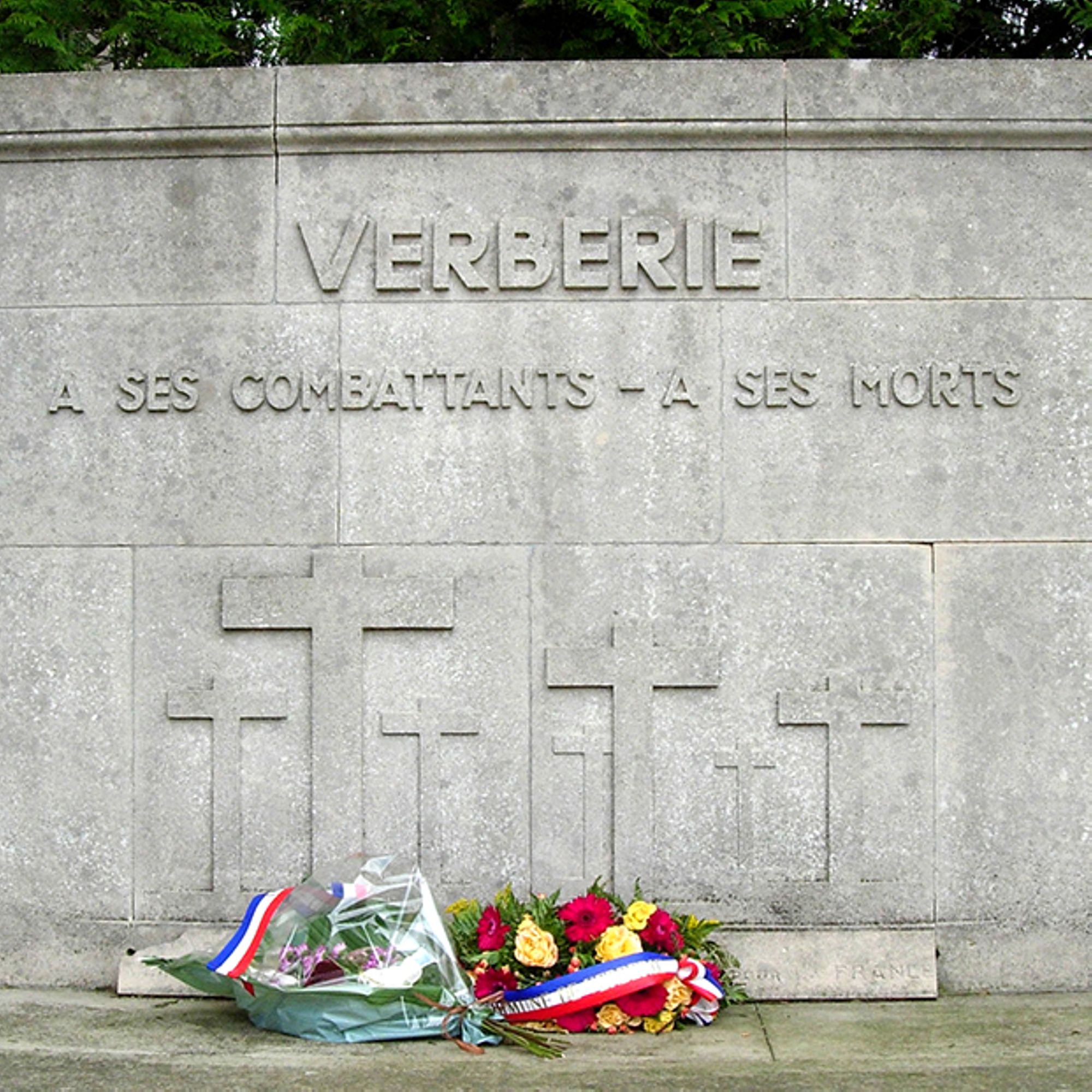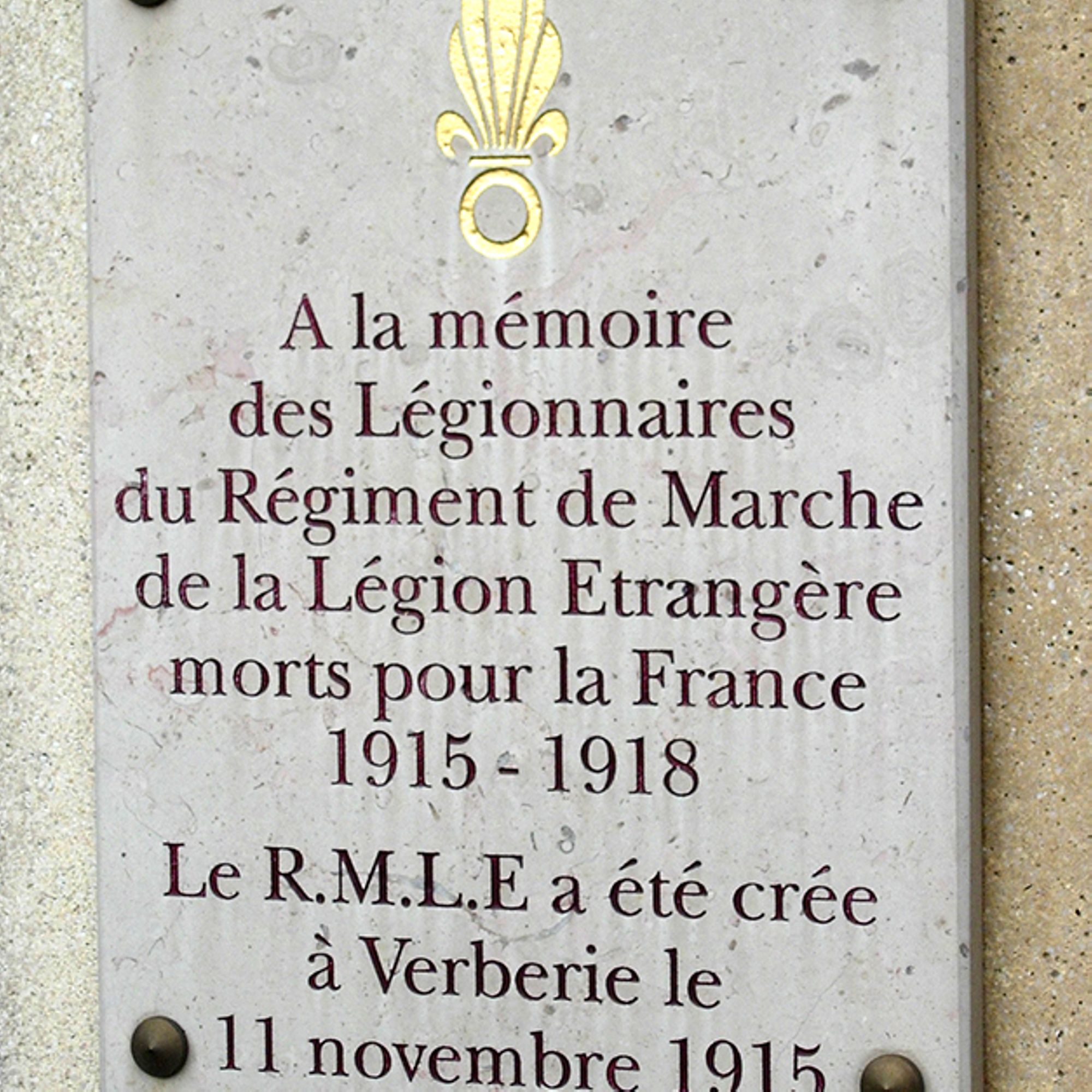 Une plaque - À la mémoire des Légionnaires du Régiment de Marche de la Légion Étrangère morts pour la France 1915-1918 Le RMLE a été crée à Verberie le 11 novembre 1915