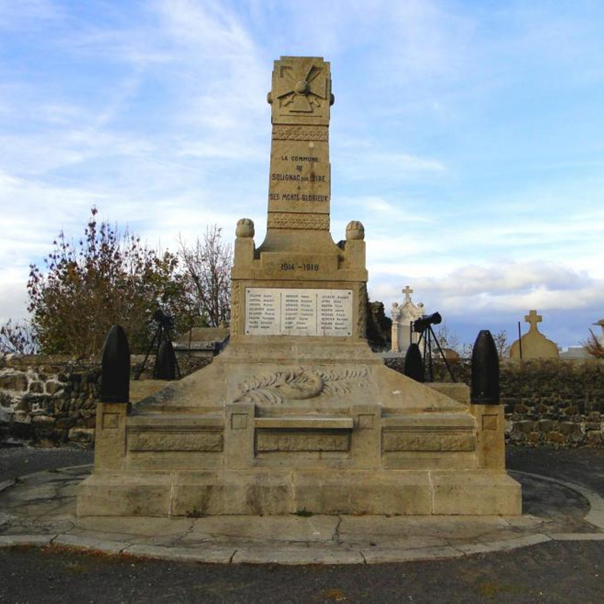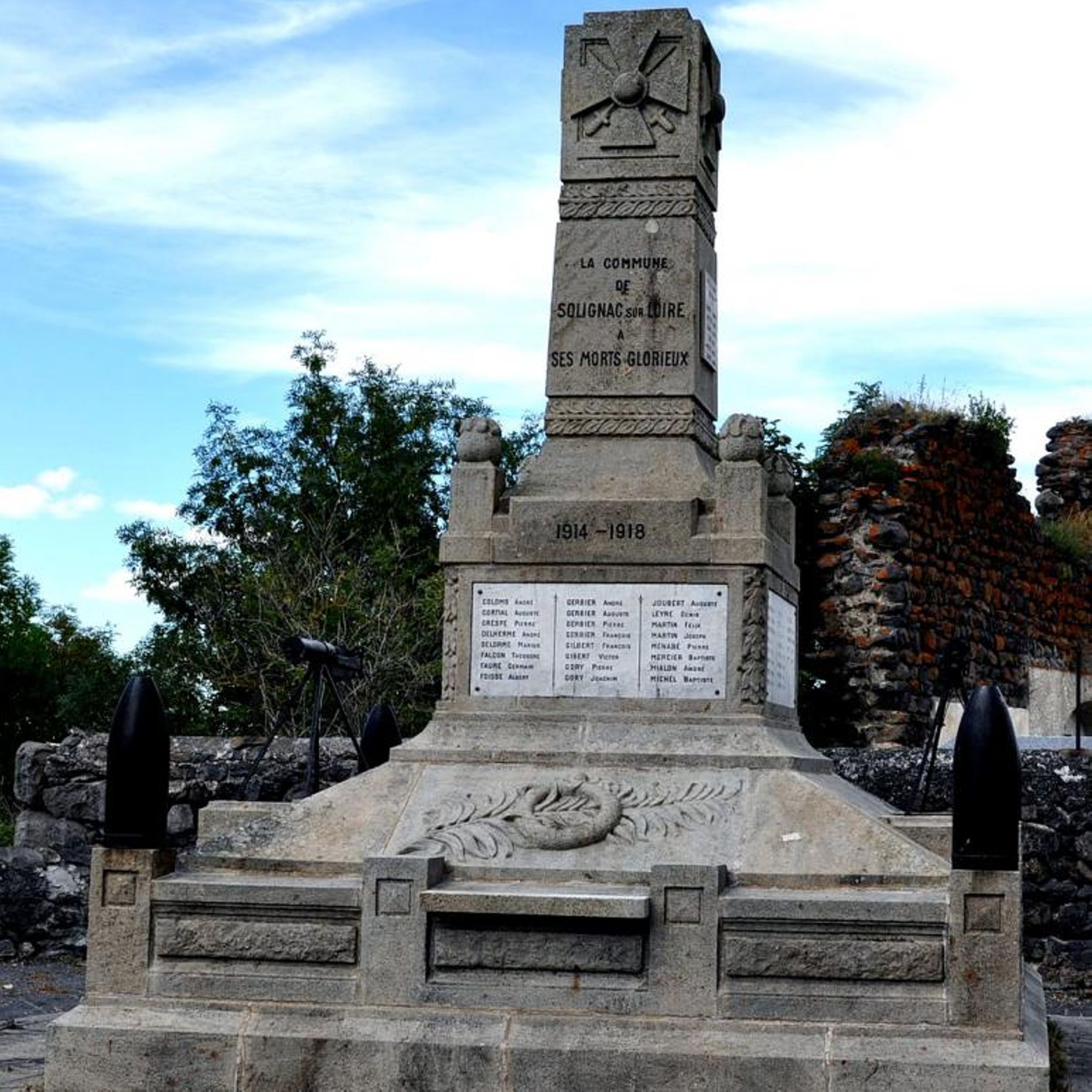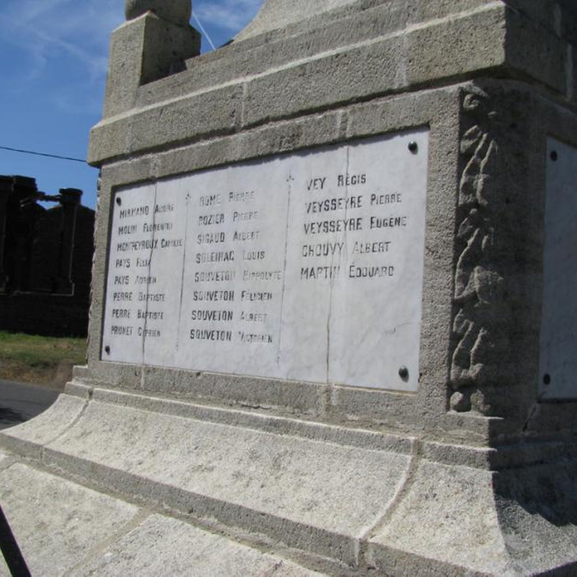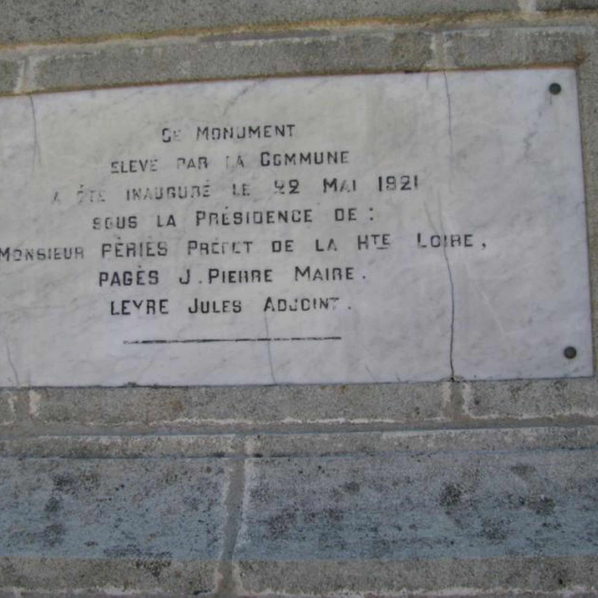 - Ce monument élevé par la Commune a été inauguré le 22 mai 1921 sous la présidence de : Monsieur PÉRIÈS préfet de la Haute-Loire, PAGÈS J. Pierre, maire, LEYRE Jules Adjoint