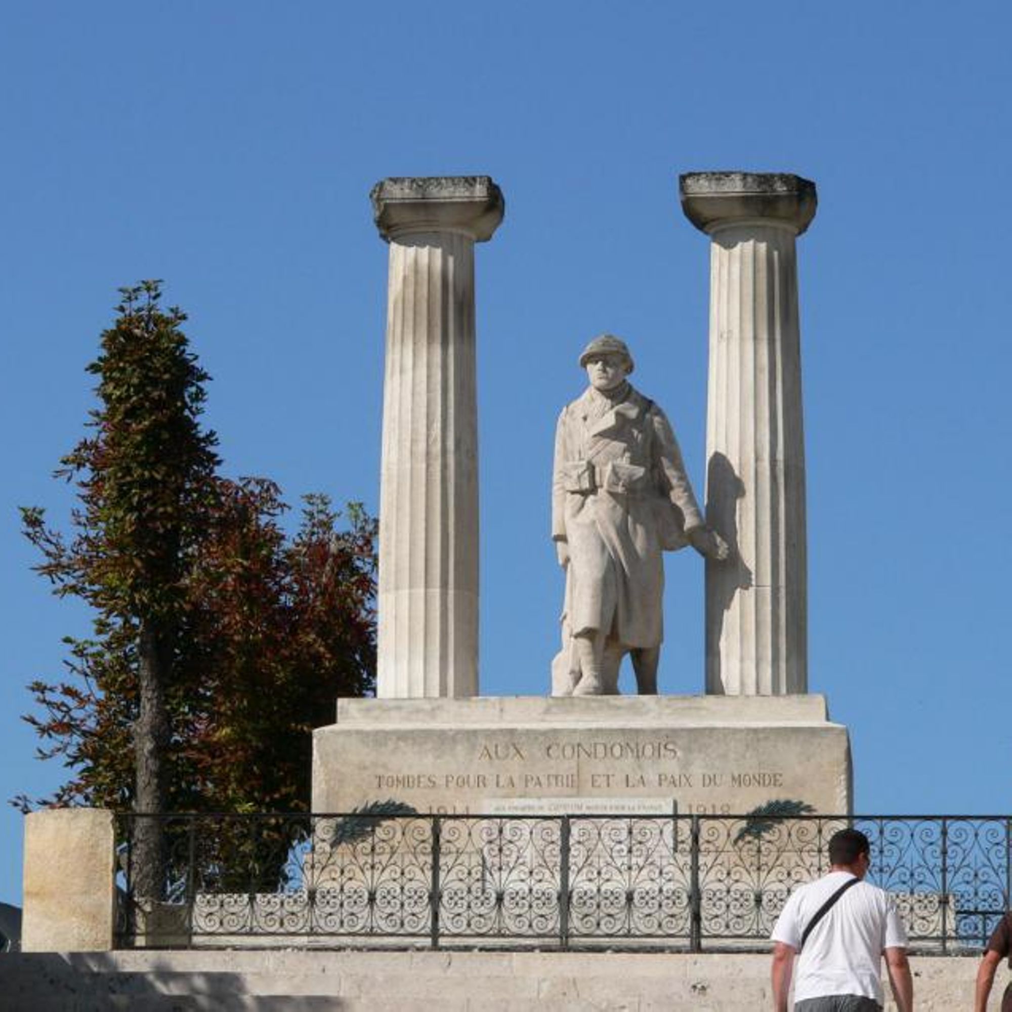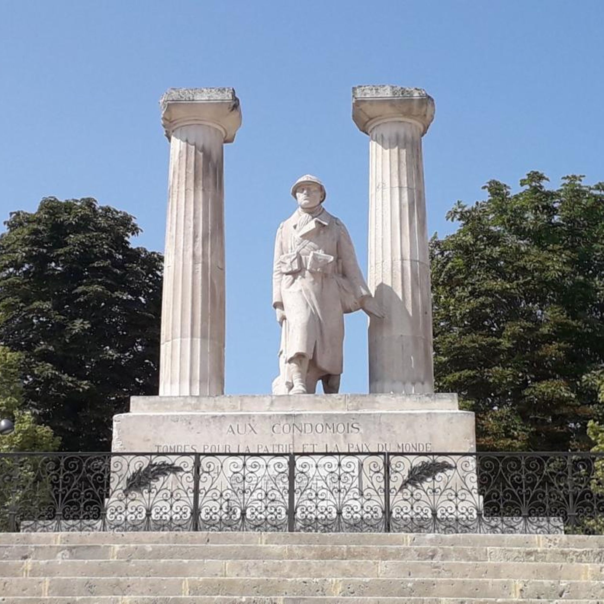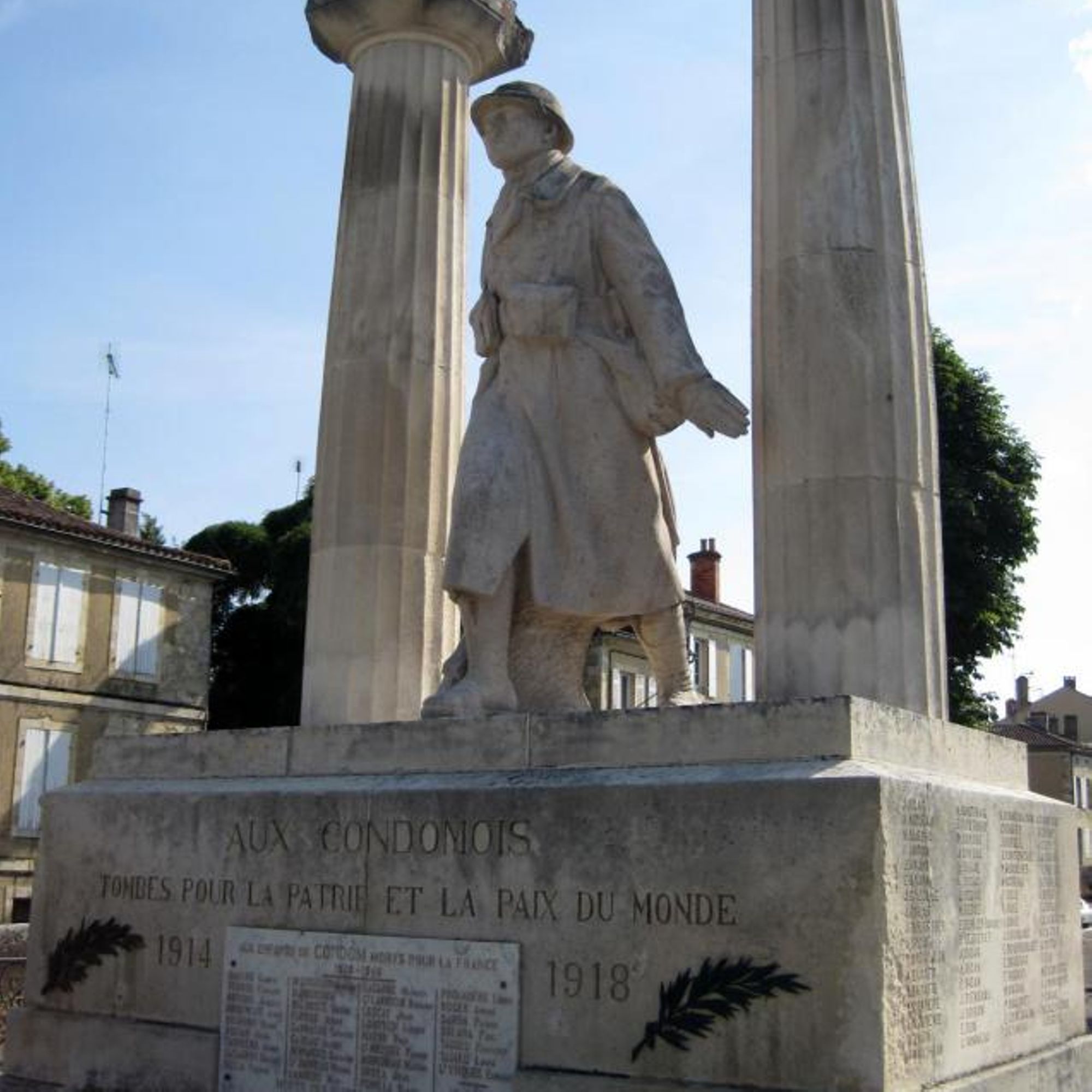 Le monument est ceint d'une grille en fer forgé très ouvragée délimitant l'espace sacré. Il est constitué par un imposant socle en pierre portant une statue de Poilu, monumentale, encadré par deux colonnes antiques. Cette référence inscrit le monument dans l'héritage romain présent à travers une vaste villa gallo-romaine à quelques kilomètres de la ville. Allusion au patrimoine antique, localisation par rapport au centre médiéval, le monument s'inscrit dans la longue durée de l'histoire de la commune.