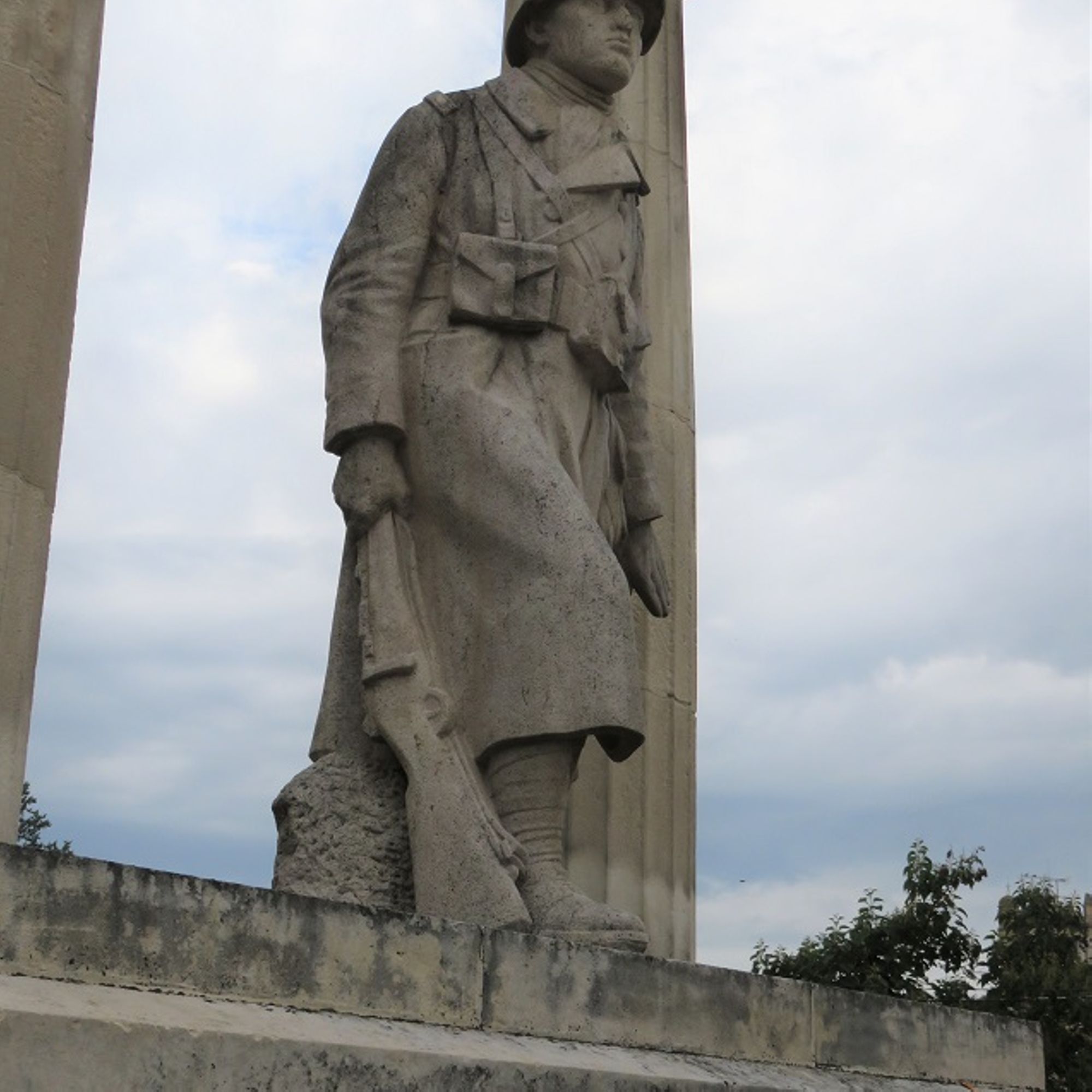 Le soldat adopte une position de marche. Il avance, le corps penché, protégeant de sa main gauche ce qui se trouve derrière lui, à savoir la promenade et donc la communauté des habitants. Il tient en arrière son fusil de la main droite, mais crosse à terre et canon dans le dos. Malgré son visage grave et fermé il montre une attitude de défense et non d'assaillant. Le rôle de l'armée de la conscription qui a mobilisé huit millions d'hommes s'affirme pleinement dans cette représentation du soldat défenseur le regard tendu vers les frontières du nord-est.