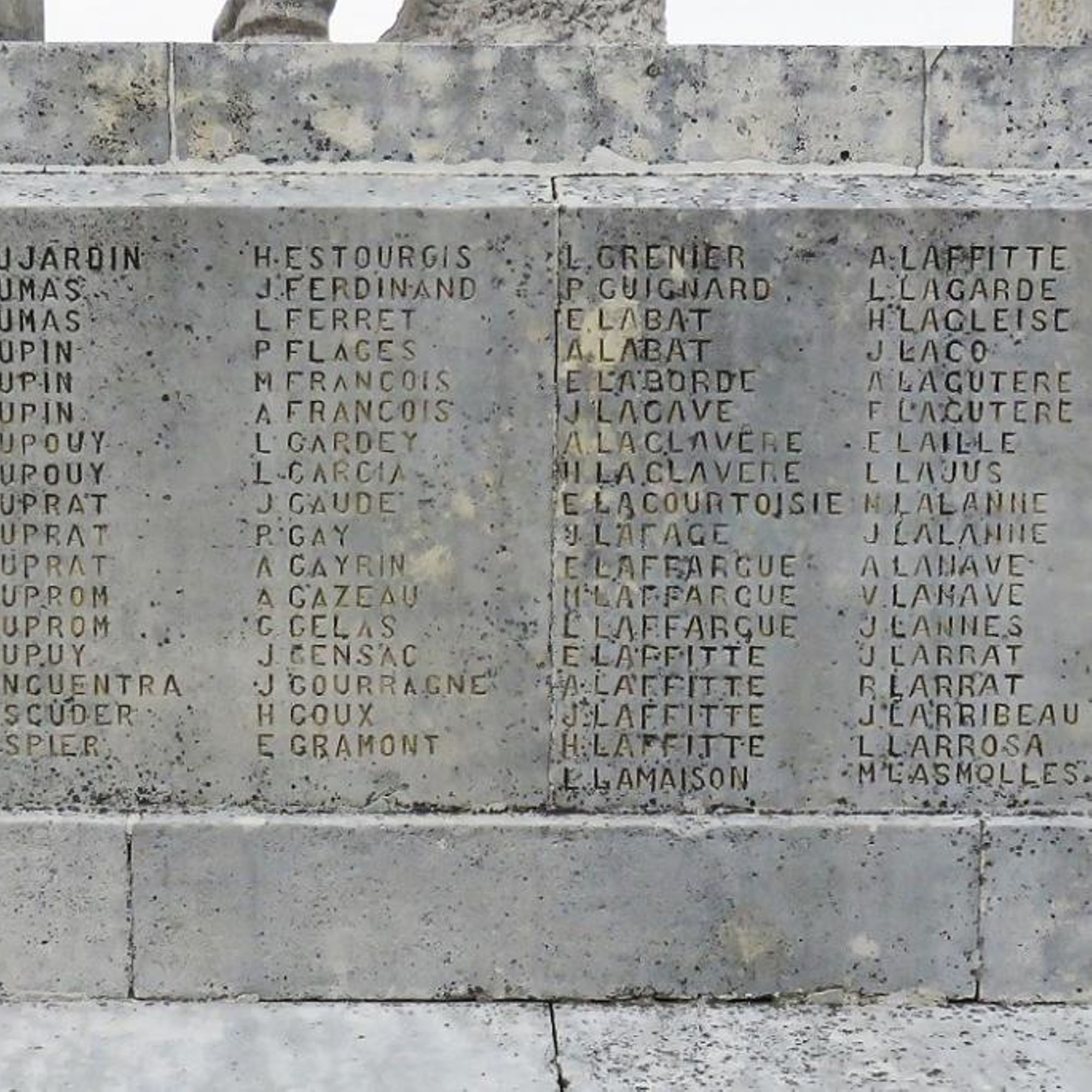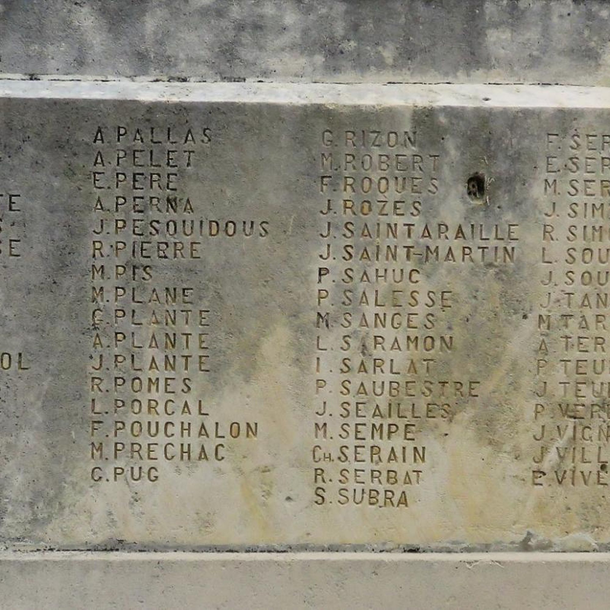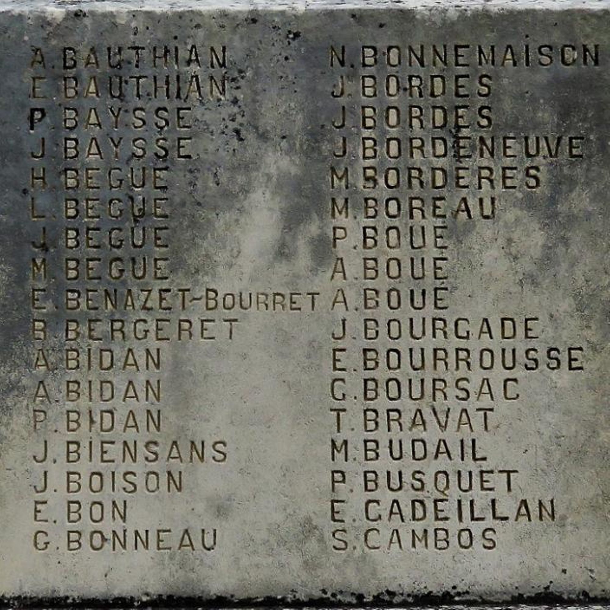- Les noms des morts – 266 – sont gravés sur les côtés et l'arrière du socle, rangés par ordre alphabétique avec seulement l'initiale pour le prénom.
