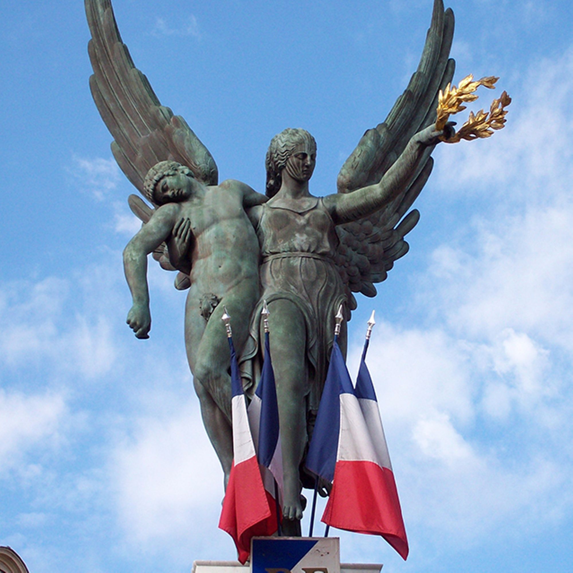 La position en déséquilibre des deux personnages, le vide sous leurs pieds, et les formes flottantes du drapé semblent effacer la pesanteur et donnent au monument une impression de légèreté.