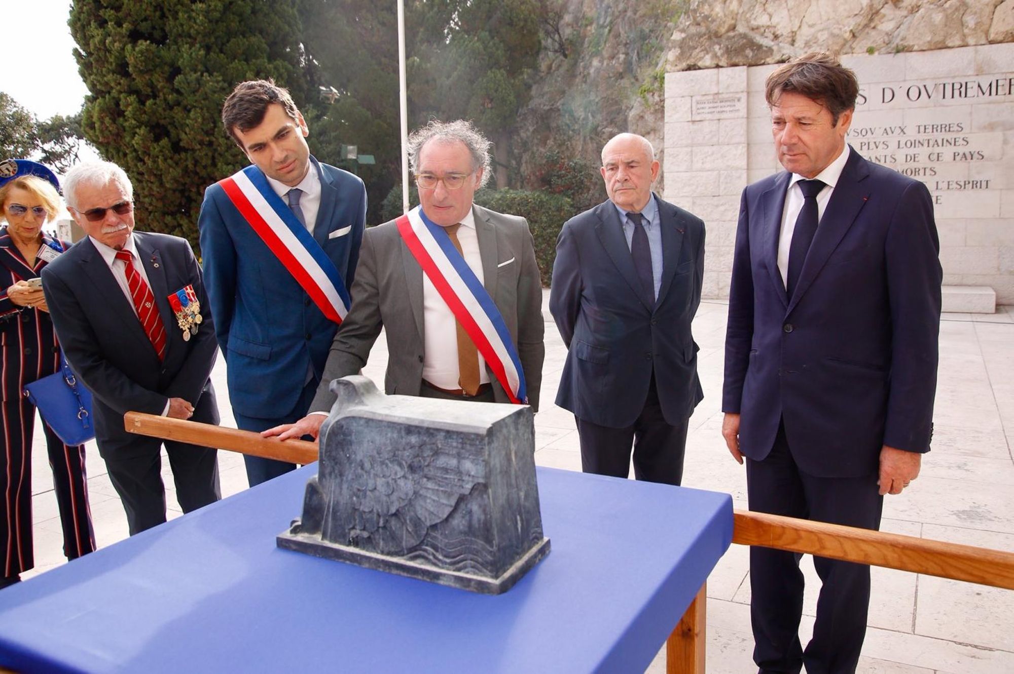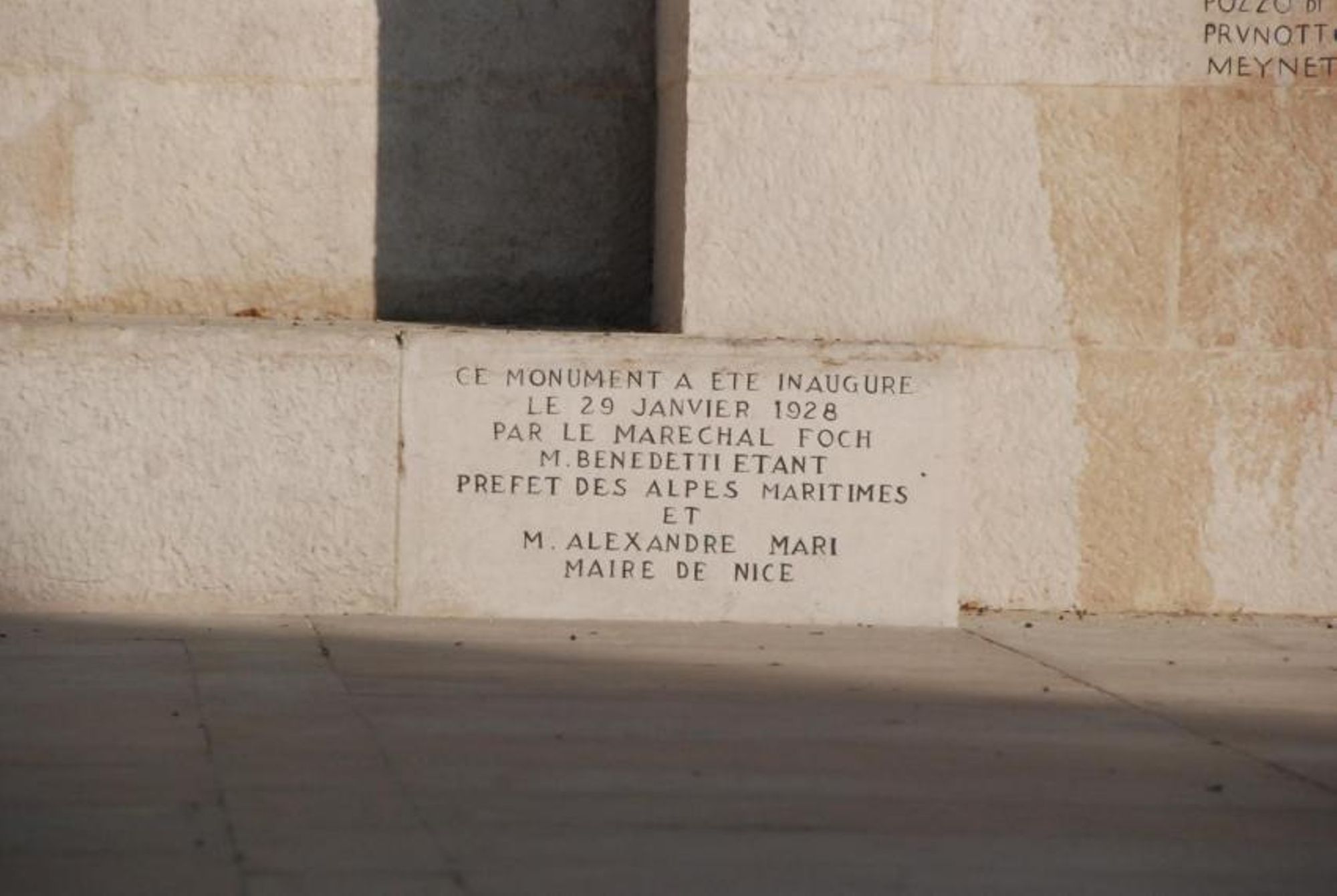 Le Monument aux Morts fut inauguré le 29 janvier 1928 par le Maréchal Foch, salué par la foule des Niçois, mais aussi par des officiers de marine anglais, américains et italiens dont les bateaux étaient ancrés dans la rade de Villefranche.