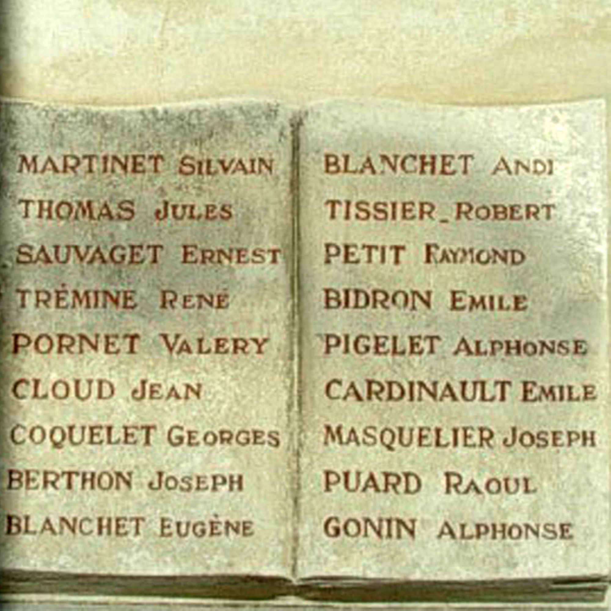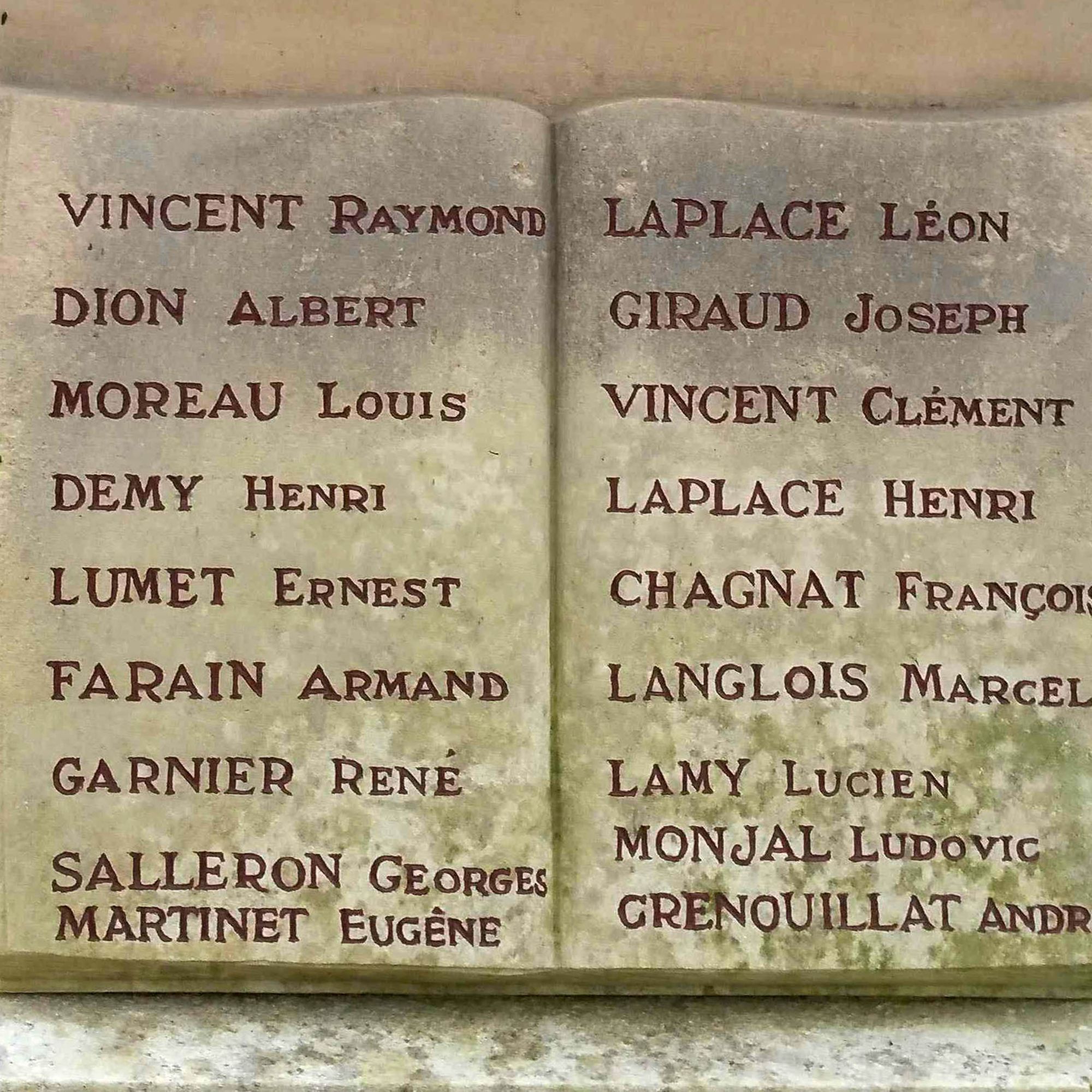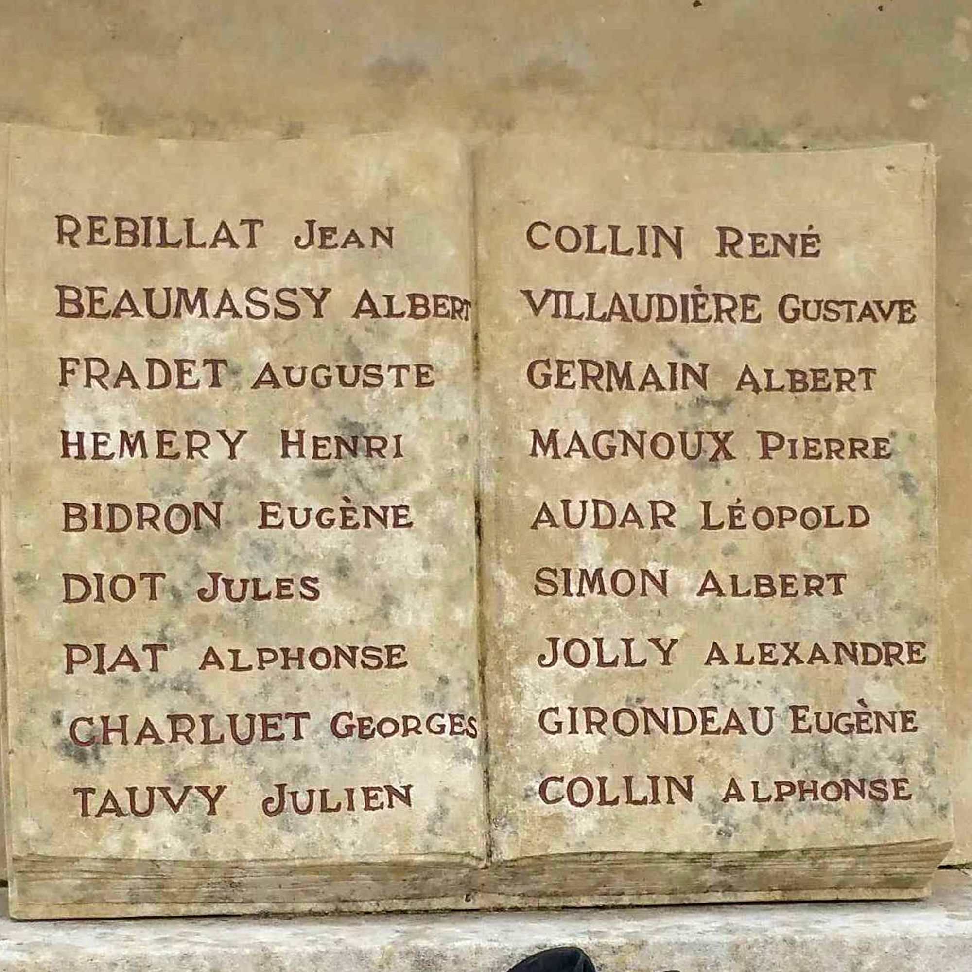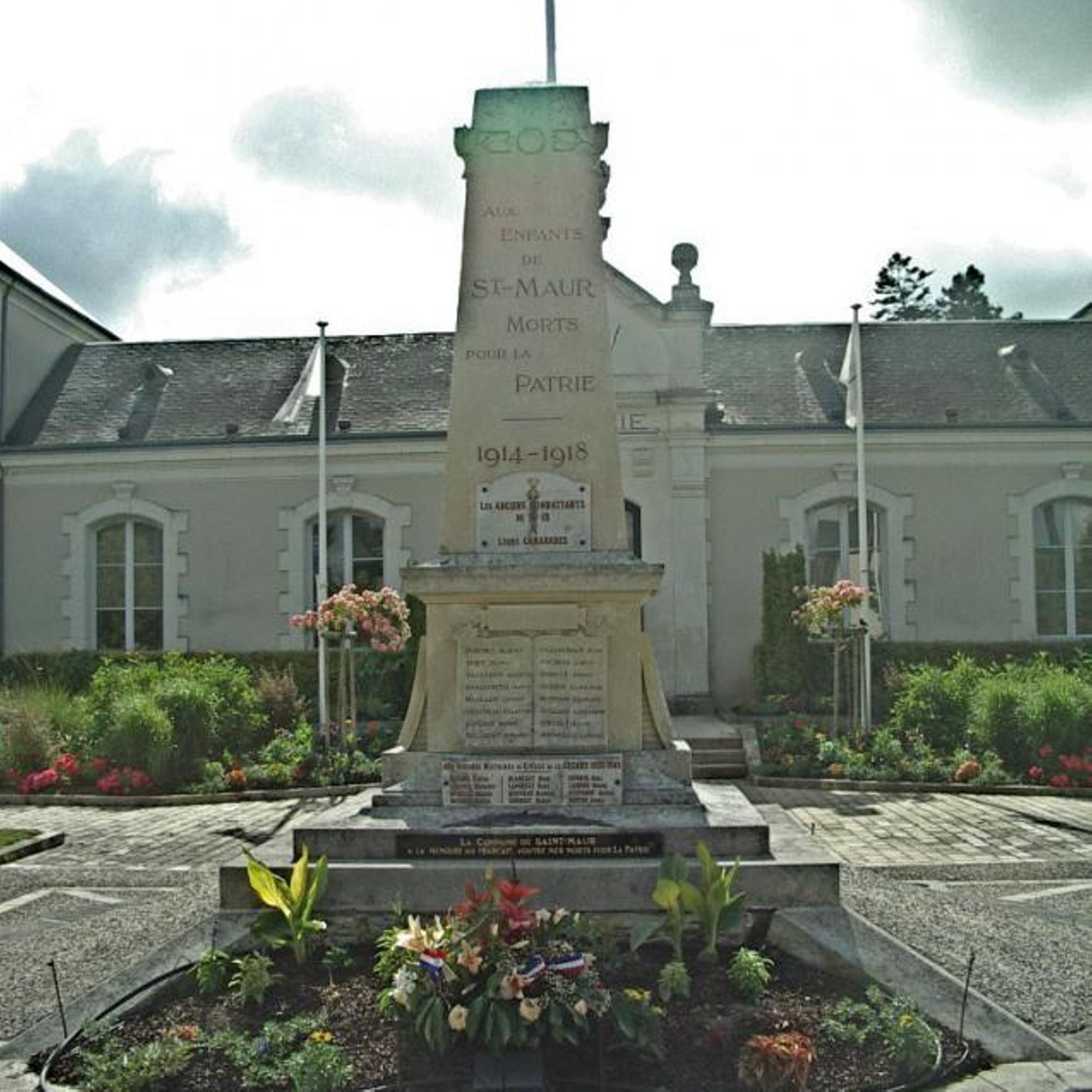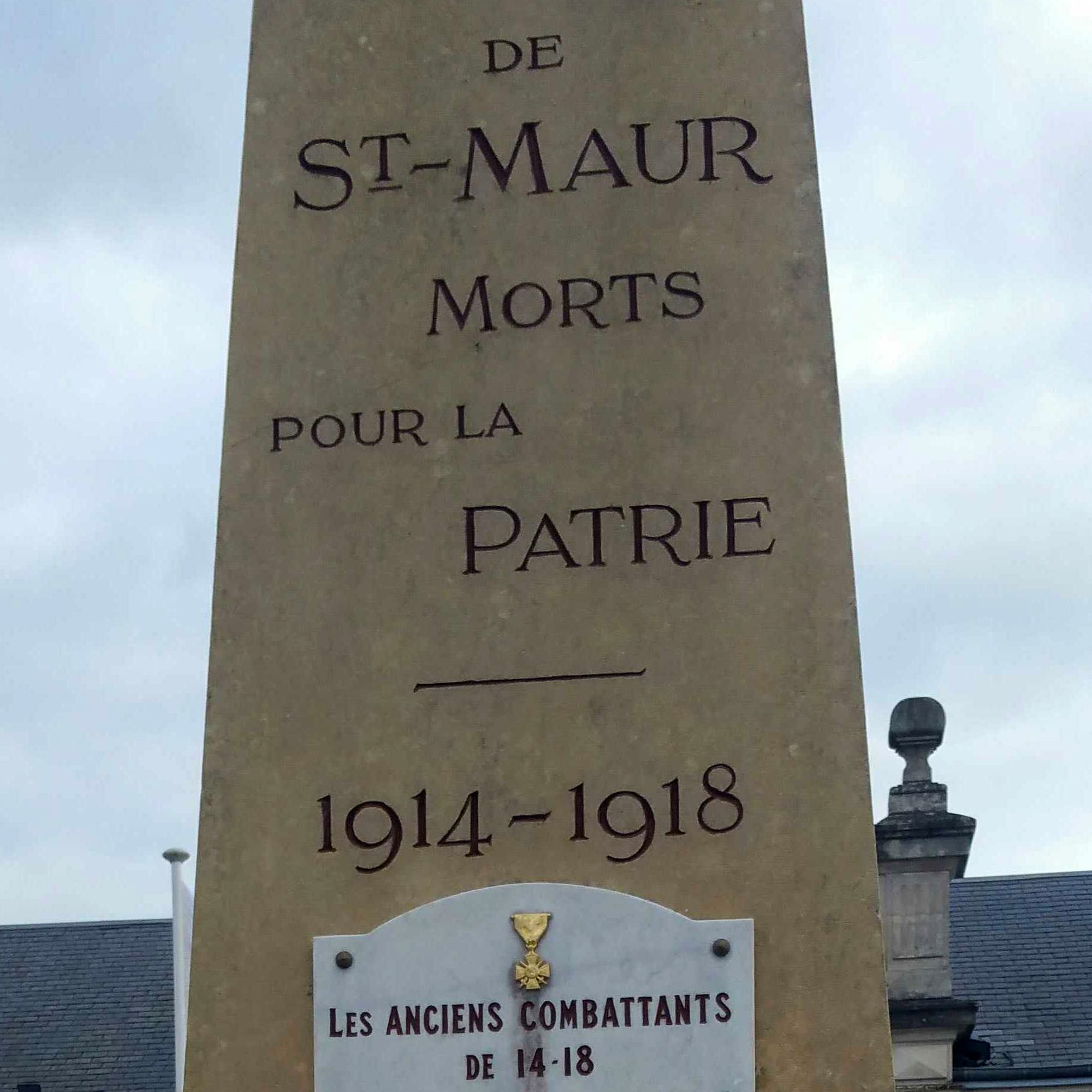 En dessous de la stèle, sur les quatre faces du socle rectangulaire, des livres ouverts portent gravés les noms des enfants de Saint-Maur, morts pendant la grande guerre : 69 noms. Le livre de la face antérieure est le seul à être surmonté d’un cartouche portant la mention “PRO PATRIA”.
