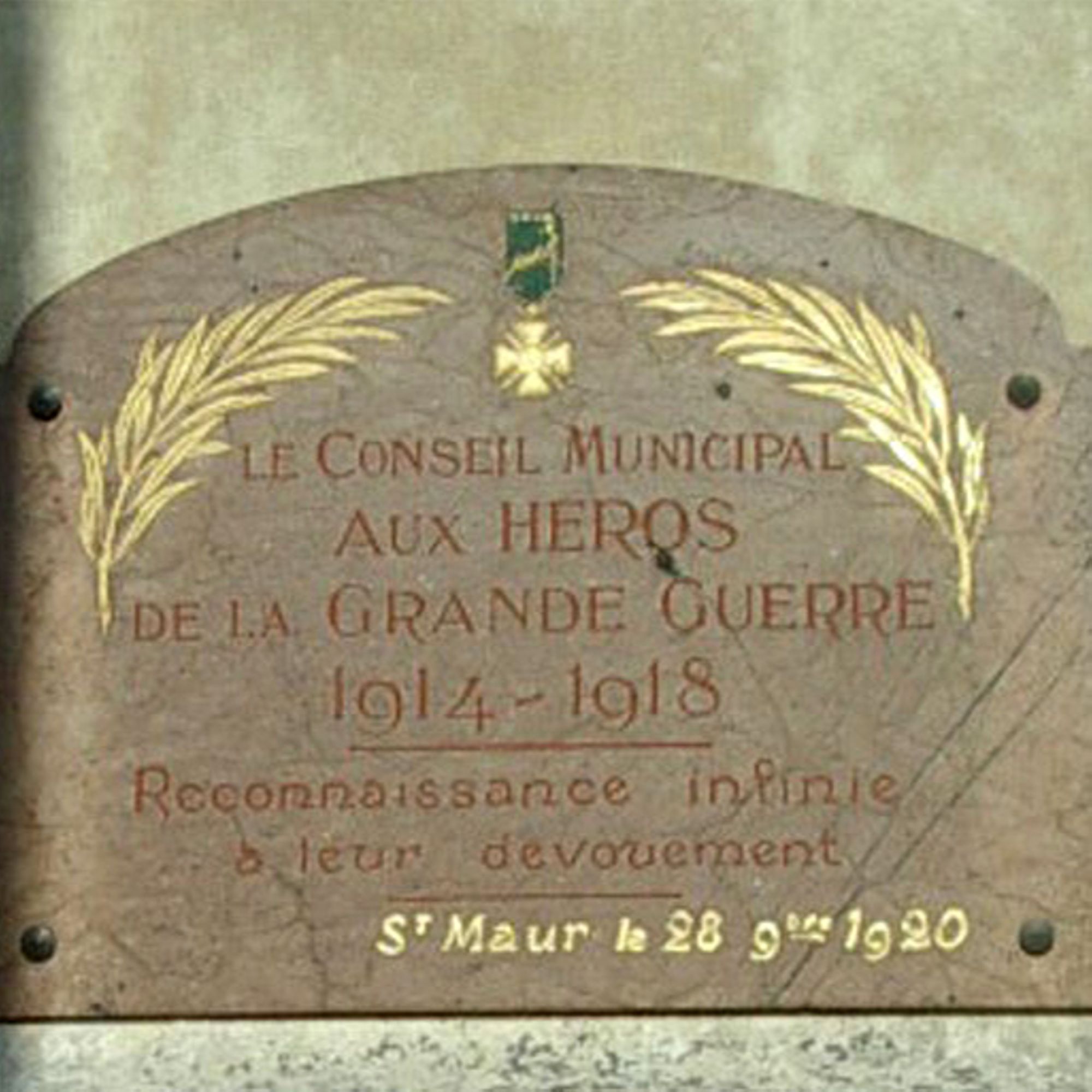 Quant à la face postérieure elle porte actuellement à sa base une plaque de teinte rose où deux palmes encadrent une croix de guerre suspendue sous son ruban avec en dessous l’inscription : “LE CONSEIL MUNICIPAL AUX HEROS DE LA GRANDE GUERRE 1914-1918 – RECONNAISSANCE INFINIE A LEUR DEVOUEMENT. ST MAUR le 28 9bre (novembre) 1920 ”.