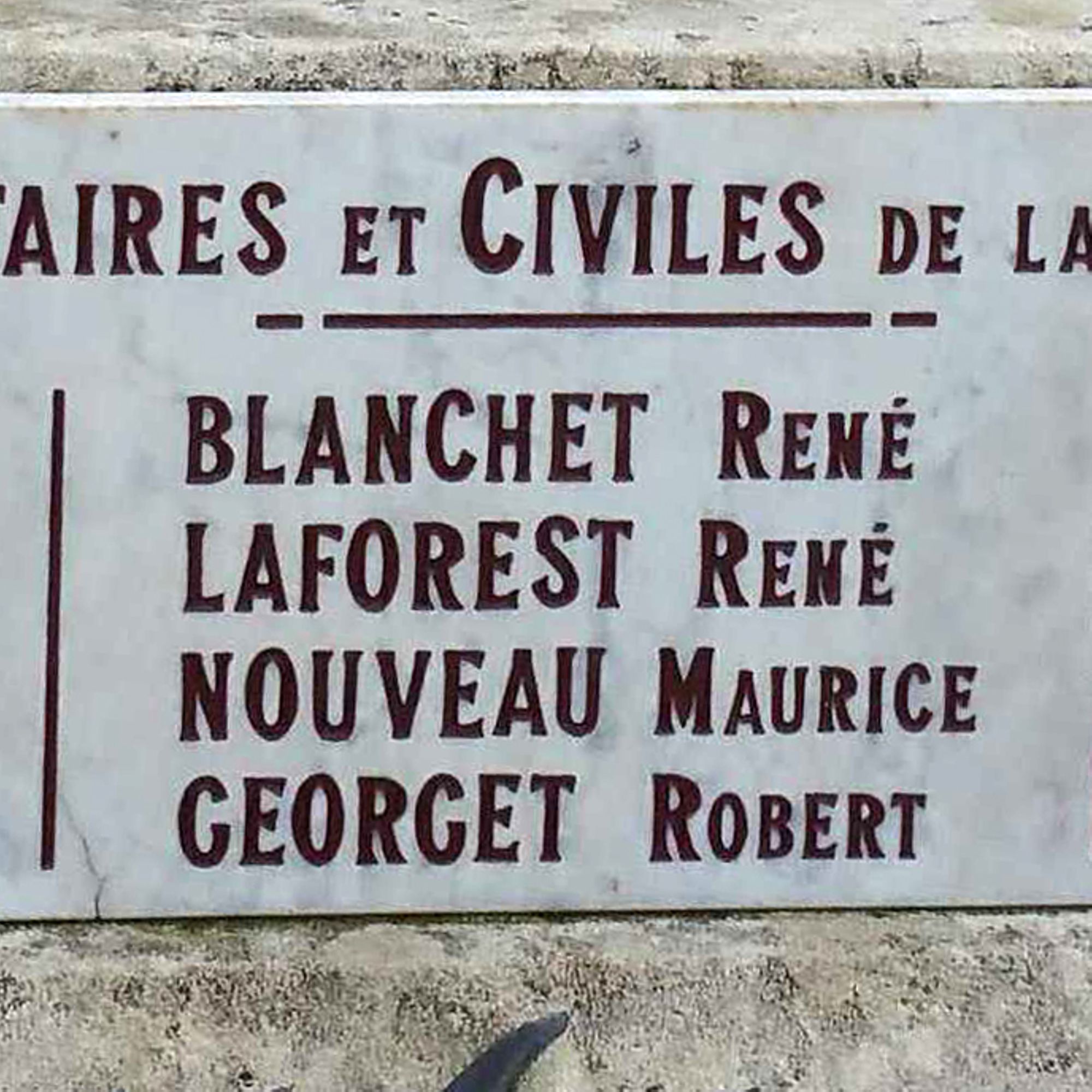 AUX VICTIMES MILITAIRES ET CIVILES DE LA GUERRE 1939-1945 avec en dessous sur trois colonnes 12 noms et prénoms.Une autre plaque en marbre noir se trouve en dessous de la précédente. Elle porte en lettres d’or l’inscription :
