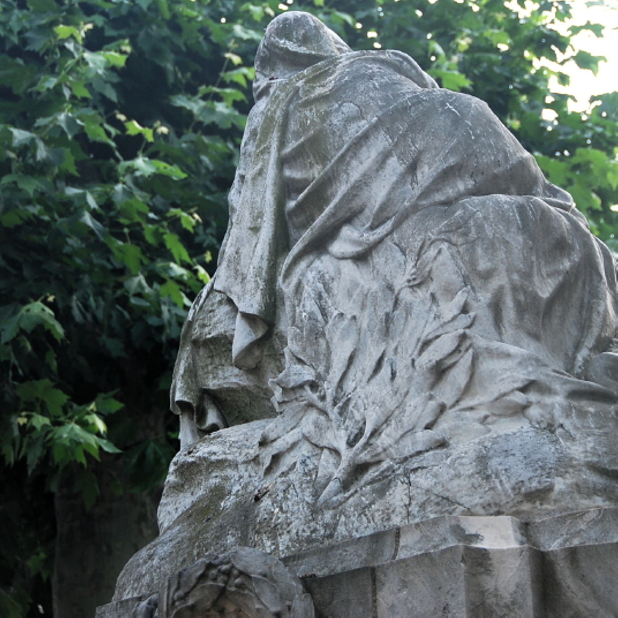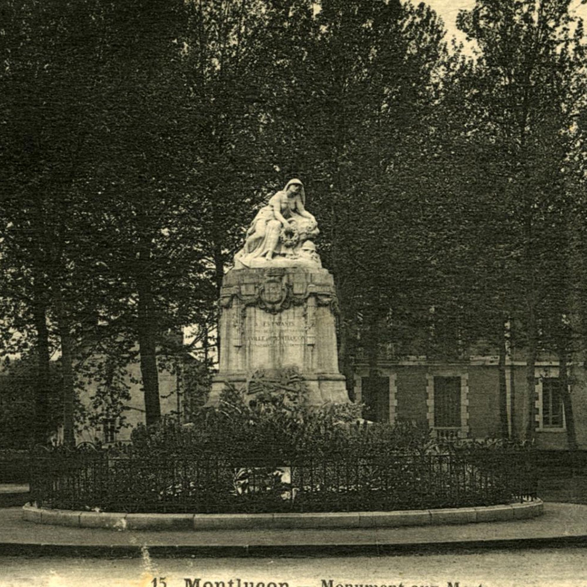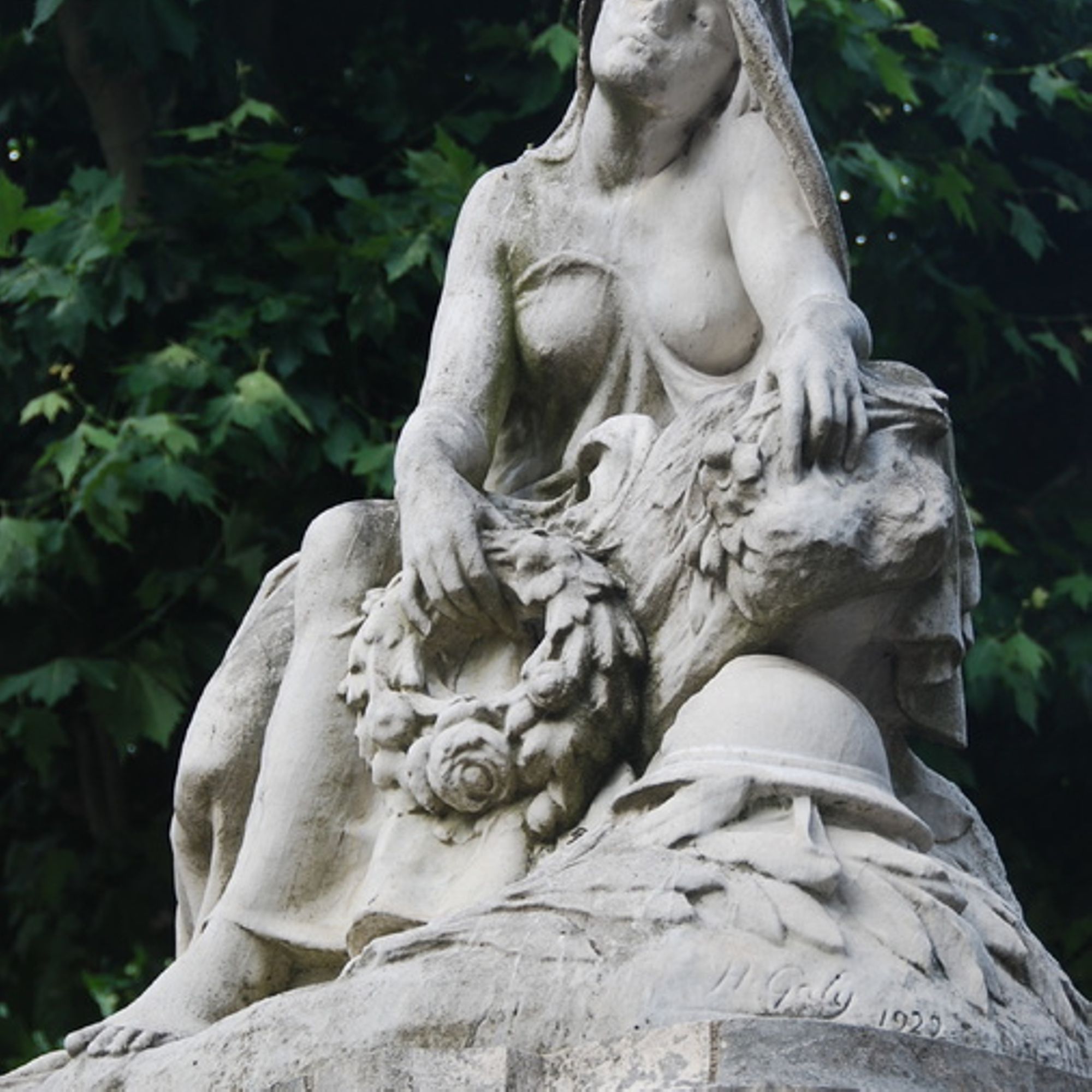 Sculpture représentant une mère en deuil offrant un sein nu à son enfant perdu, dont le casque est posé, discret et vain, sur une branche de laurier. Elle tient dans une main une couronne de fleurs.
