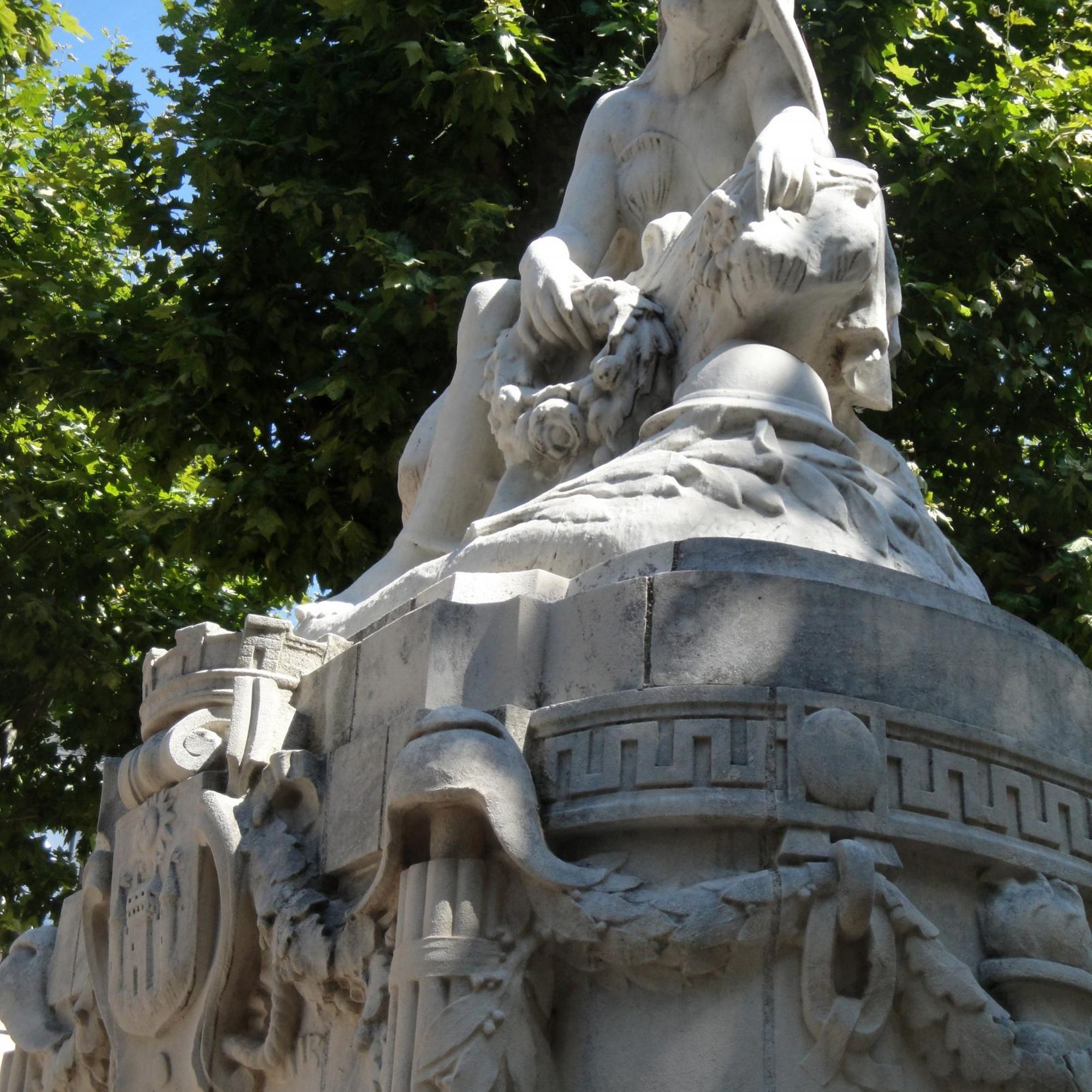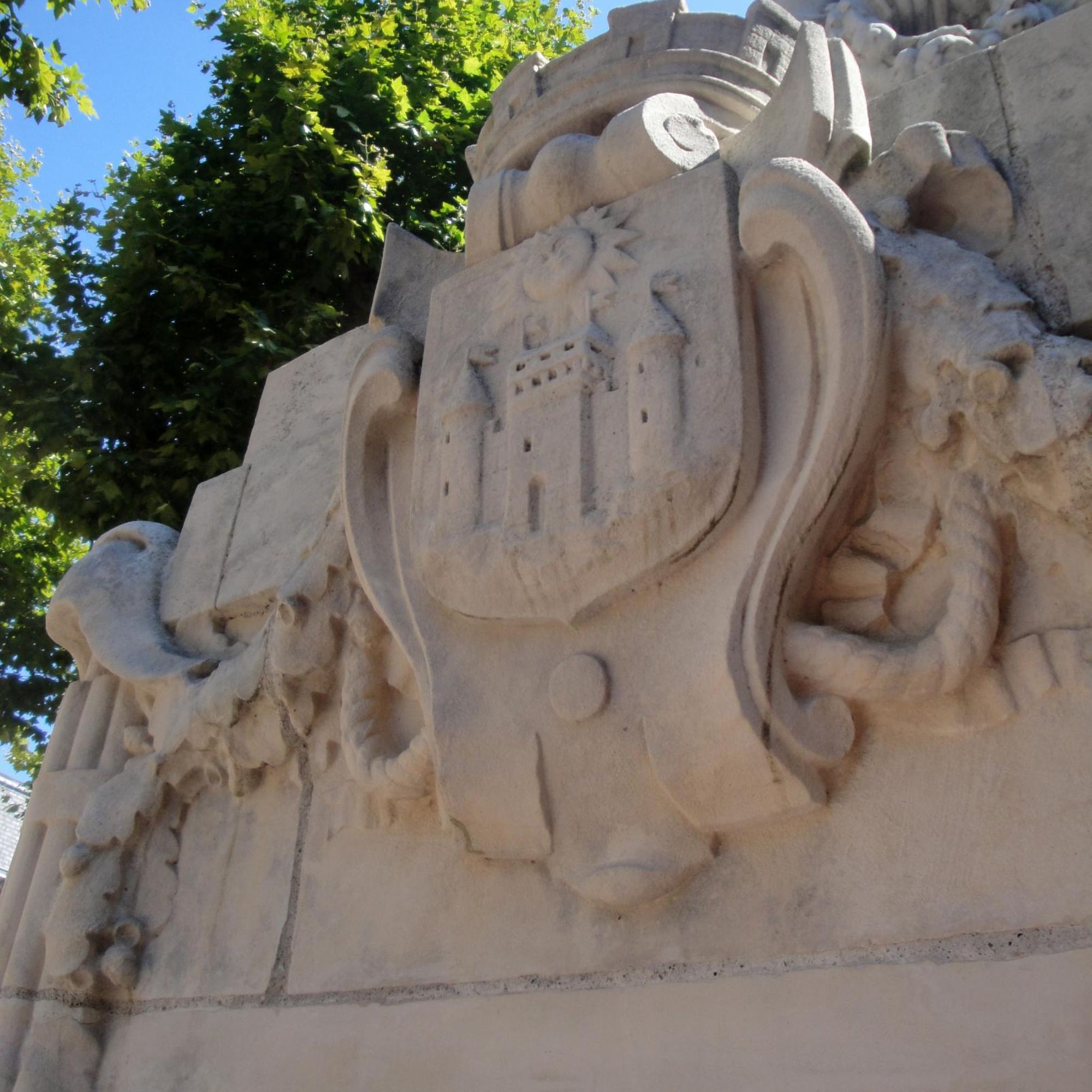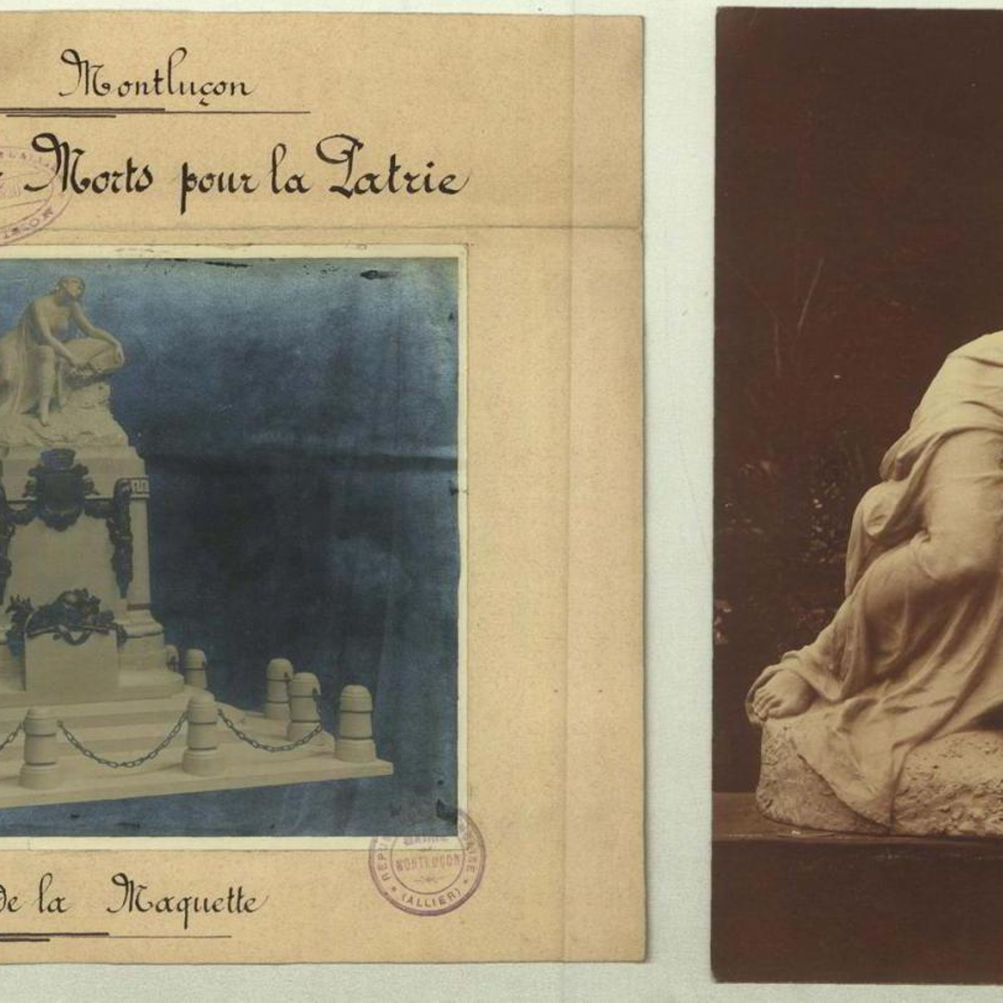Sculpture représentant une mère en deuil offrant un sein nu à son enfant perdu, dont le casque est posé, discret et vain, sur une branche de laurier. Elle tient dans une main une couronne de fleurs.