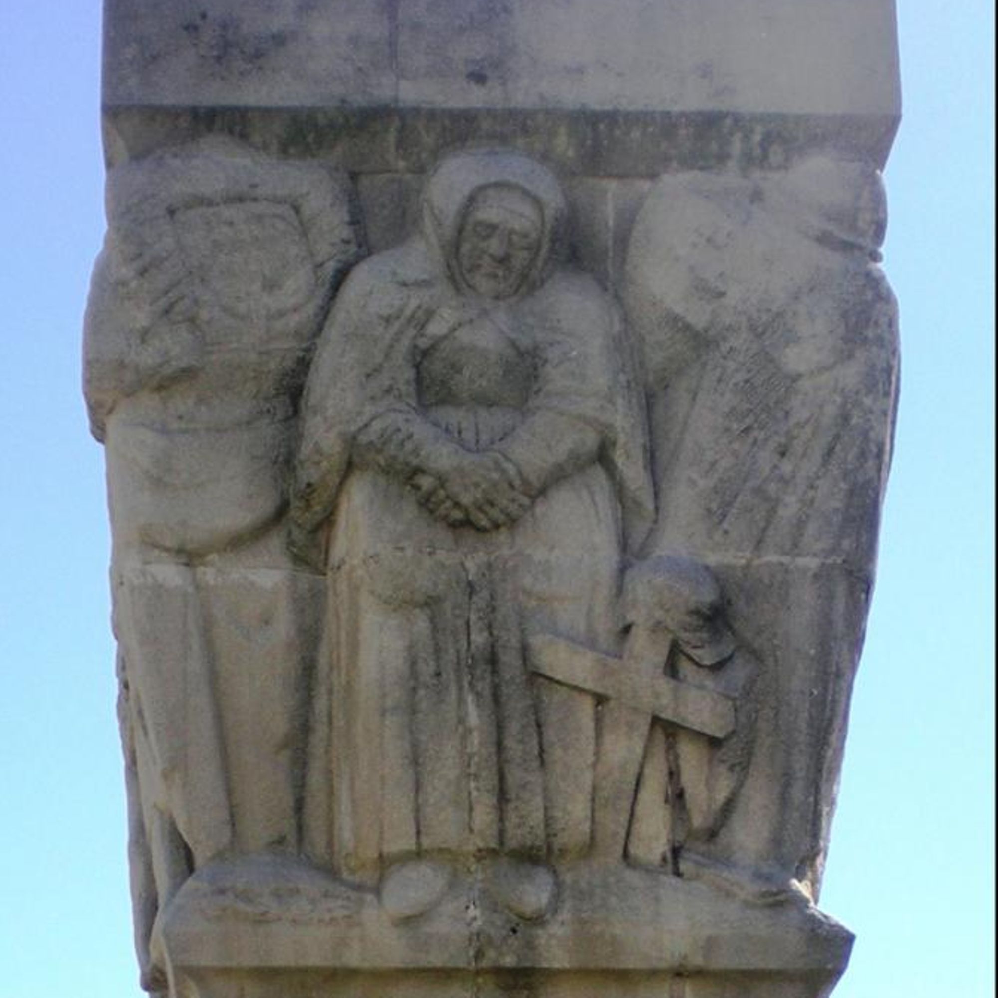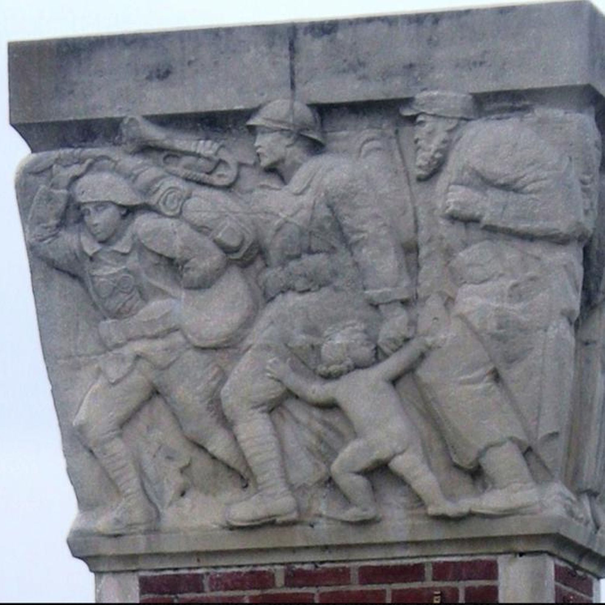 Une colonne en pierre et en brique, surmonté de bas-relief.