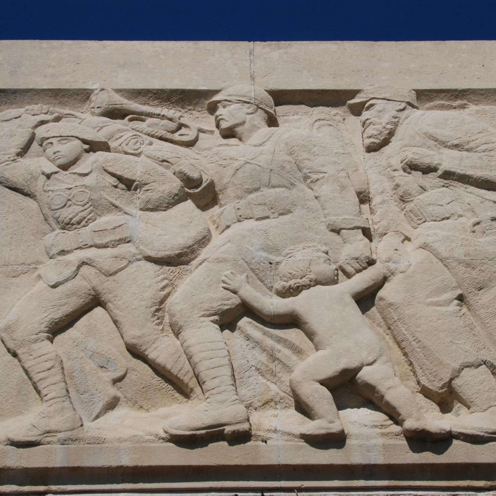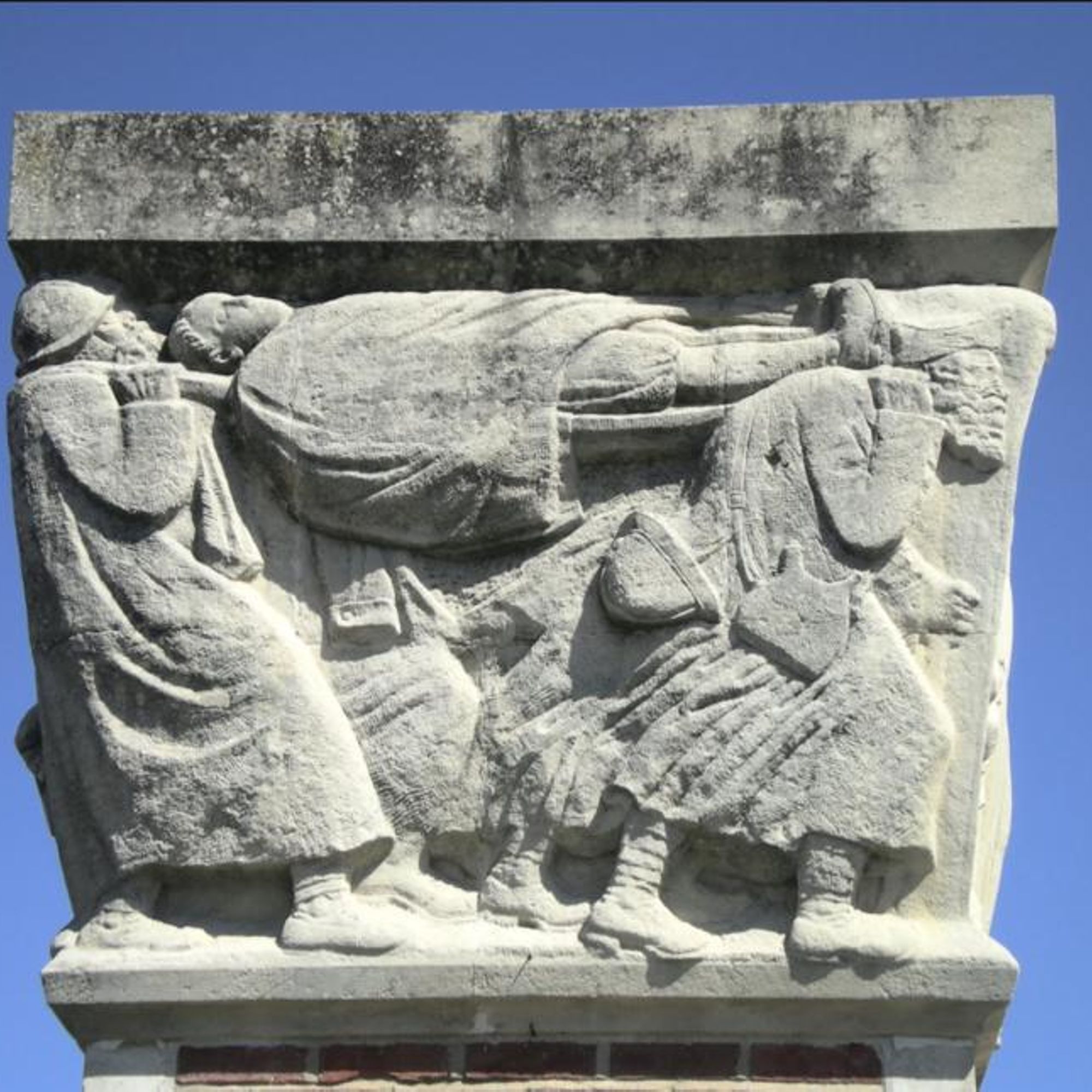 « Sur l’autre bas-relief, c’est un épisode de la lutte. Des hommes, si l’on peut encore appeler des hommes ces êtres hirsutes que furent les Poilus, courbés sous le poids de la douleur et sous le poids d’un corps déjà raidi, emportent un de leurs camarades. Et c’est toute l’horreur du champ de bataille avec du mouvement, avec de la vie, mais hélas avec de la mort ».