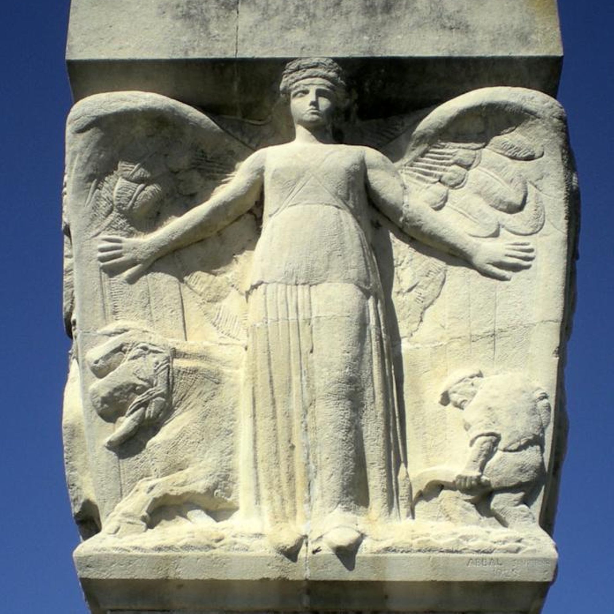 « Elle reste attristée par tout ce sang qu’elle a vu répandre autour d’elle et pour elle et qu’elle veut désormais épargner. Elle est la Victoire pacifique qui ne demande qu’à protéger le labeur fécond, le travail rénovateur et les grands bœufs de nos étables et ce laboureur symbolique qui va jeter demain la semence de l’avenir !... »
