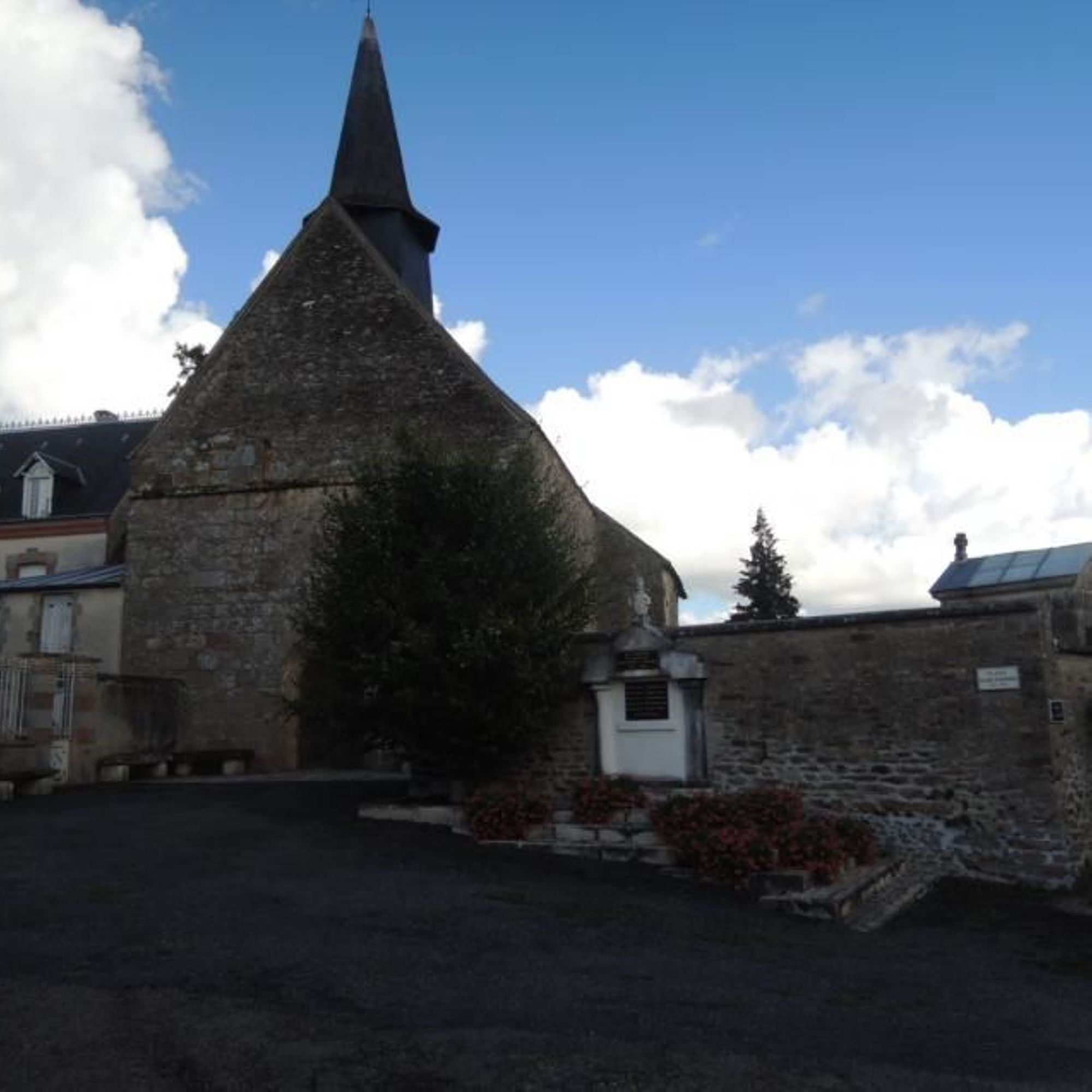 Des marches devant le Monument au Morts permettent de compenser la pente naturelle de la place.