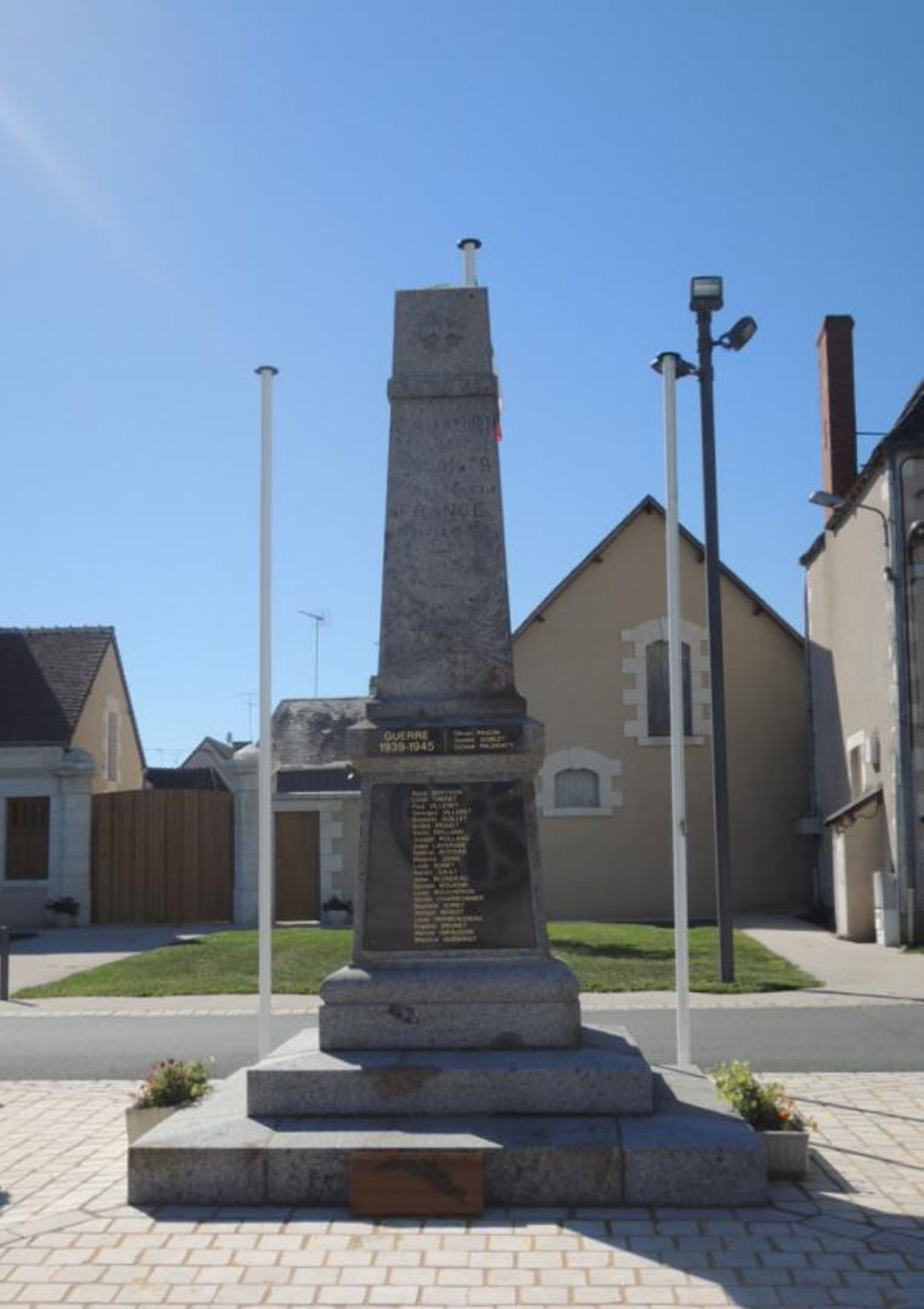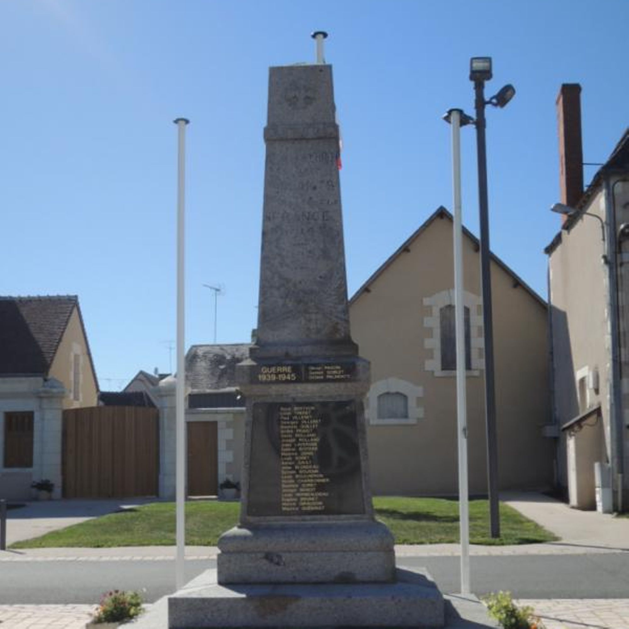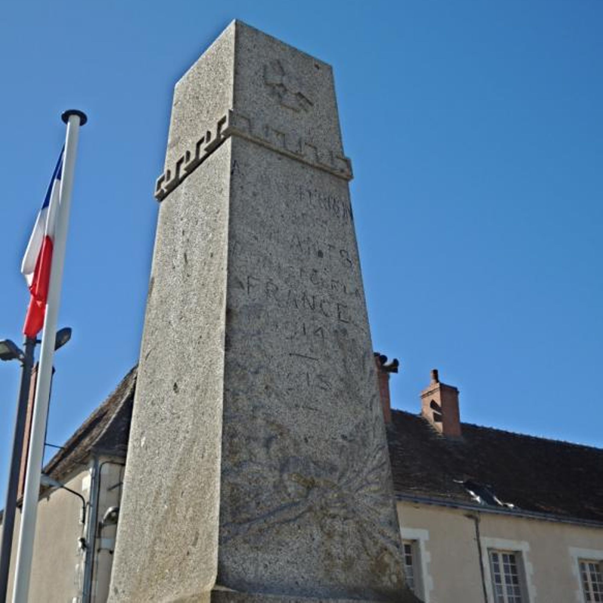 La face antérieure du Monument aux Morts est tournée vers l’entrée de l’église Saint-Nazaire, sa face postérieure regarde la façade de la Mairie, et l’entrée du château se trouve du côté gauche, lorsque l’on regarde la face antérieure du Monument aux Morts.