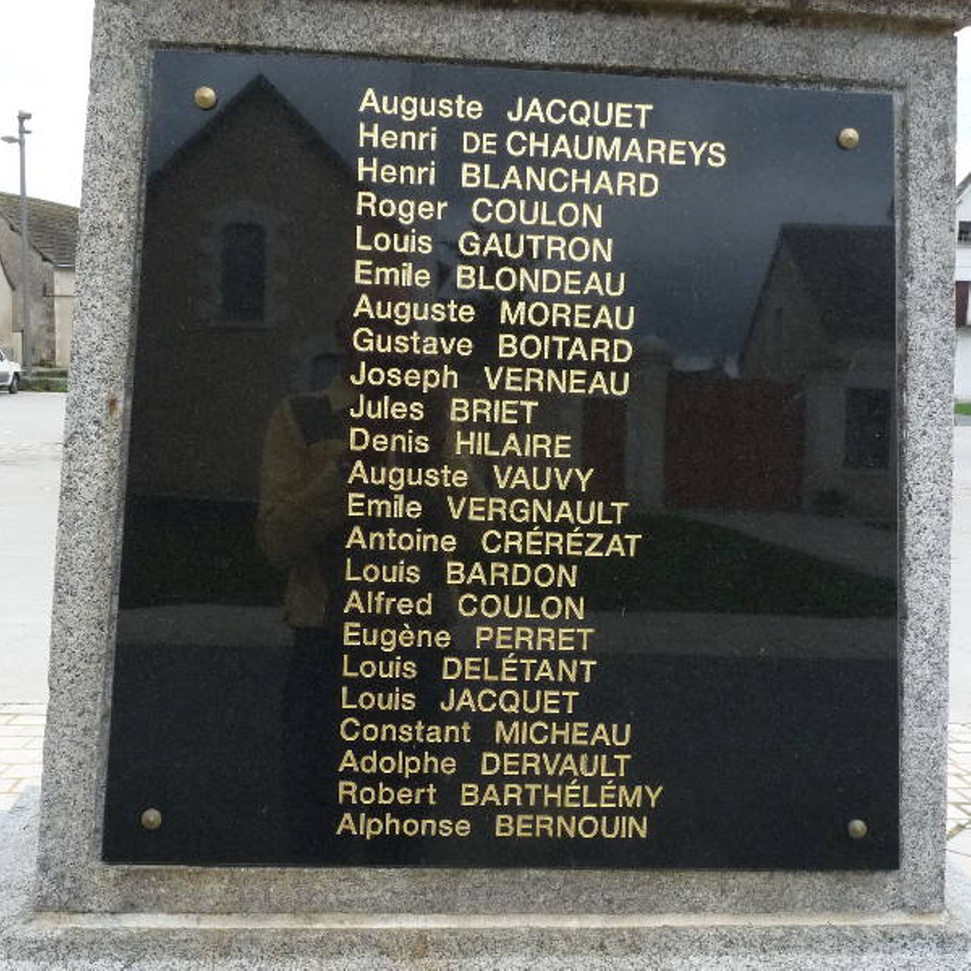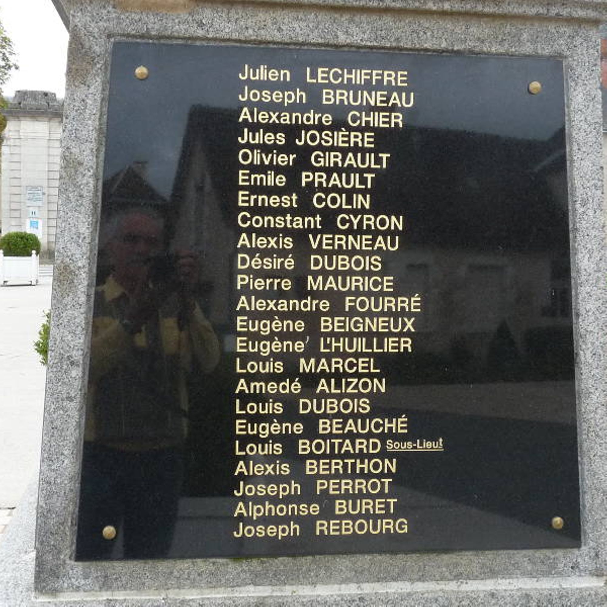 Chacune des quatre faces du socle porte l’une des plaques de marbre noir, où sont inscrits en lettres dorées les 92 prénoms, (suivit des noms) de ceux qui sont “Morts pour la France” pendant la période 1914-1918.