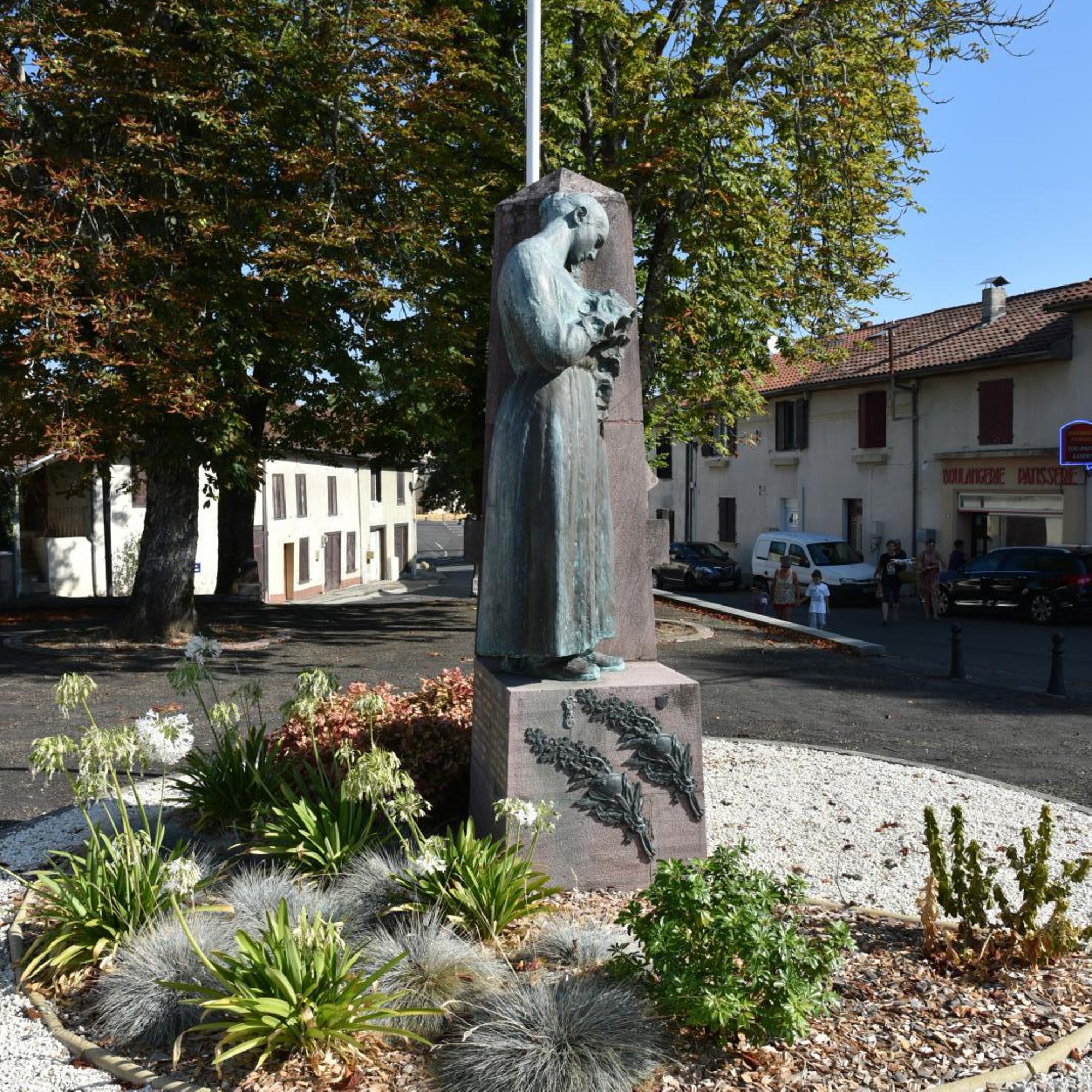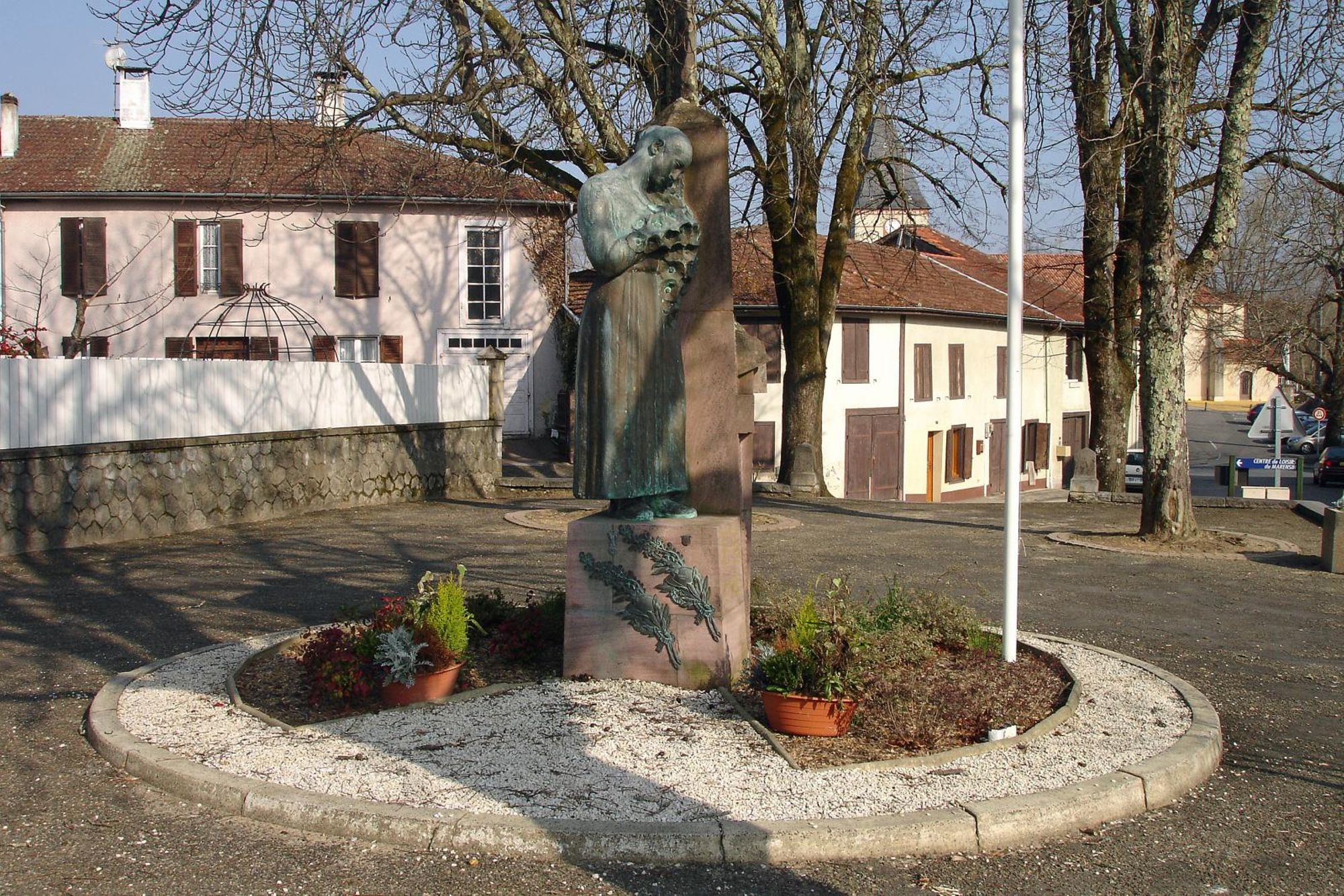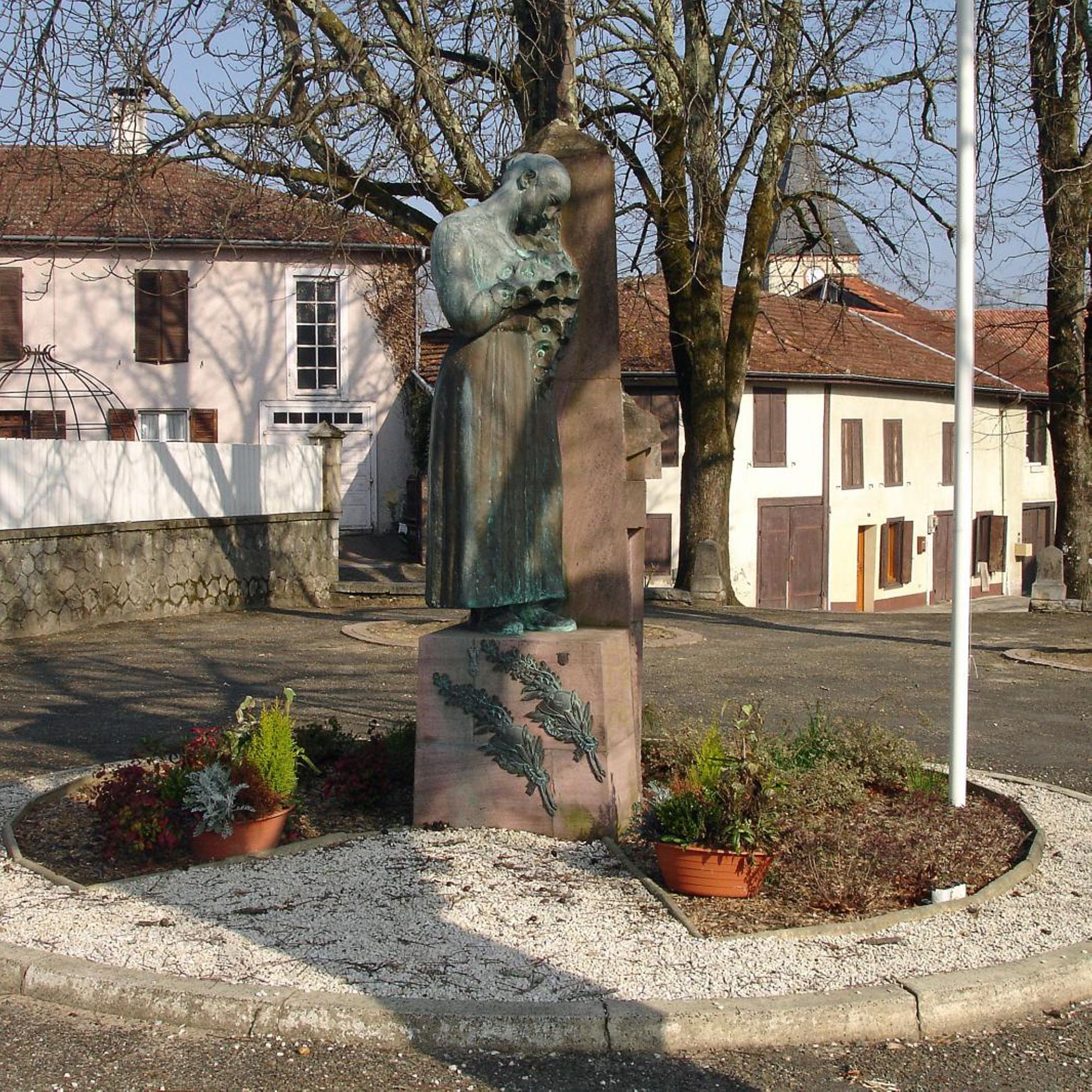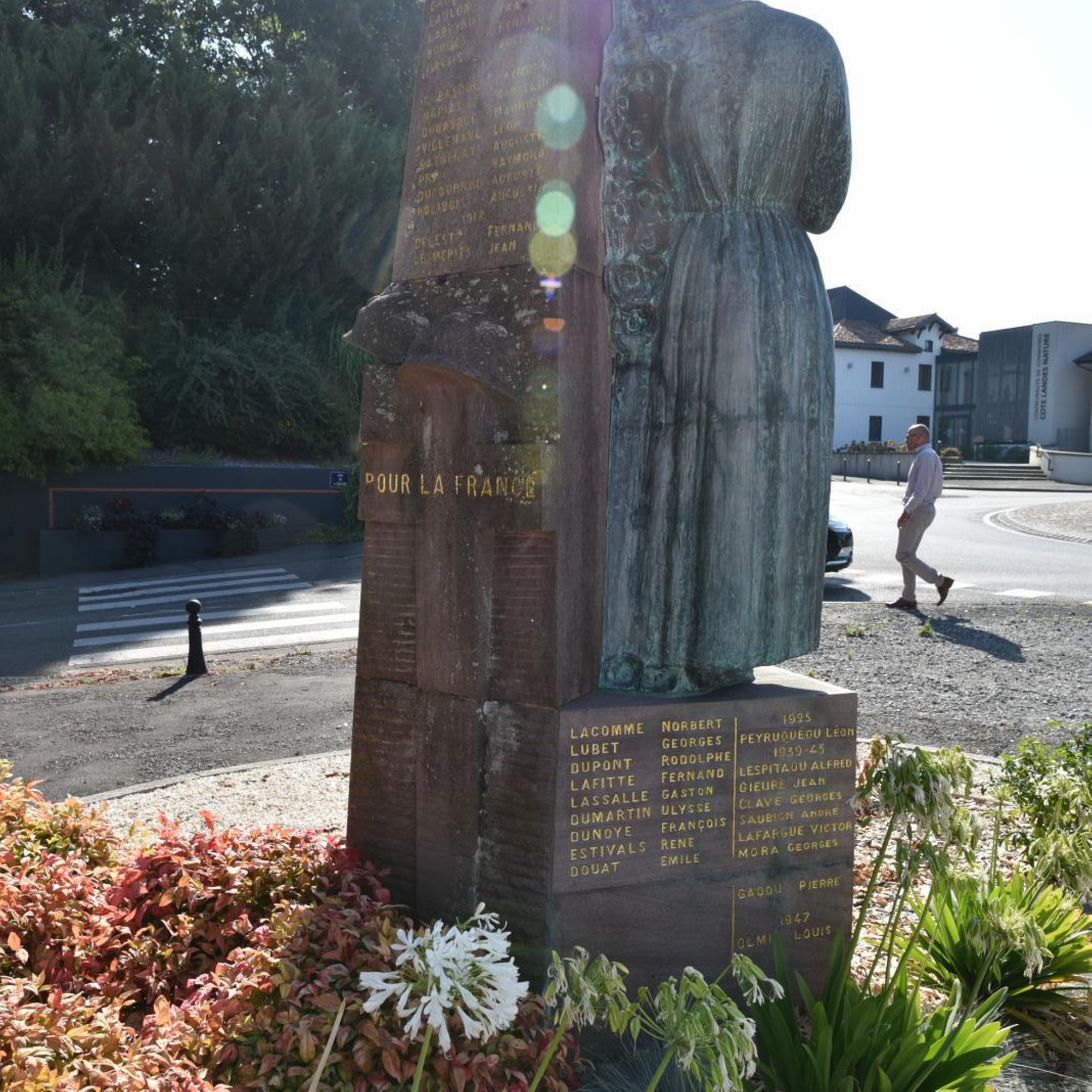Statue de Landaise en bronze, appuyée contre un socle en pierre rose de Bidarray sculpté de tombes de soldats