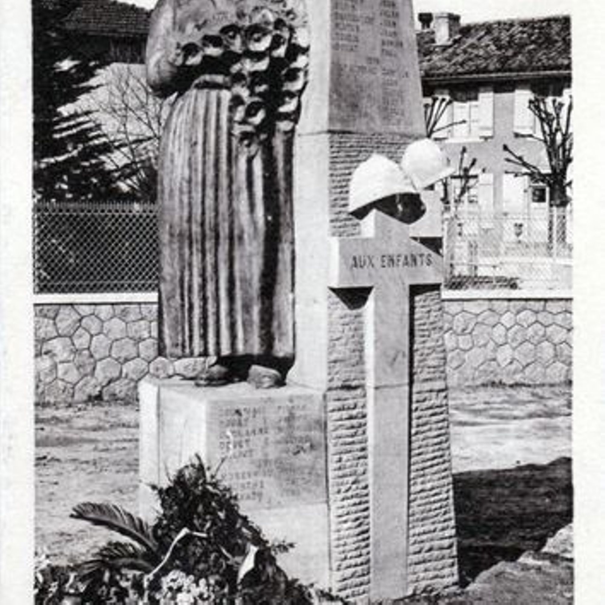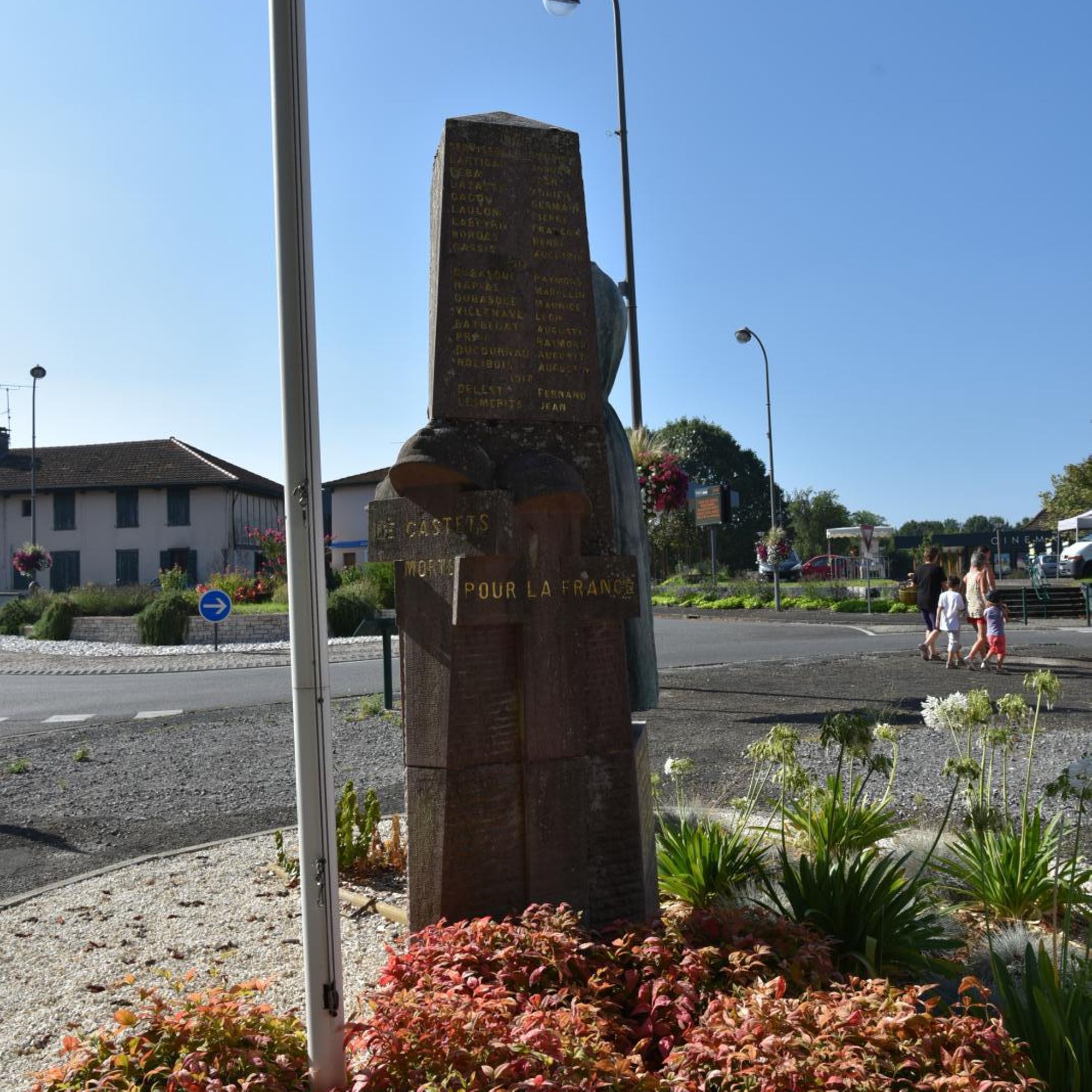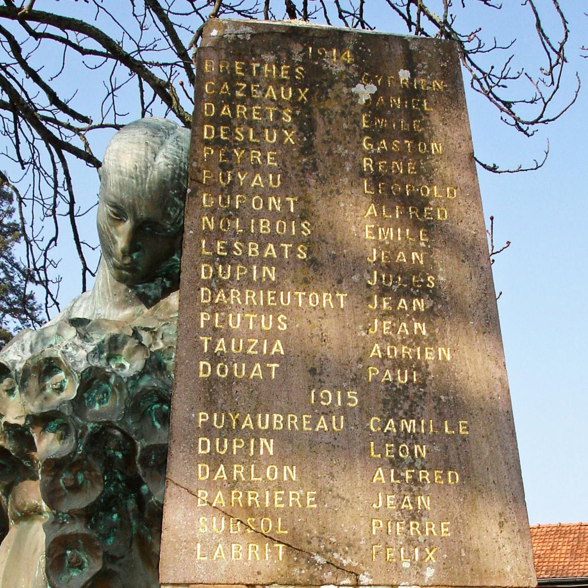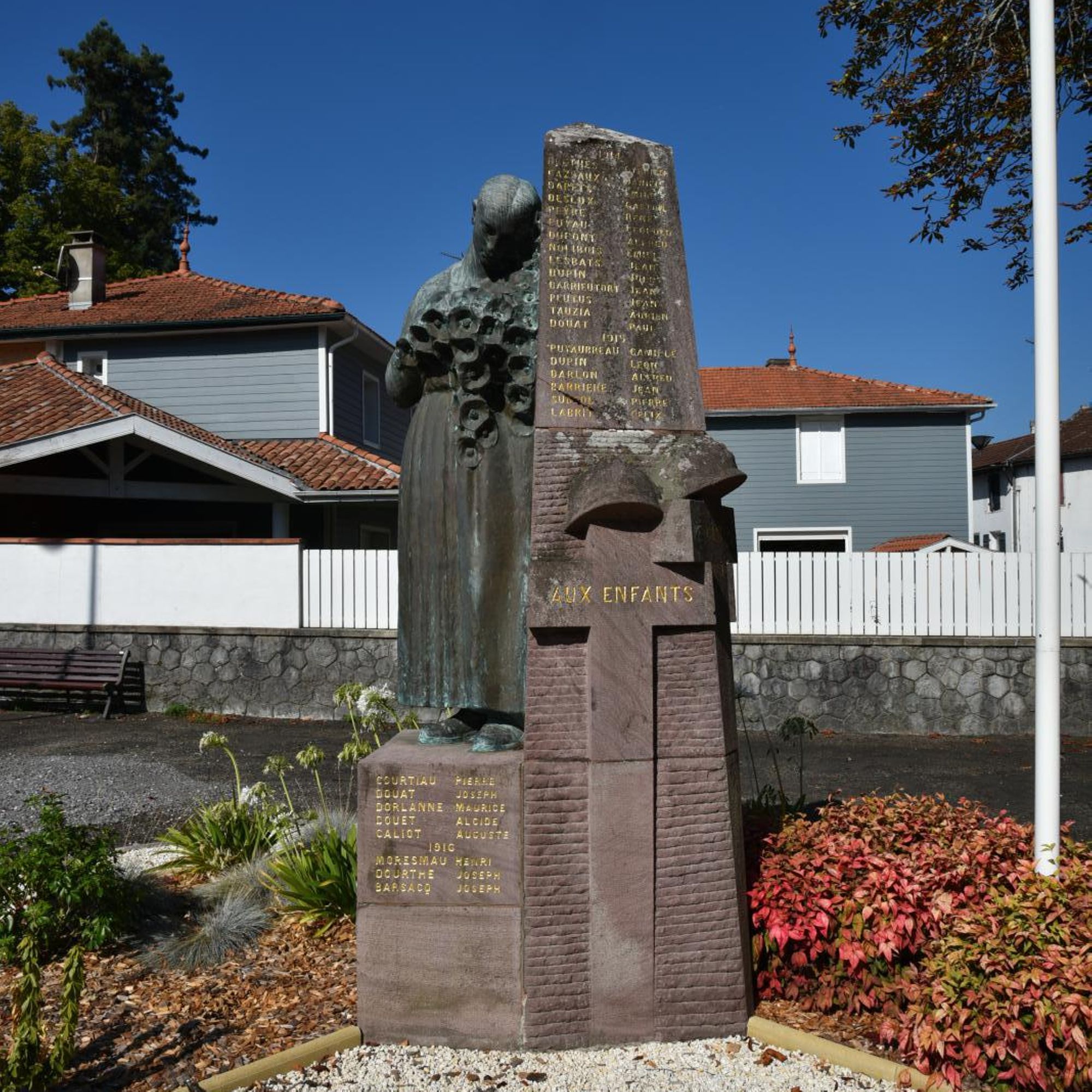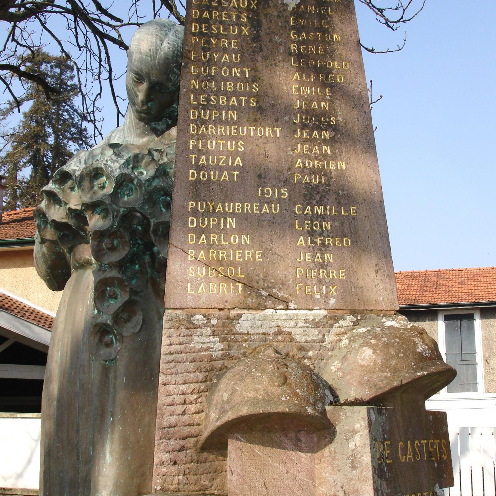Statue de Landaise en bronze, appuyée contre un socle en pierre rose de Bidarray sculpté de tombes de soldats