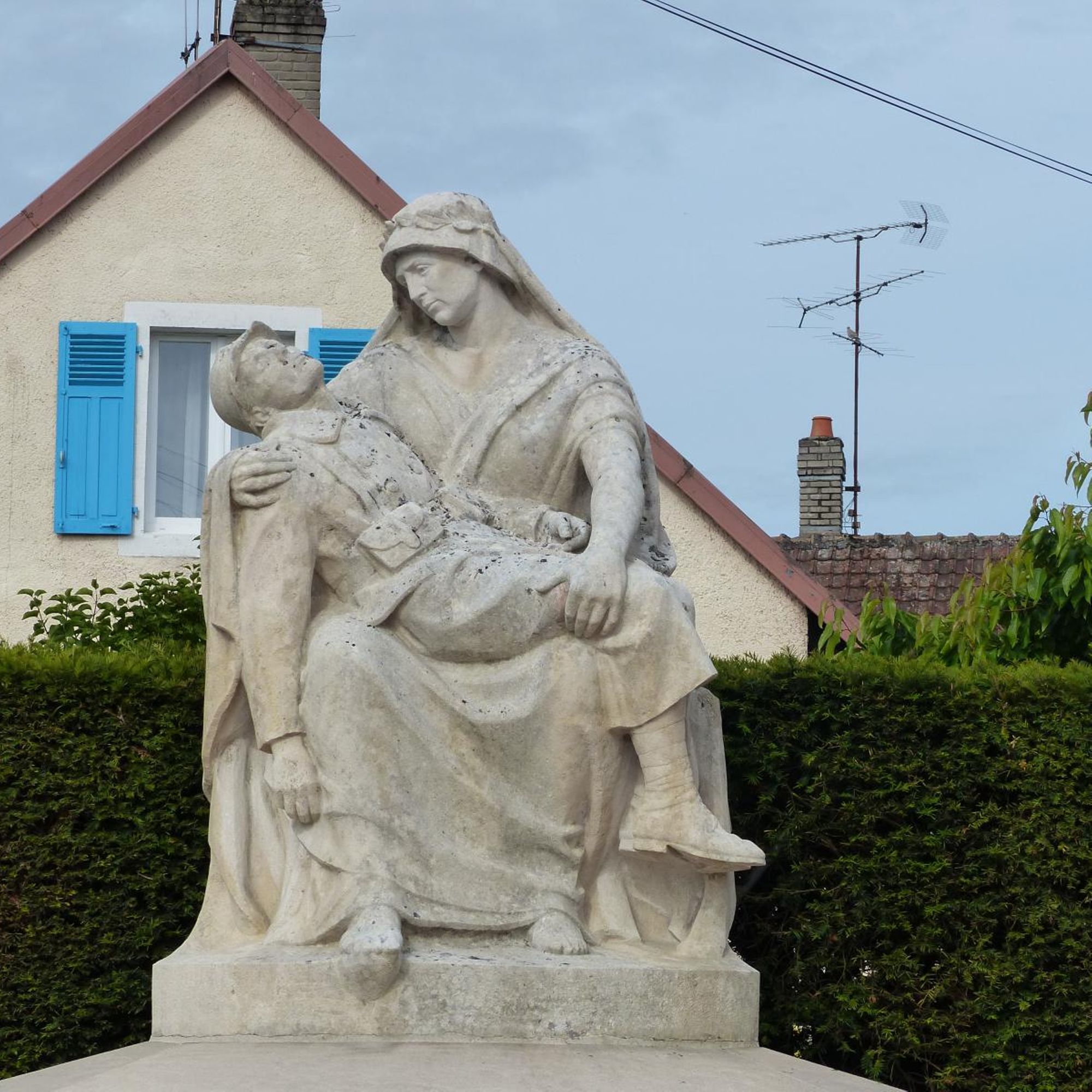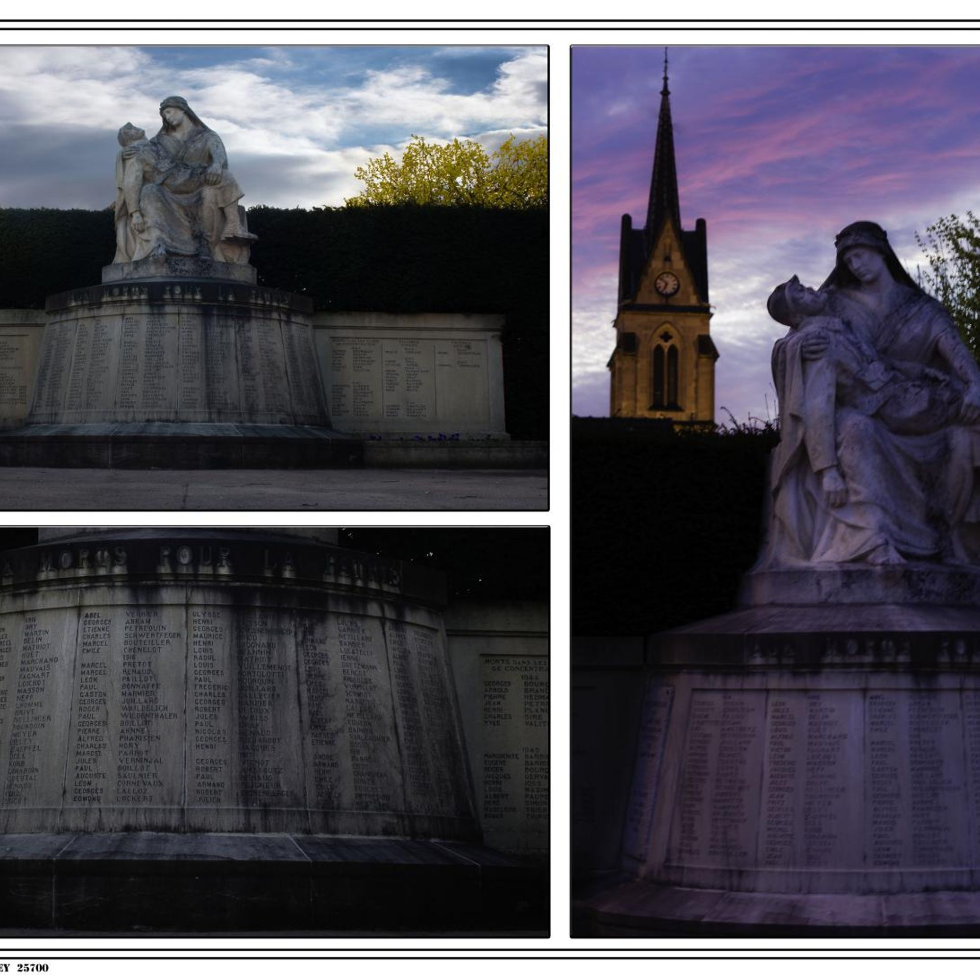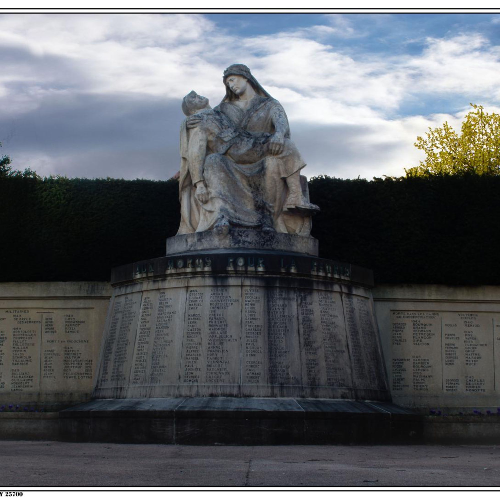 - Mur avec la liste des morts, surmonté par la France (dans le style Pieta), mère éplorée qui tient dans ses bras son fils mourant.