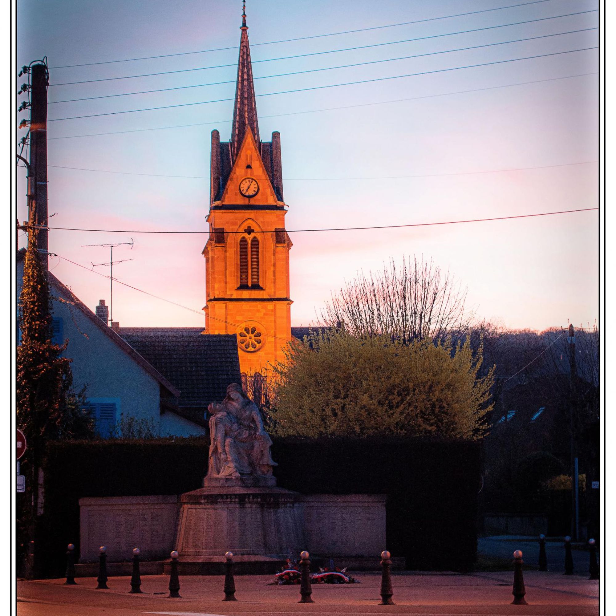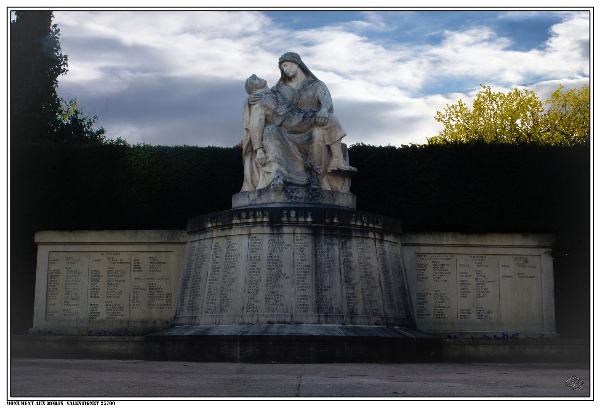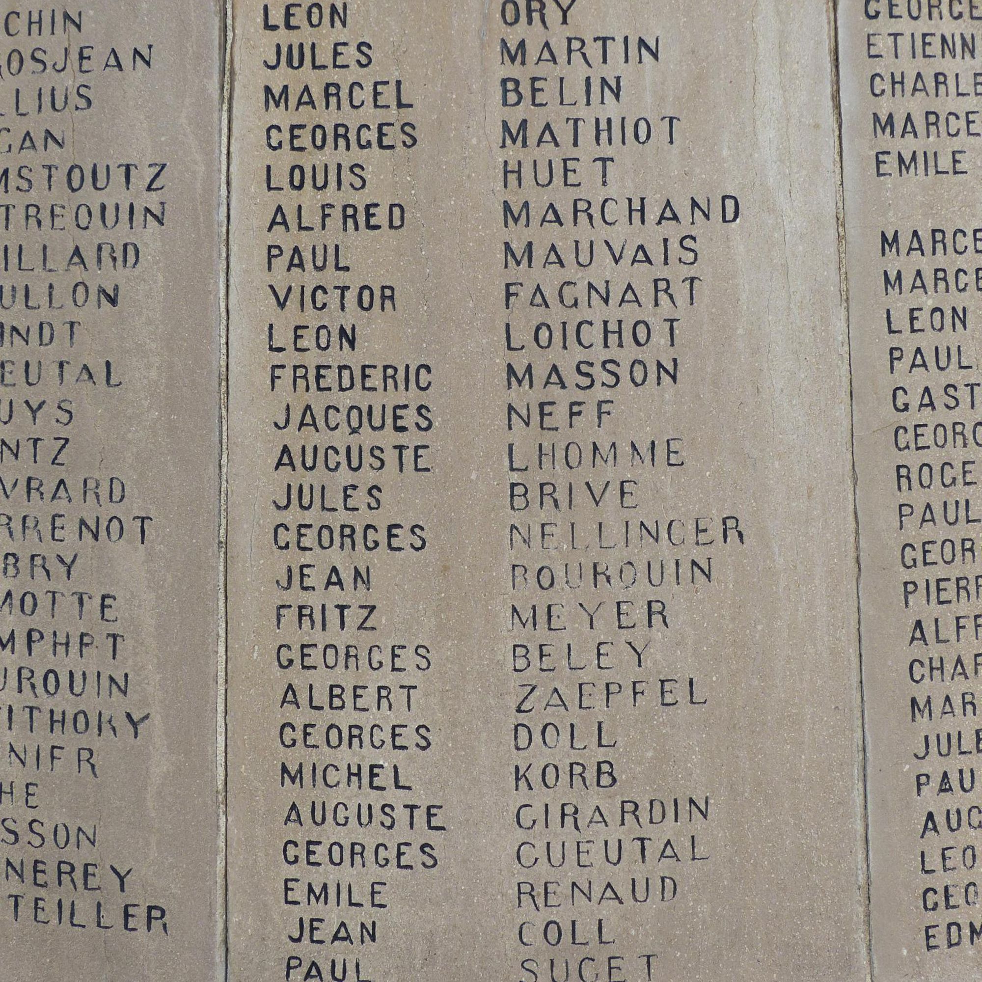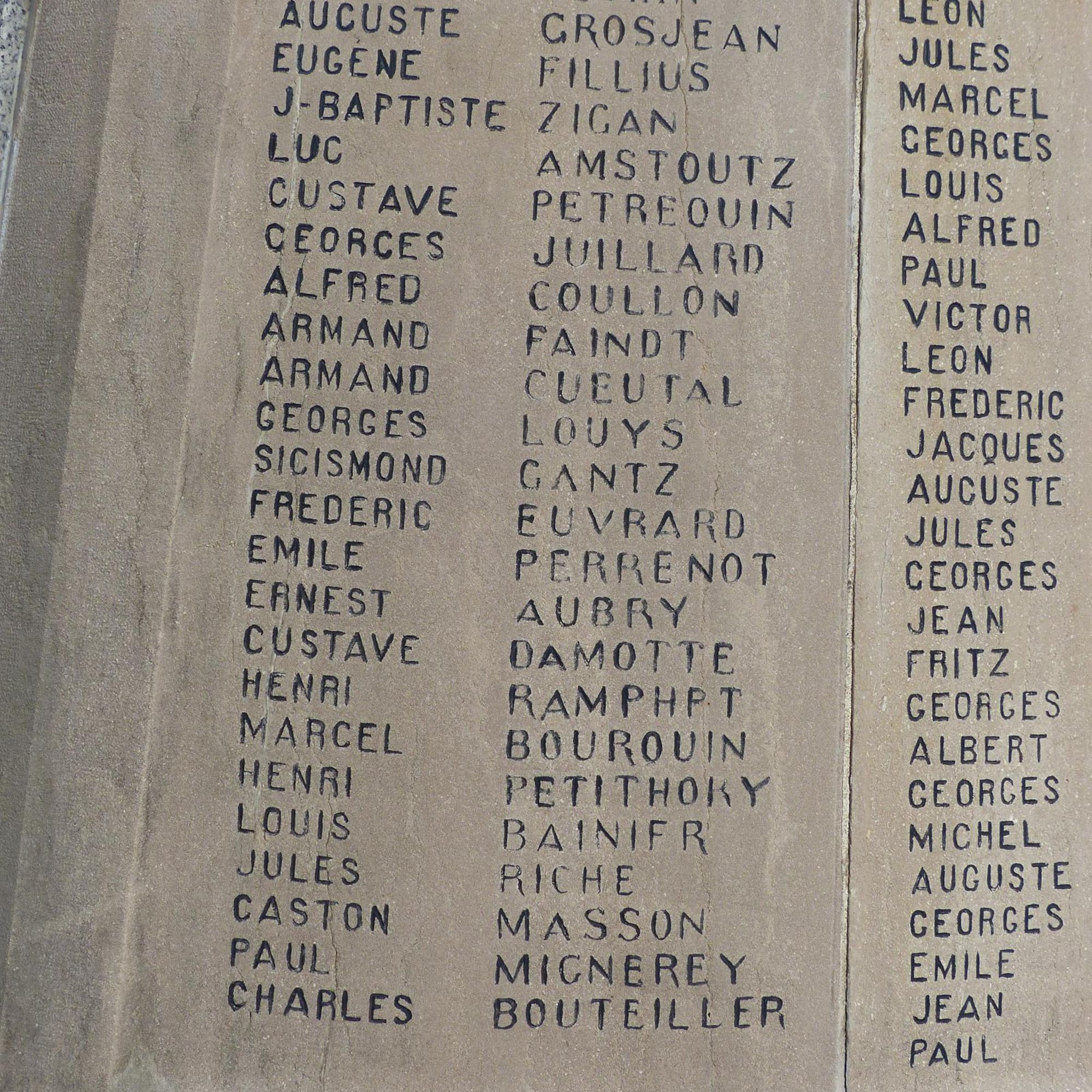 - Mur avec la liste des morts, surmonté par la France (dans le style Pieta), mère éplorée qui tient dans ses bras son fils mourant.