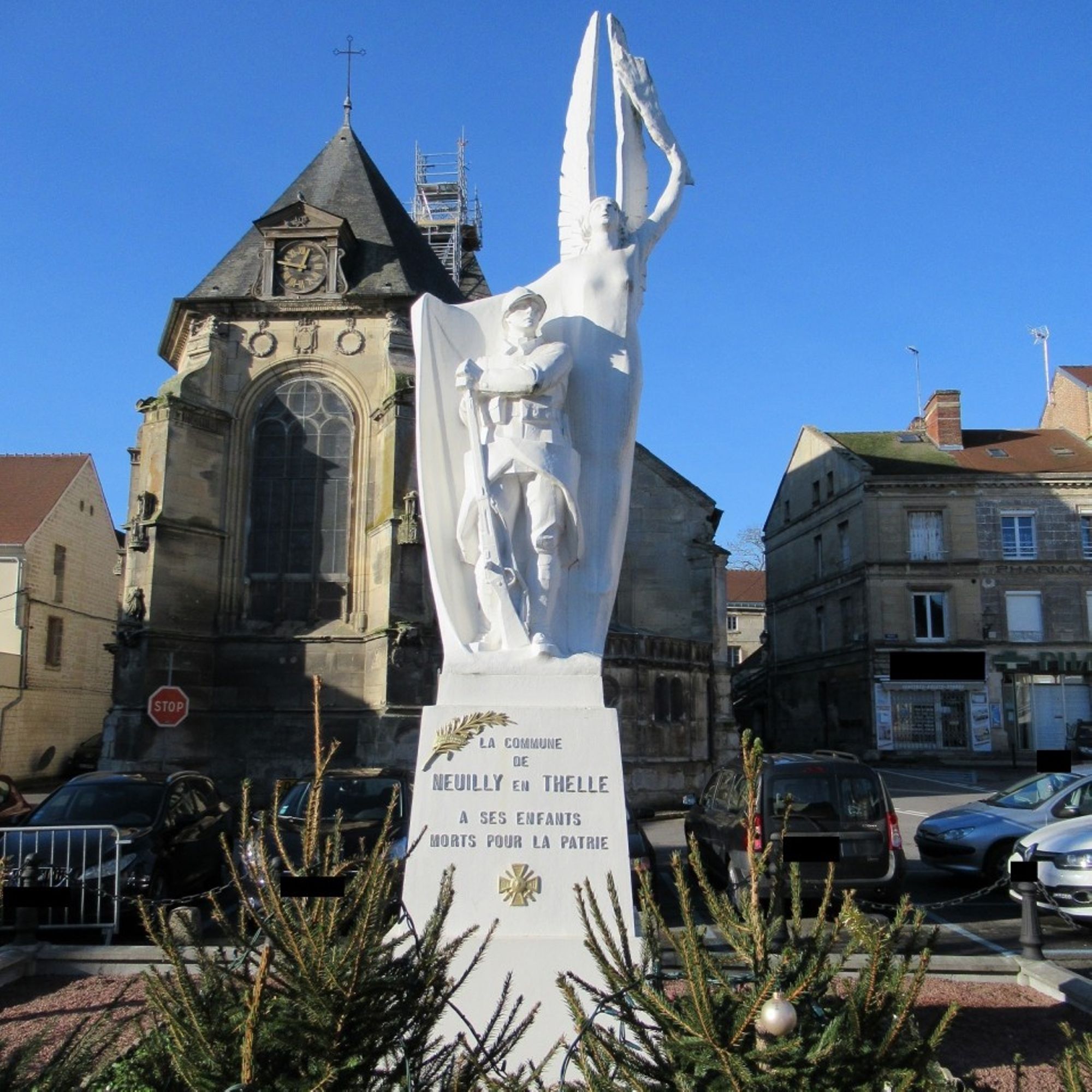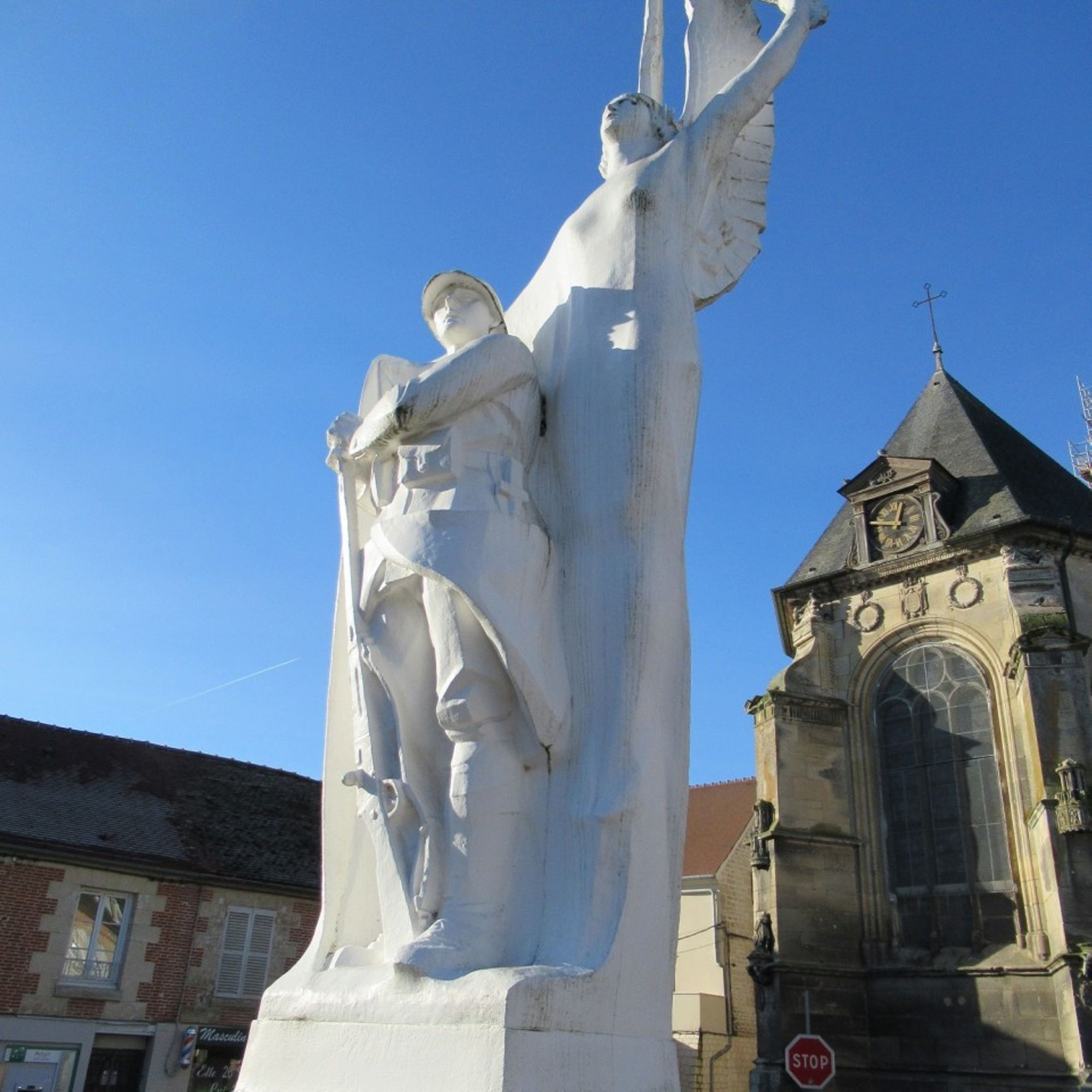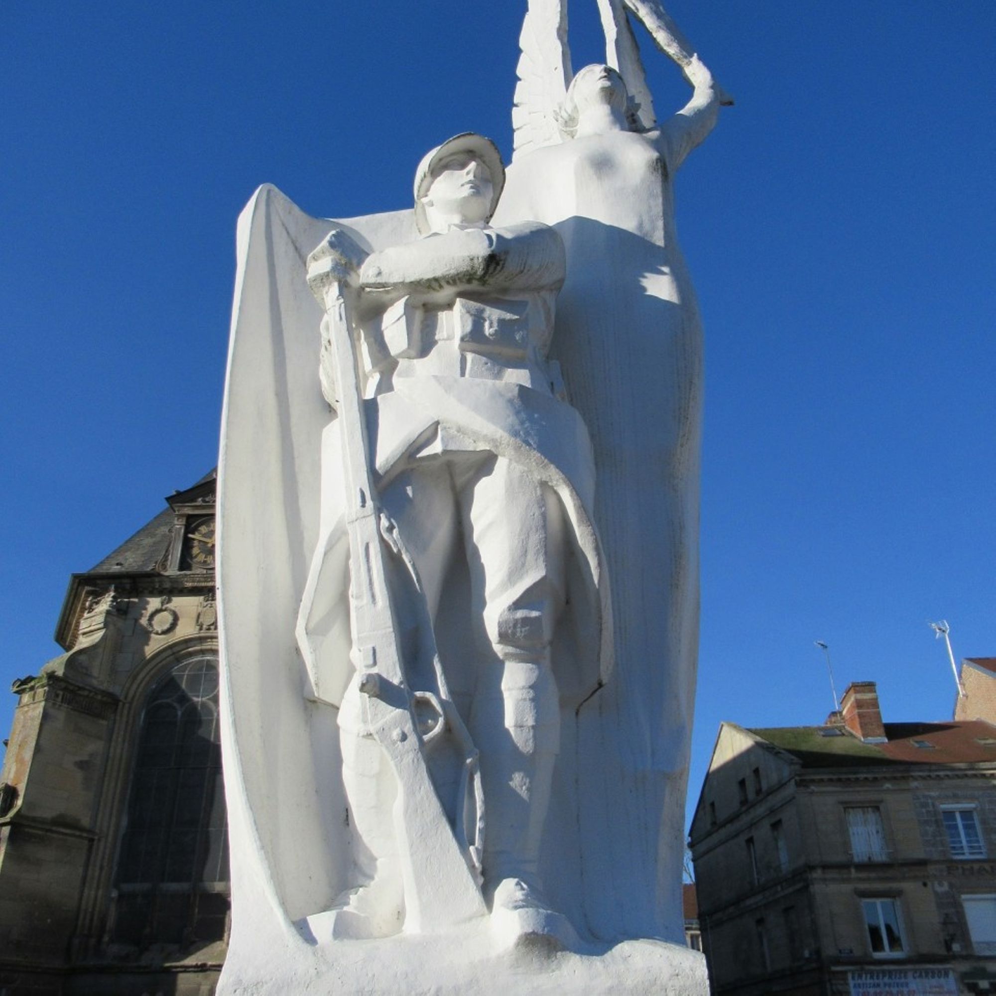 - Sur piedestal, la statue d'une victoire ailée étend un pan de sa tunique derrière un poilu avec la crosse du fusil à terre
