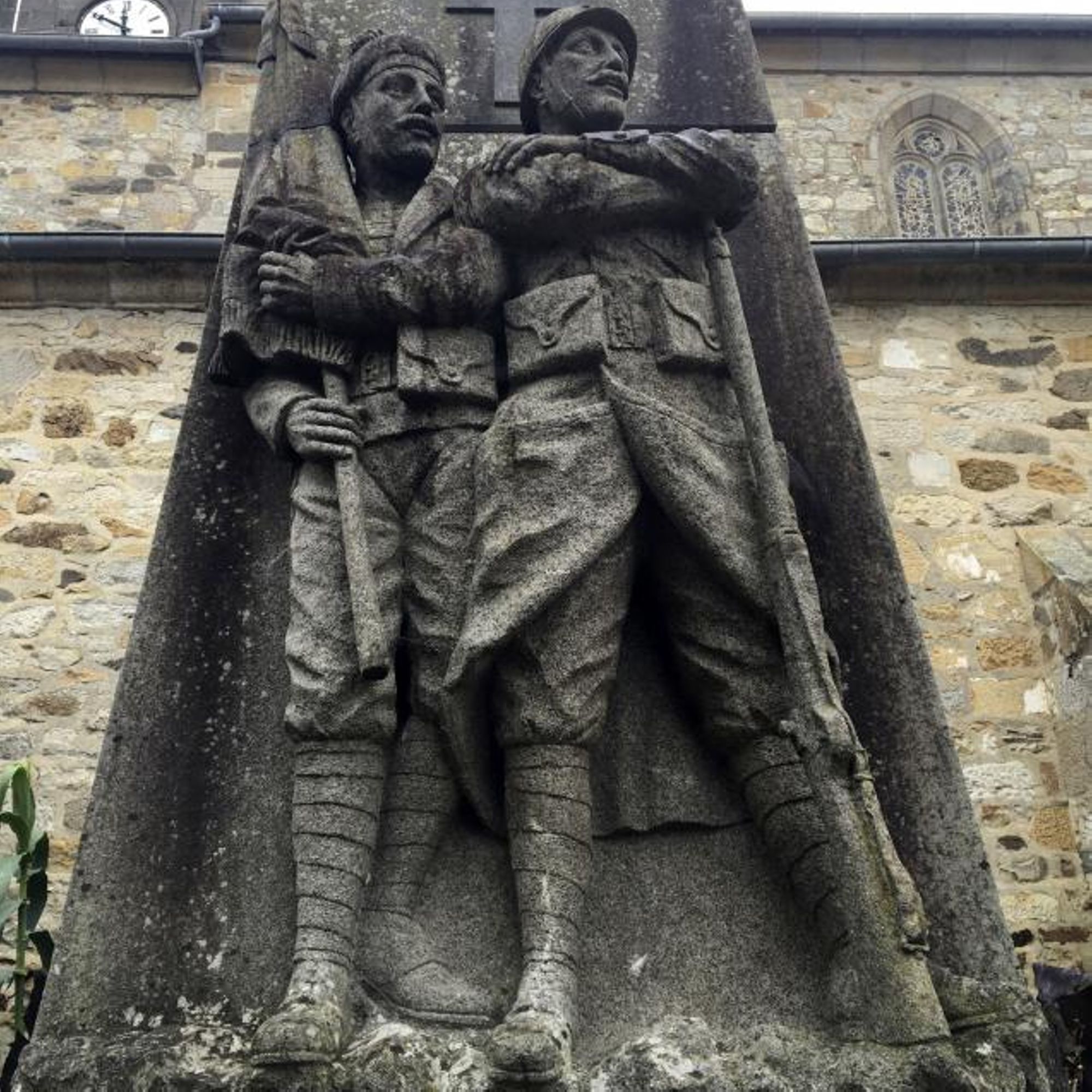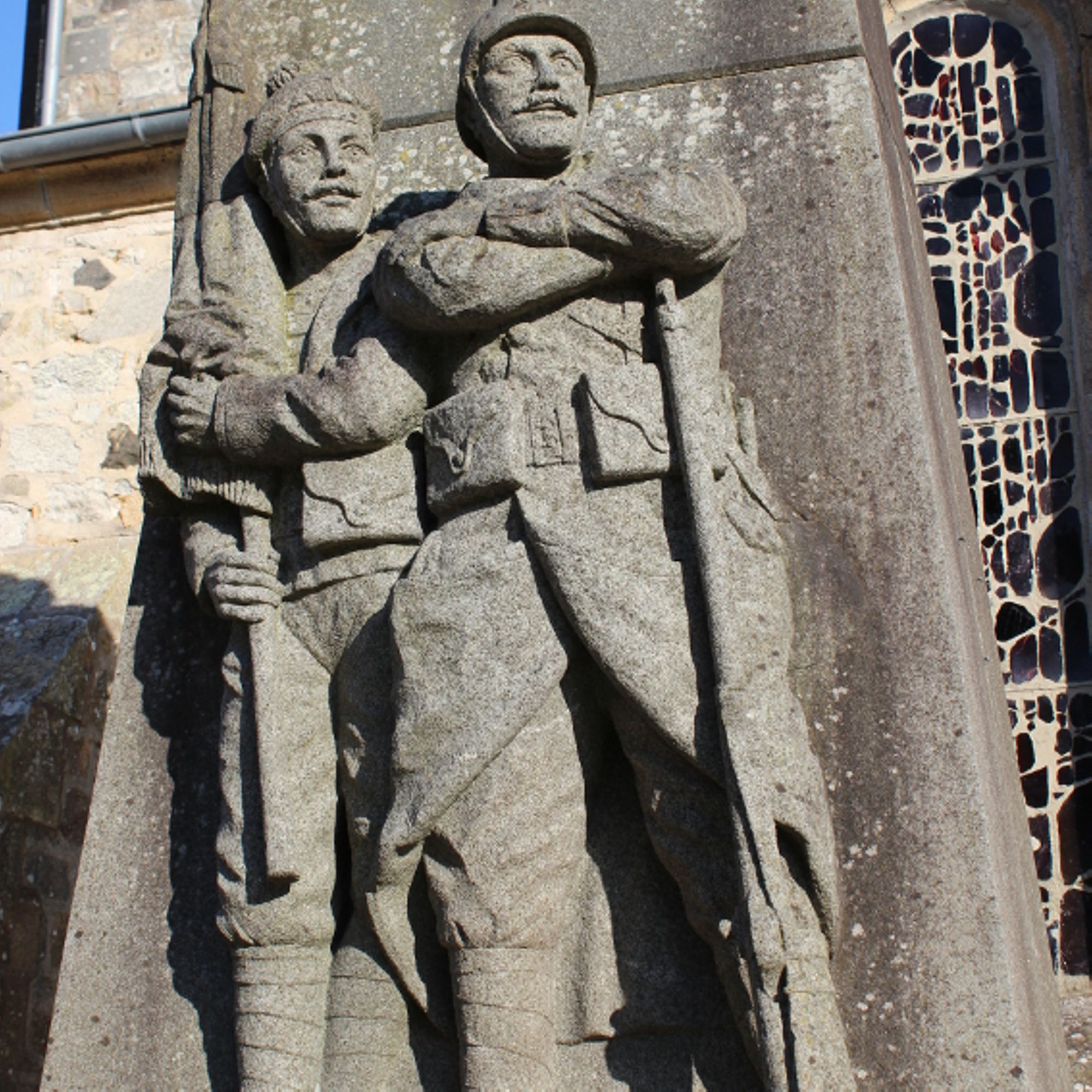 Sur trois larges degrés, se superposent le soubassement portant l'inscription, puis une large stèle avec soldat et marin, surmontée à son tour par différents éléments ouvragés dont une Croix de Guerre.