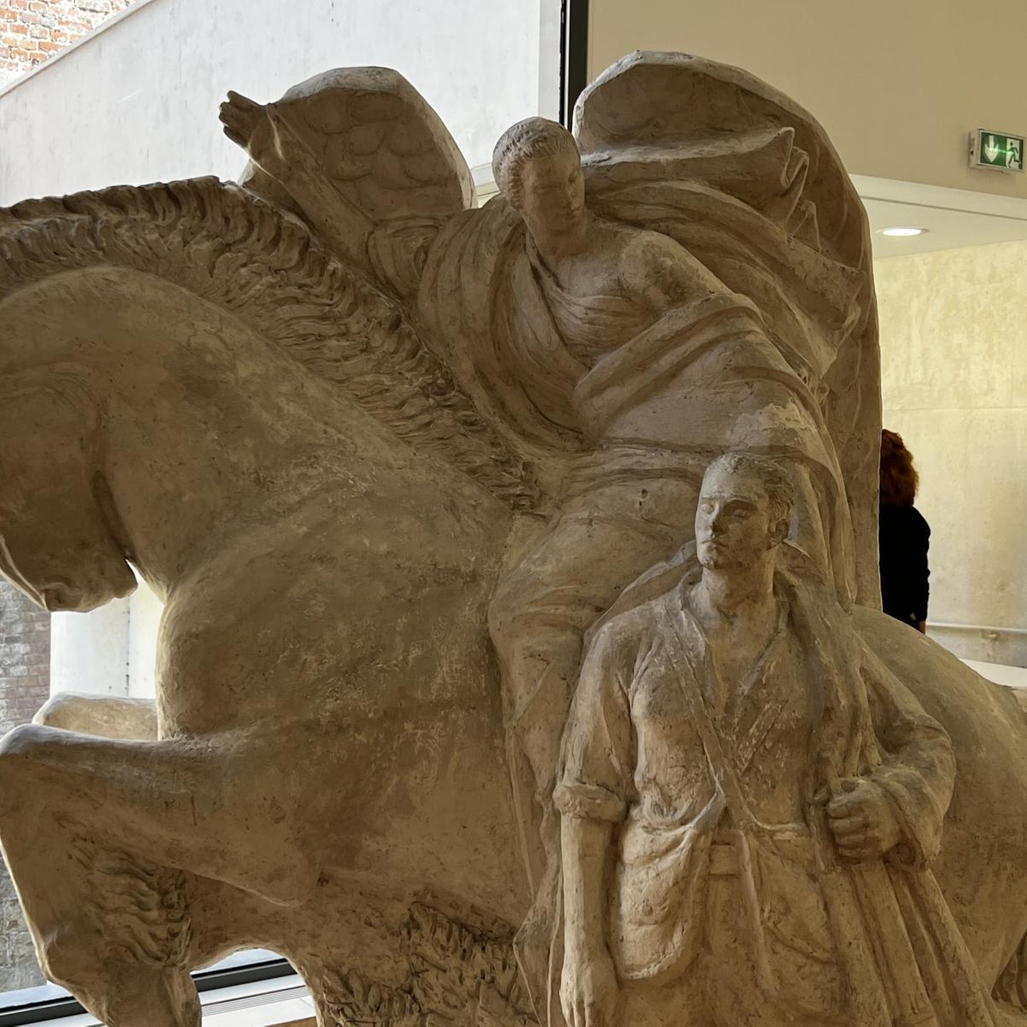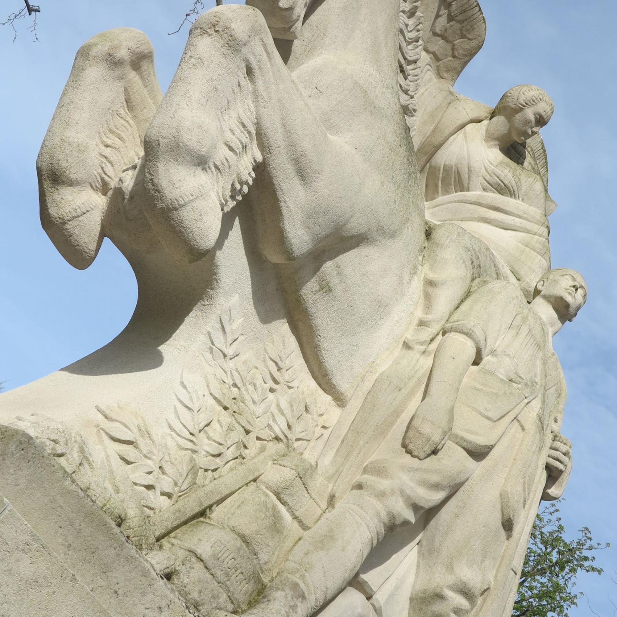 Au-dessus de lui, la victoire ailée chevauche l’animal qui semble sauter un obstacle. Le soldat, la victoire, le cheval par leur position sont unis dans un même élan.