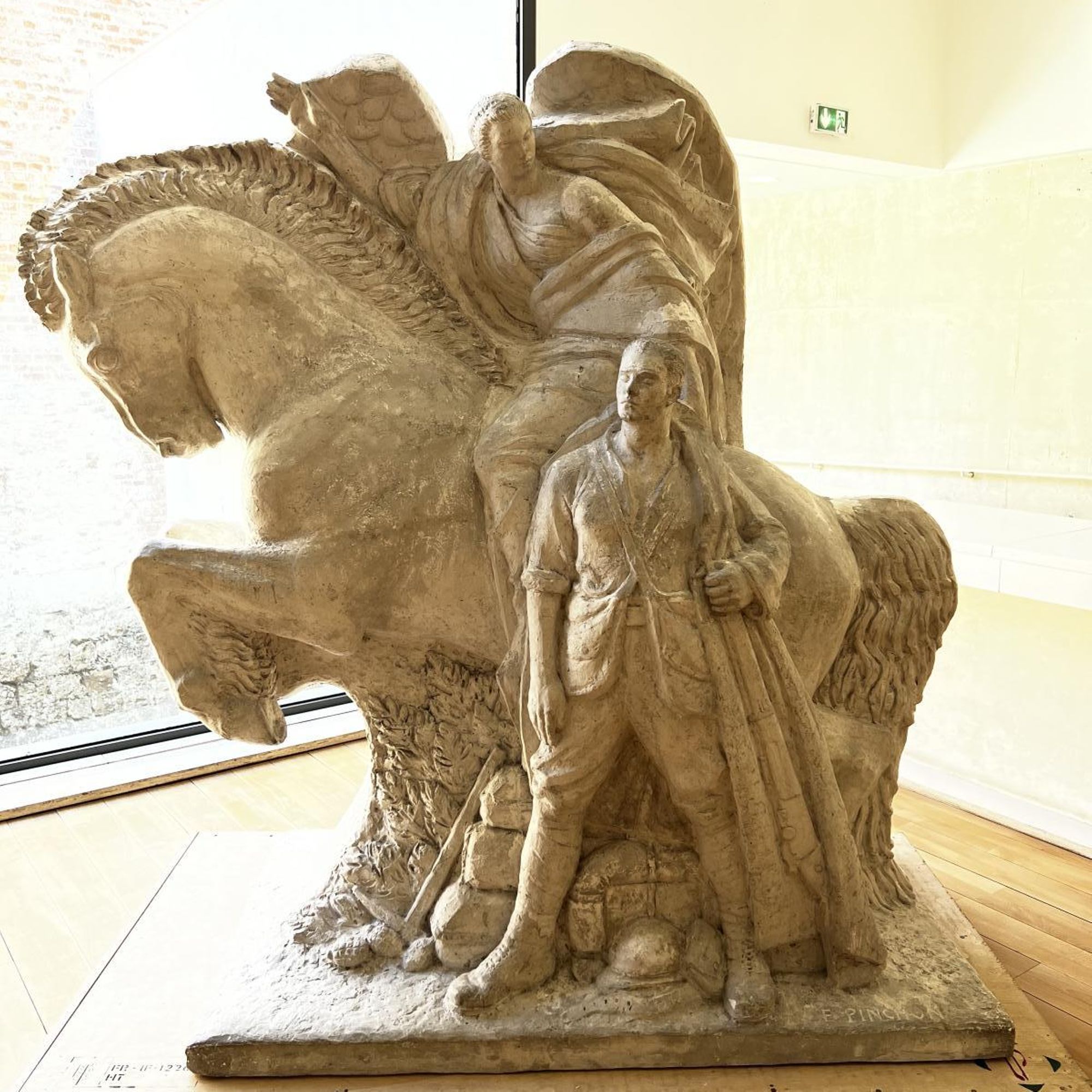 Dans cet ensemble apparaissent trois éléments : un cheval puissant, la victoire ailée et un soldat français debout.